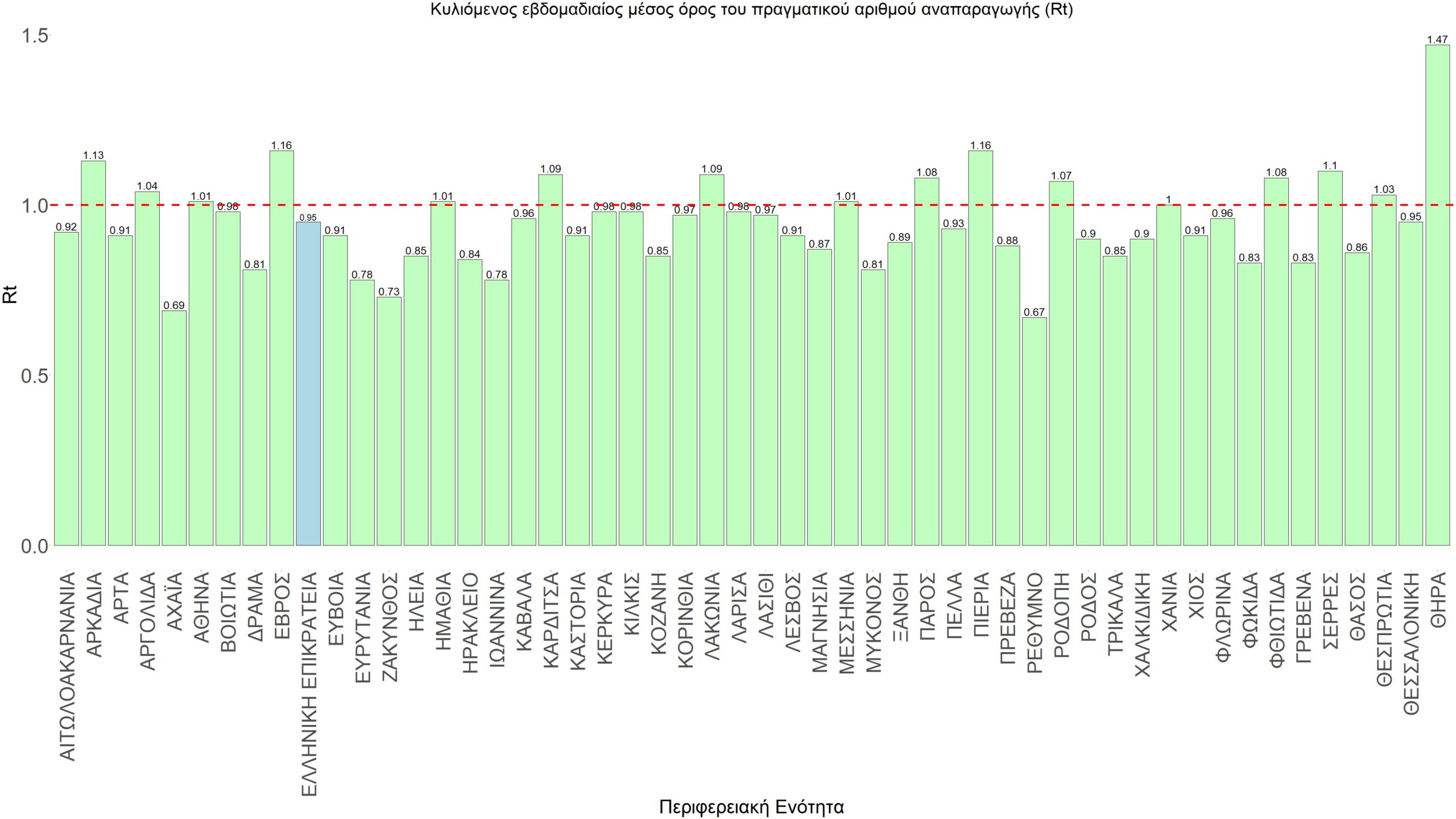 O πραγματικός αριθμός αναπαραγωγής Rt ανά περιφερειακή ενότητα της χώρας παρουσιάζεται στο Σχήμα 58.