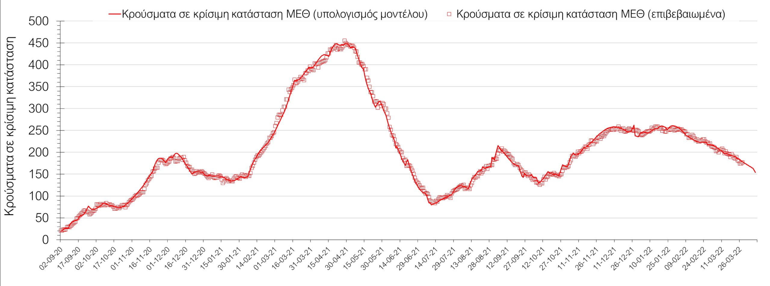 Σχήμα 1. Αριθμός κρουσμάτων σε κρίσιμη κατάσταση (ΜΕΘ) σύμφωνα με τα στοιχεία του ΕΟΔΥ και τις προβλέψεις της υπολογιστικής πλατφόρμας CORE.