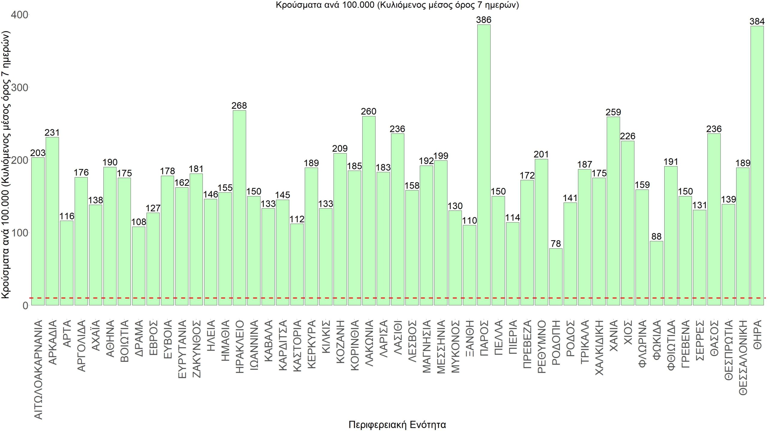 Σχήμα 60. Συγκεντρωτική εικόνα των νέων κρουσμάτων ανά 100.000 κατοίκους (κυλιόμενος μέσος όρος 7 ημερών) των επιμέρους περιοχών