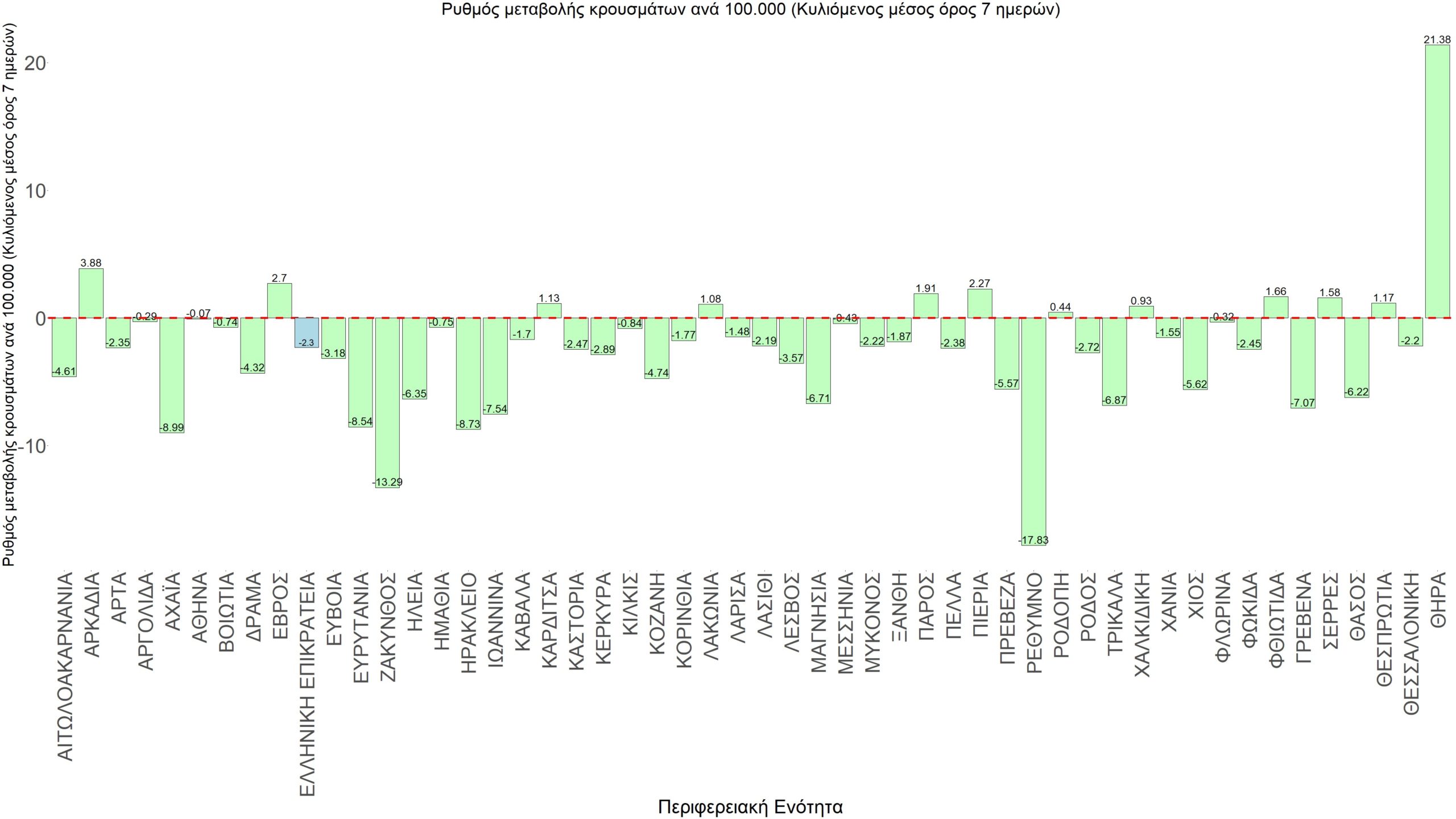 Η αποτύπωση των τάσεων στις επιμέρους περιοχές, παρουσιάζεται στο Σχήμα 61, όπου παρουσιάζεται ο ρυθμός μεταβολής των νέων κρουσμάτων ανά 100.000 κατοίκους (κυλιόμενος μέσος όρος 7 ημερών) των επιμέρους περιοχών. Θετικές τιμές του ρυθμού μεταβολής υποδηλώνουν άνοδο, ενώ αρνητικές τιμές υποδηλώνουν πτωτική πορεία.