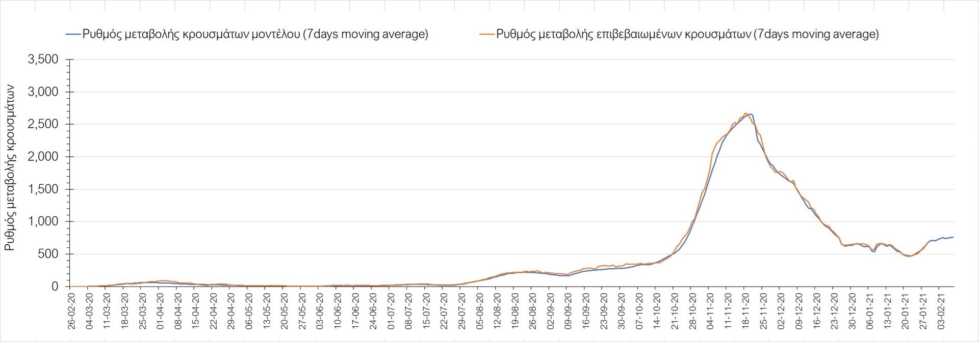 Πορεία του ημερησίου αριθμού των κρουσμάτων (κυλιόμενος μέσος όρος 7 ημερών) στην Ελληνική επικράτειαΗ αποκλιμάκωση που παρατηρείται στον αριθμό των ασθενών σε κρίσιμη κατάσταση (διασωληνωμένοι σε ΜΕΘ), καθώς και ο αριθμός των θανάτων συνάδουν που παρατηρήθηκαν την Παρασκευή συνάδουν με τις προσομοιώσεις του μοντέλου CORE για τον επόμενο μήνα, ενώ πλέον και ο αριθμός των νέων κρουσμάτων παραμένει ανησυχητικός, ιδιαίτερα για την Αττική, σημειώνουν στην έκθεσή τους.