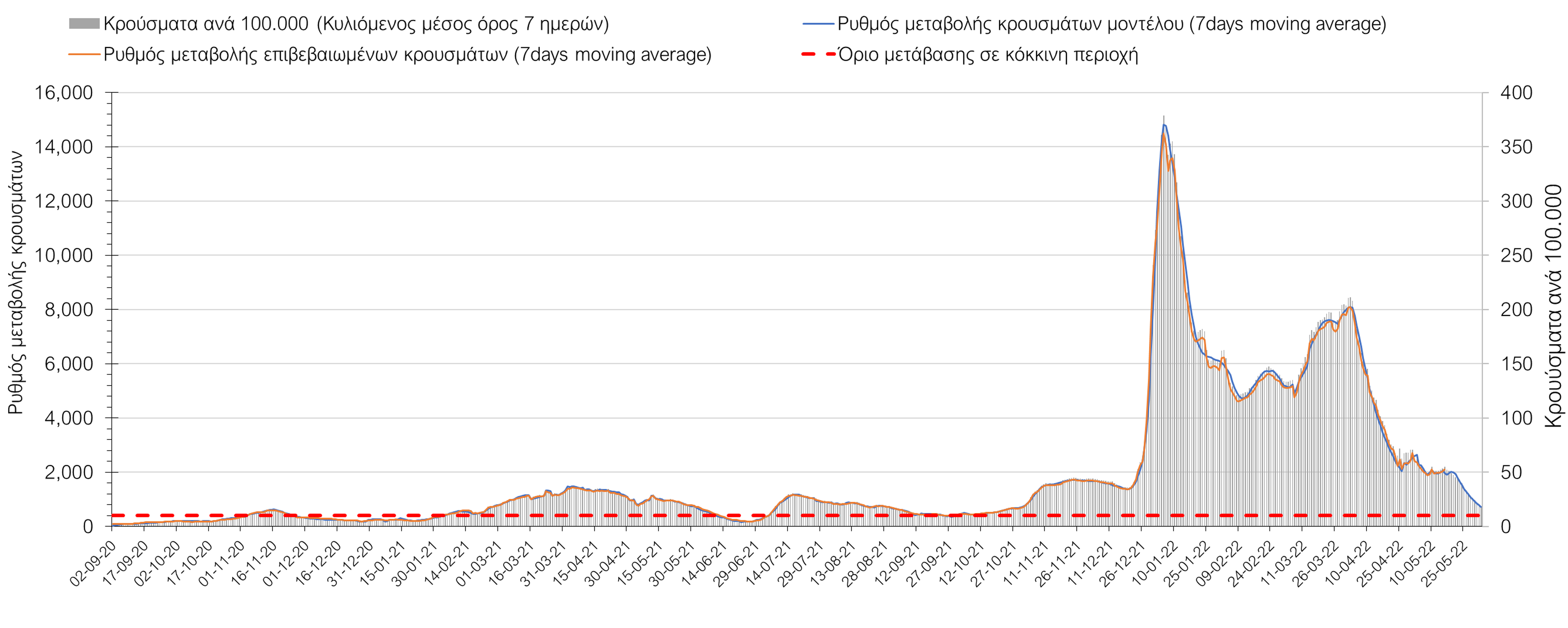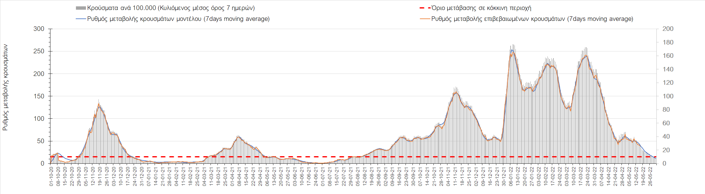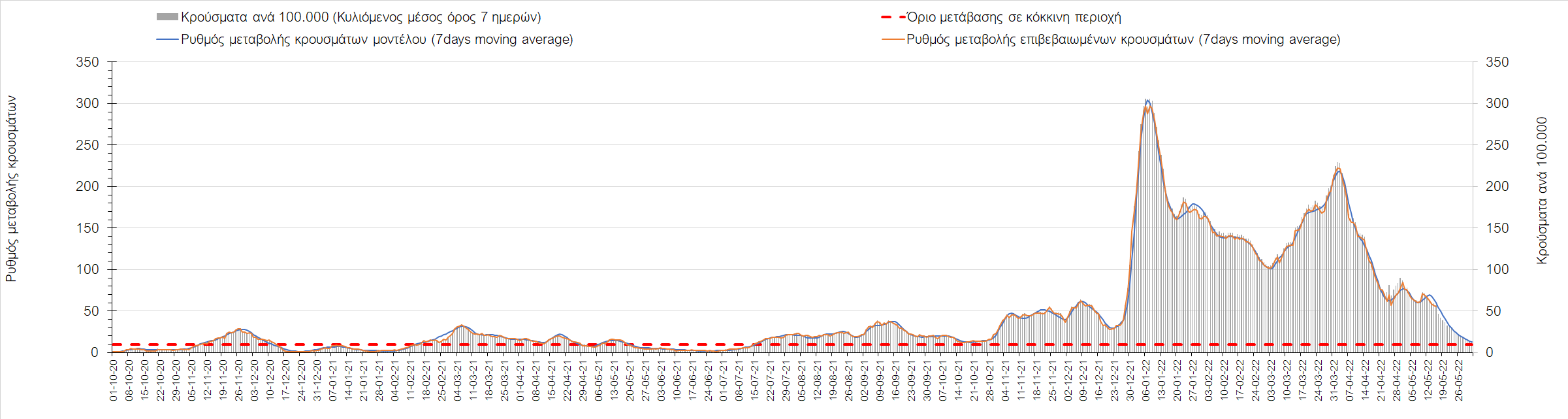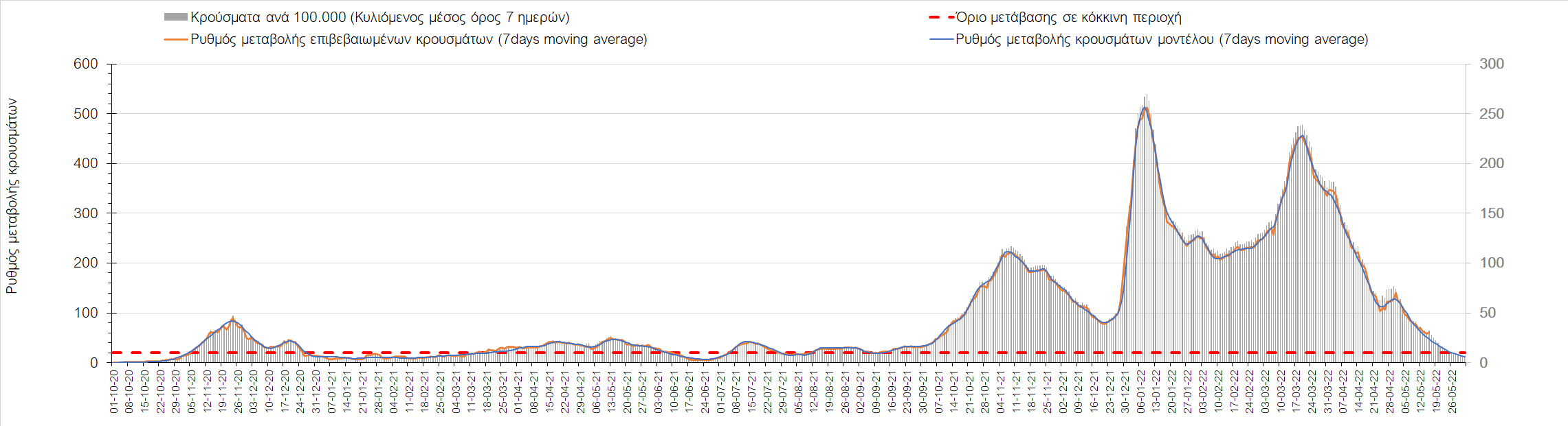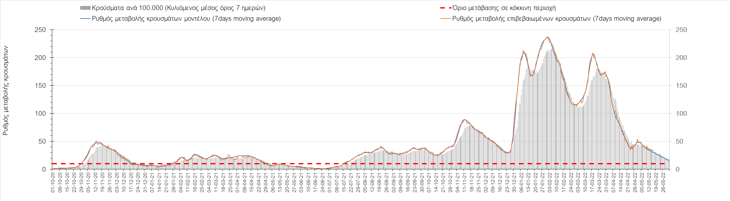 Ο αριθμός των κρουσμάτων που παρατηρείται, είναι σημαντικά υψηλότερος από αυτόν που αναμέναμε όταν ξεκίνησε η αποκλιμάκωση του 5ου κύματος και υποδηλώνει διαφυγή ανοσίας. O κυρίως λόγος που συμβαίνει αυτή η διαφυγή ανοσίας, είναι η καθυστέρηση της εφαρμογής της αναμνηστικής δόσης, με δεδομένη τη σημαντική διαφορά στην αποτελεσματικότητα προστασίας μεταξύ εμβολιασμένων με 2 δόσεις και με 3. Επίσης, σημαντική διαφυγή ανοσίας υπάρχει λόγω του αυξημένου ρυθμού επαναμολύνσεων ακόμα και σε σύντομο διάστημα από προηγούμενη μόλυνση, που αποτελεί χαρακτηριστικό του νέου υποστελέχους της Ο (Β.Α.2, ή παραλλαγή Ο-2), το οποίο εικάζεται ότι είναι ακόμη πιο μεταδοτικό από την παραλλαγή Ο κατά 33% μεσοσταθμικά. Συνεπώς, ο συνδυασμός επιβράδυνσης της 3ης δόσης και της παρουσίας του νέου στελέχους, οδήγησαν σε ένα νέο κύμα που έχει ήδη καθυστερήσει επιπλέον την ταχύτερη αποκλιμάκωση. Πλέον, παρατηρούμε ότι επανερχόμαστε στην πτωτική πορεία, έχοντας ξεπεράσει την ανοδική διακύμανση που παρατηρήθηκε πριν 2 εβδομάδες λόγω των αυξημένων επαφών του Πάσχα και του τριημέρου της Πρωτομαγιάς.