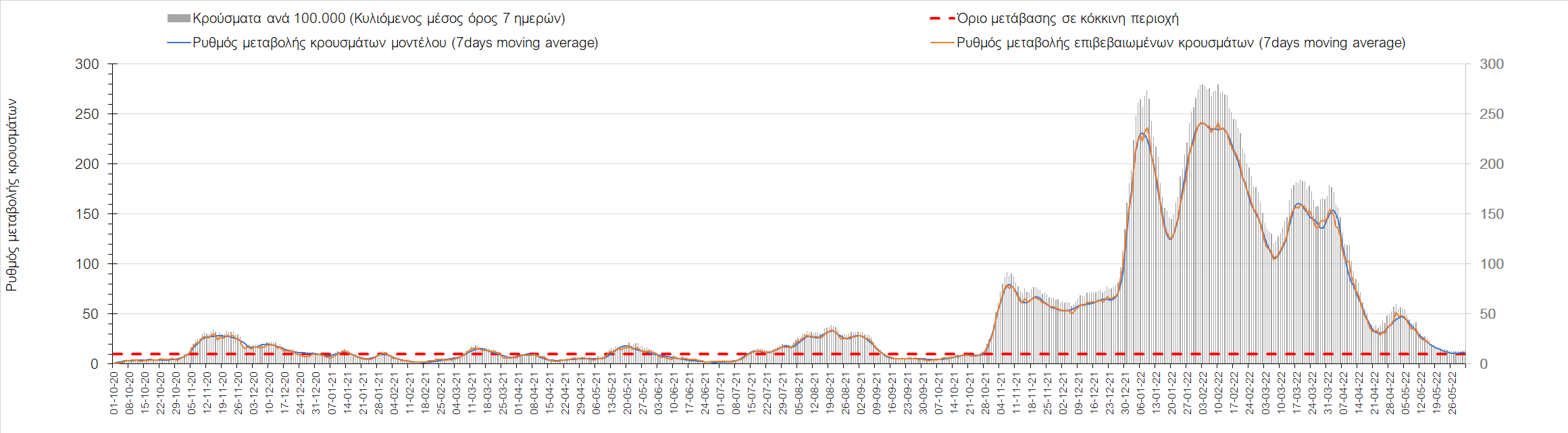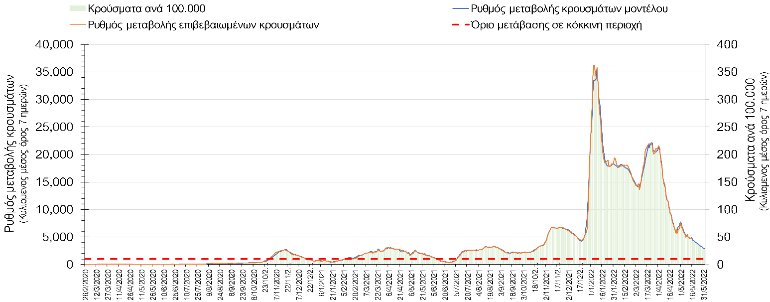 Η πτωτική πορεία των προηγούμενων τριών εβδομάδων είχε έχει δώσει τη θέση της σε προσωρινή αναστροφή, η οποία όμως τώρα έχει επανέλθει και αυτό αντικατοπτρίζεται και στον ημερήσιο αριθμό των κρουσμάτων (κυλιόμενος μέσος όρος 7 ημερών), ο οποίος αν και εμφανίζει οριακή άνοδο σε σχέση με την Κυριακή , πλέον βρίσκεται κάτω από τις 5000 (4.770). Όπως είχαμε προβλέψει, η πτωτική πορεία επανήλθε στις περισσότερες περιοχές την εβδομάδα που διανύσαμε, αλλά προβληματίζουν τόσο οι ανοδικές διακυμάνσεις σε επιμέρους περιοχές, όσο και η προσωρινή ανοδική διακύμανση στην Αττική. Για να επανέλθει η συστηματική αποκλιμάκωση της πανδημίας, πέρα από την εφαρμογή των μέτρων (σε συνδυασμό με την σημαντική συνειδητοποίηση εκ μέρους του πληθυσμού ότι χρειάζεται προσοχή και σύνεση για την αντιμετώπιση της διασποράς της παραλλαγής Ο), θα πρέπει να στοχεύσουμε στη διατήρηση και την επέκταση της επίκτητης ανοσίας του πληθυσμού, αλλά και στον μεγάλο αριθμό των τεστ συνολικά (μοριακά, rapid και self-test) που πραγματοποιούνται καθημερινά. Για αυτό το λόγο και με δεδομένη τη μεγάλη διασπορά στα σχολεία θεωρούμε πρόωρη την κατάργηση των self-test στα παιδιά σχολικής ηλικίας με την επιστροφή τους μετά την Πρωτομαγιά, ειδικά σε συνδυασμό με την ανοδική διακύμανση που παρατηρήθηκε.