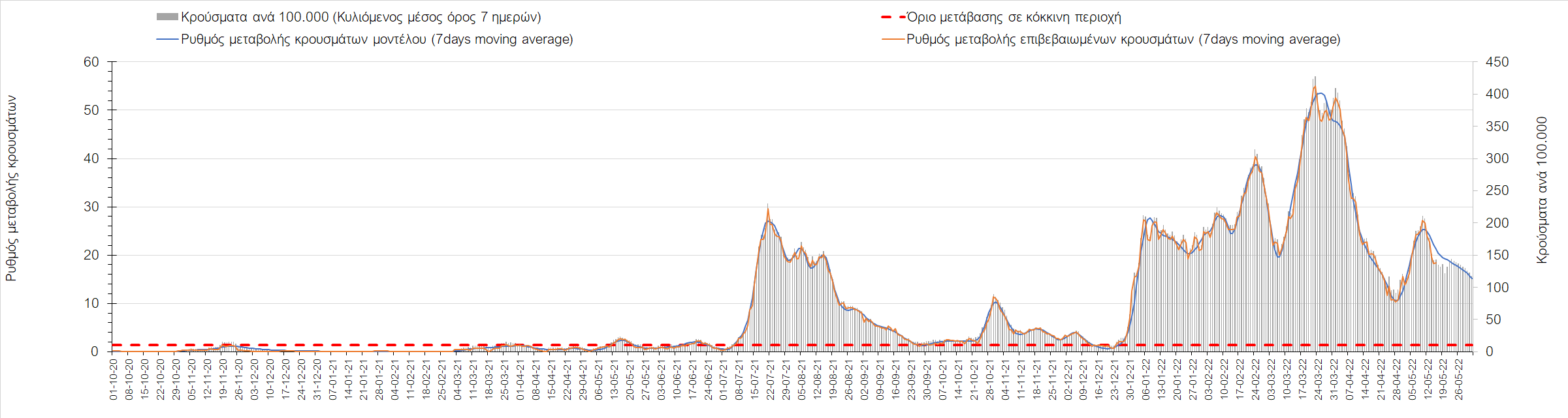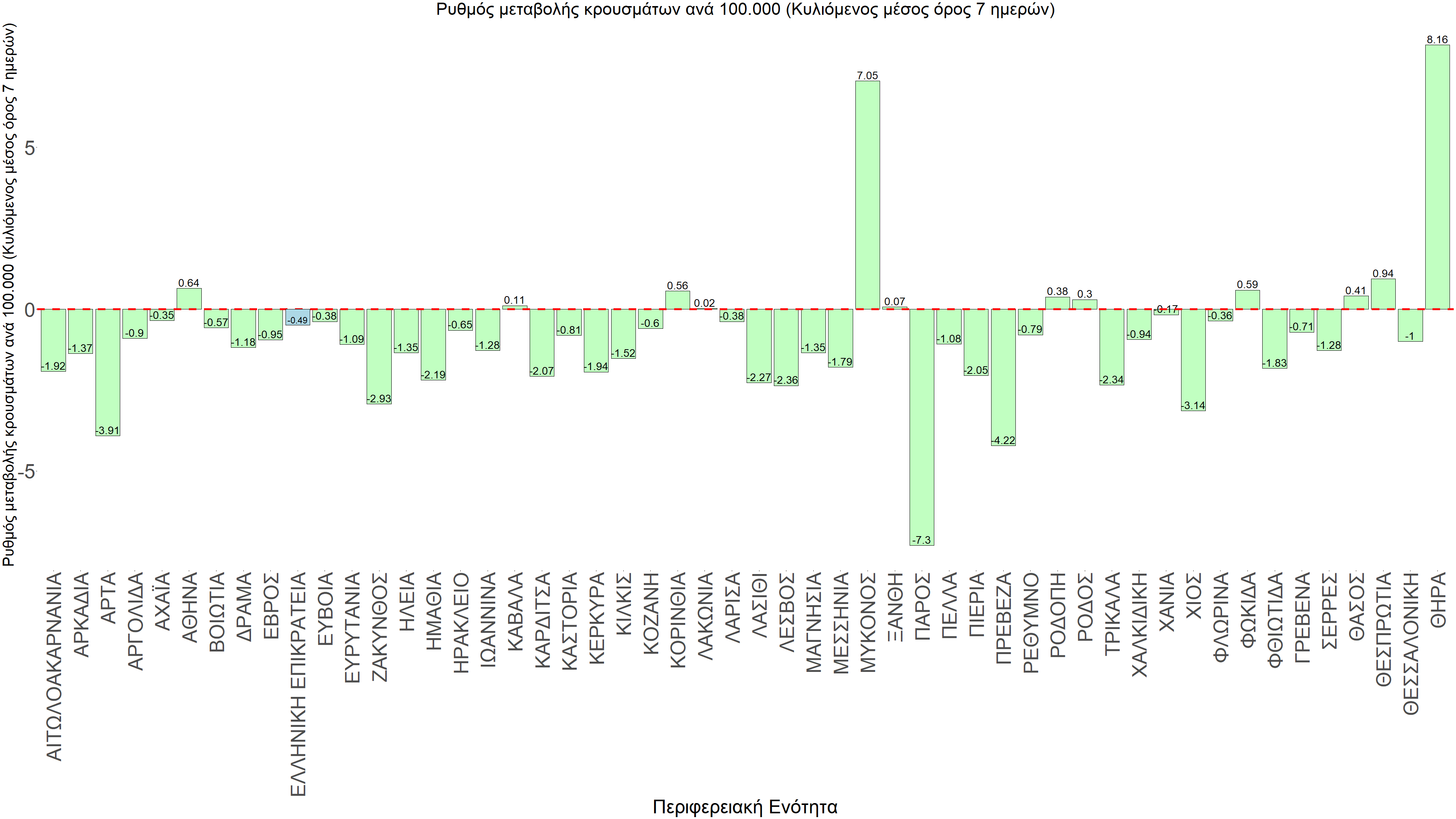 Η αποτύπωση των τάσεων στις επιμέρους περιοχές, παρουσιάζεται στο Σχήμα 61, όπου παρουσιάζεται ο ρυθμός μεταβολής των νέων κρουσμάτων ανά 100.000 κατοίκους (κυλιόμενος μέσος όρος 7 ημερών) των επιμέρους περιοχών. Θετικές τιμές του ρυθμού μεταβολής υποδηλώνουν άνοδο, ενώ αρνητικές τιμές υποδηλώνουν πτωτική πορεία.