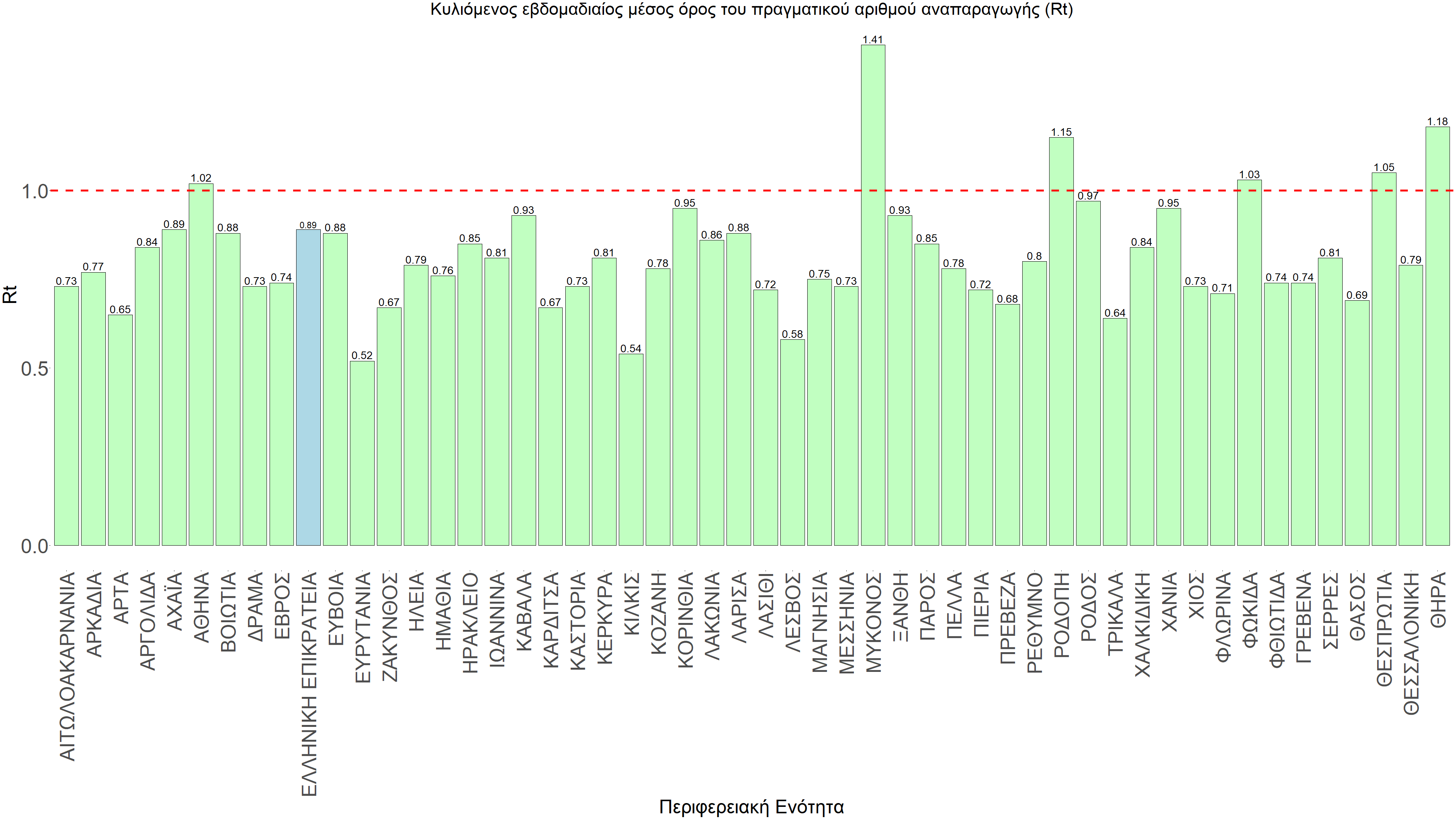 O πραγματικός αριθμός αναπαραγωγής Rt ανά περιφερειακή ενότητα της χώρας παρουσιάζεται στο Σχήμα 58.