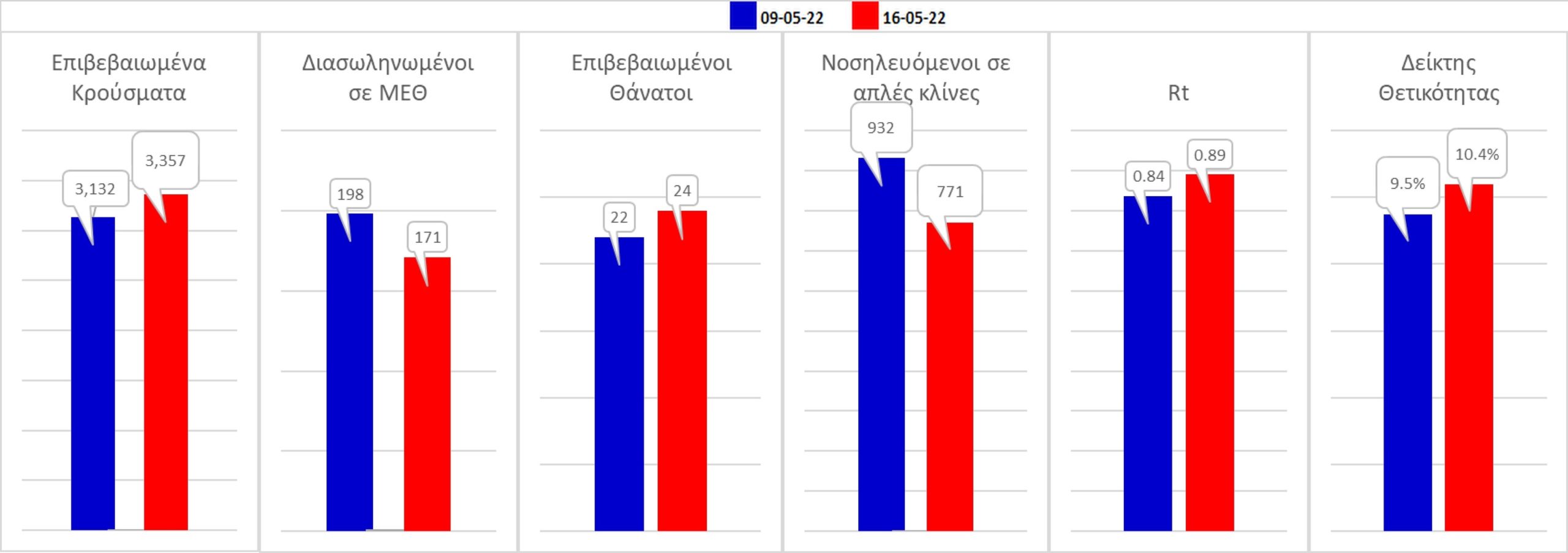 Σχήμα 59. Συγκριτικά αποτελέσματα της επιδημιολογικής εικόνας της Δευτέρας (16/05/2022) σε σχέση με την προηγούμενη (09/05/2022)