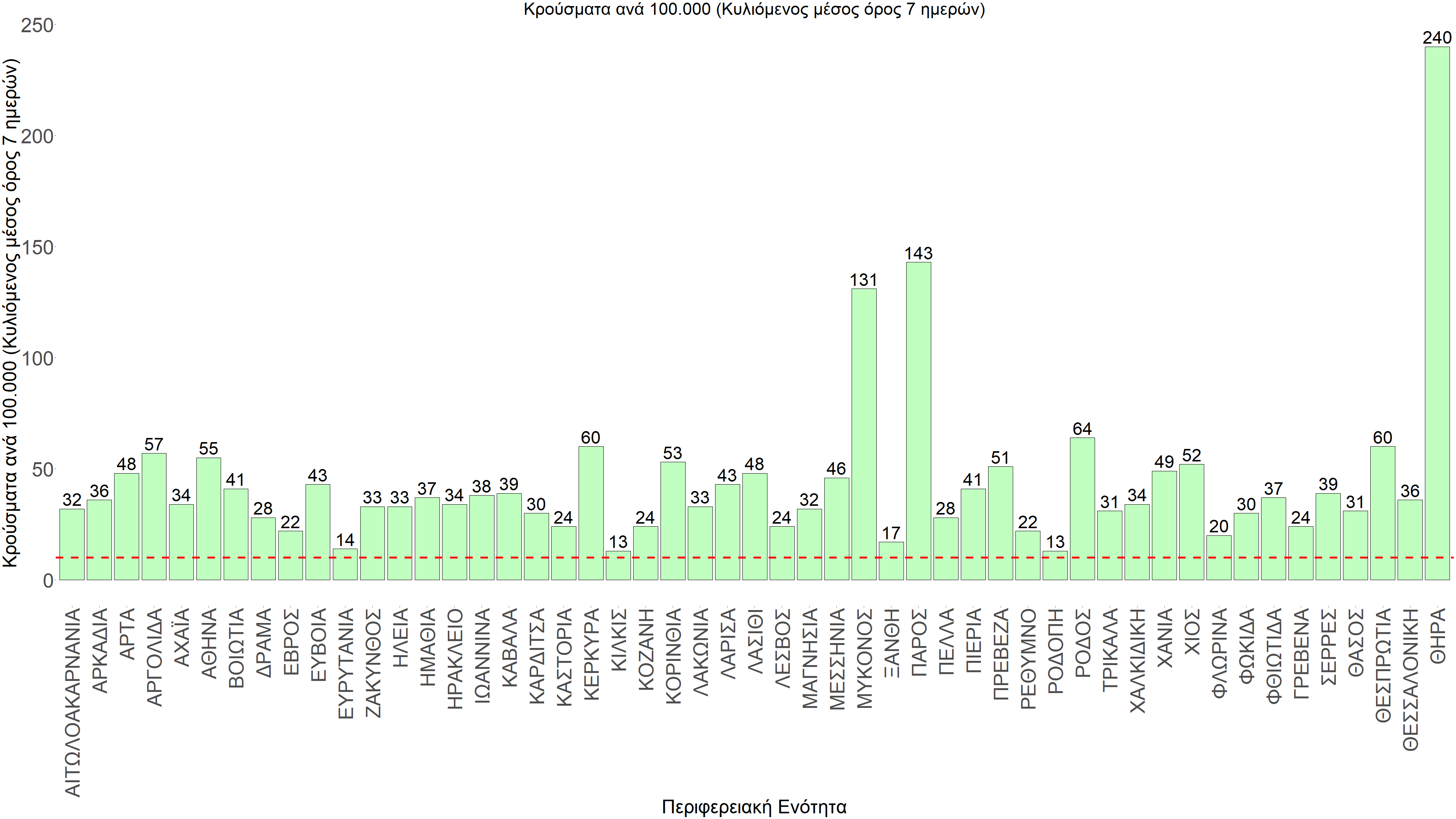 Σχήμα 60. Συγκεντρωτική εικόνα των νέων κρουσμάτων ανά 100.000 κατοίκους (κυλιόμενος μέσος όρος 7 ημερών) των επιμέρους περιοχών