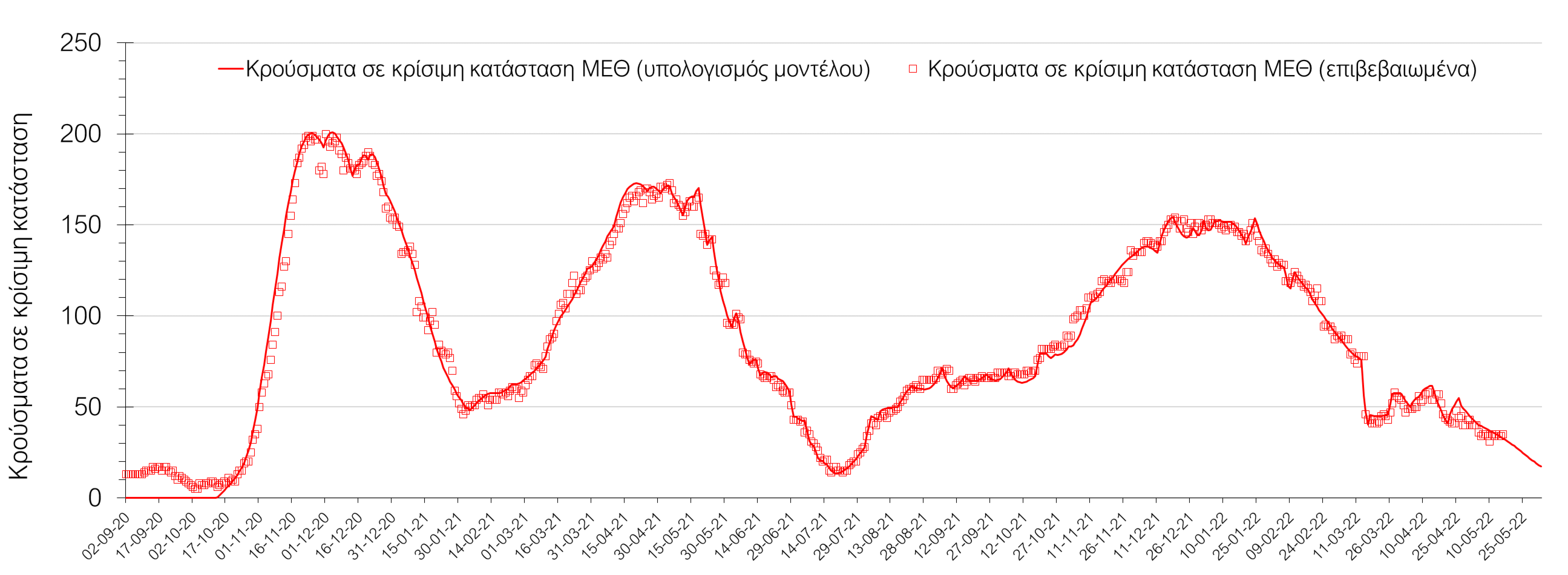 Η πορεία της μέσης εβδομαδιαίας τιμής των κρουσμάτων, καθώς και του κυλιόμενου μέσου όρου 7 ημερών του αριθμού των κρουσμάτων ανά 100.000 πληθυσμού, όπως έχουν καταγραφεί από τον ΕΟΔΥ και η αναμενόμενη πορεία τους, όπως προδιαγράφεται από την υπολογιστική πλατφόρμα CORE για την Ελληνική επικράτεια (όπως και στην Αττική και τη Θεσσαλονίκη) μέχρι τις 31 Μαΐου, αποτυπώνονται στο Σχήμα 4. Αυτή η προβλεπόμενη πορεία, που αφορά τα κρούσματα, τους νοσηλευόμενους σε απλές κλίνες, όσο και σε ΜΕΘ, καθώς επίσης και τους θανάτους, βασίζεται στις ακόλουθες παραδοχές: