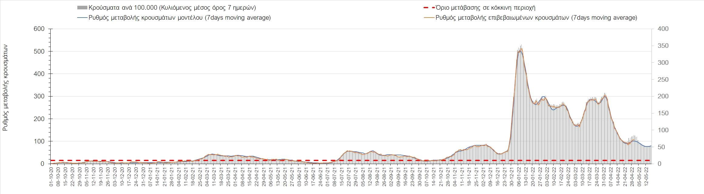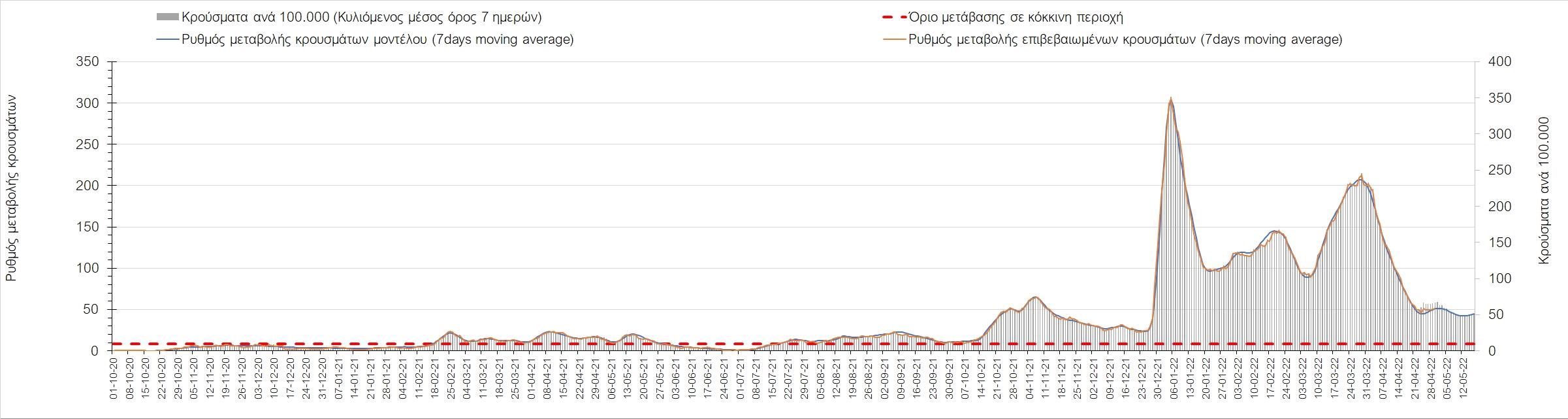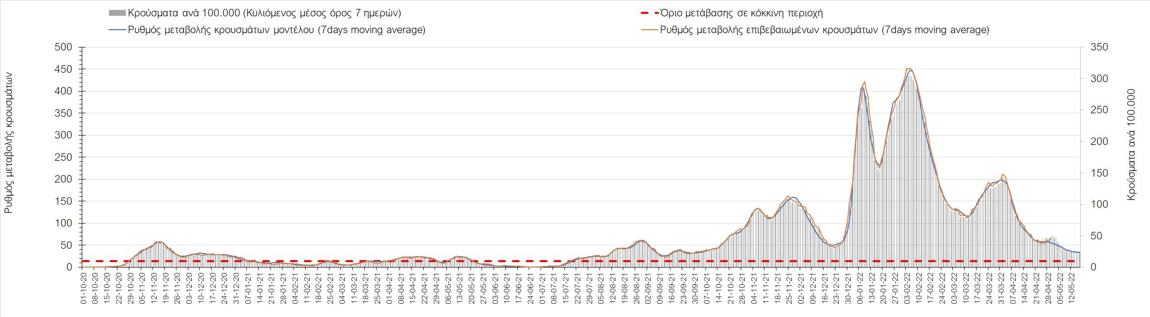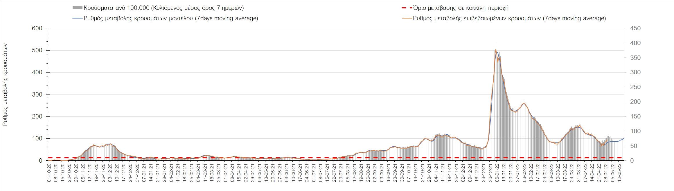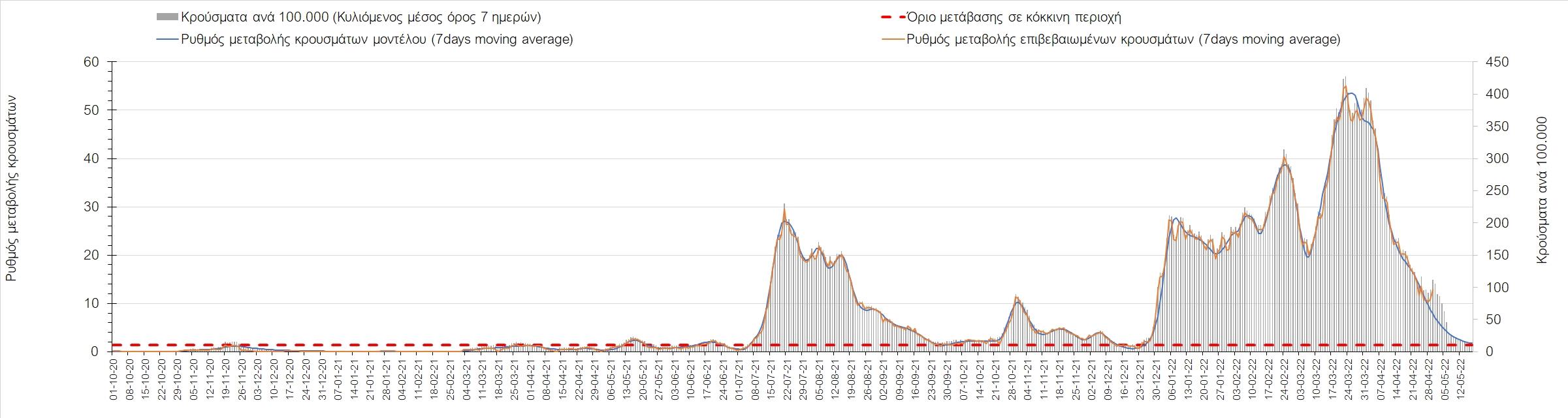 Η πτωτική πορεία των προηγούμενων δύο εβδομάδων έχει δώσει τη θέση της σε προσωρινή αναστροφή και αυτό αντικατοπτρίζεται και στον ημερήσιο αριθμό των κρουσμάτων (κυλιόμενος μέσος όρος 7 ημερών), ο οποίος εμφανίζει αύξηση σε σχέση με την Παρασκευή και πλησιάζει τις 6.500 (6.775). Παρόλο που δεν αναμένεται να έχει διάρκεια μεγαλύτερη από 4-5 ημέρες, για να επανέλθει η συστηματική αποκλιμάκωση της πανδημίας, πέρα από την εφαρμογή των μέτρων (σε συνδυασμό με την σημαντική συνειδητοποίηση εκ μέρους του πληθυσμού ότι χρειάζεται προσοχή και σύνεση για την αντιμετώπιση της διασποράς της παραλλαγής Ο), θα πρέπει να στοχεύσουμε στη διατήρηση και την επέκταση της επίκτητης ανοσίας του πληθυσμού, αλλά και στον μεγάλο αριθμό των τεστ συνολικά (μοριακά, rapid και self-test) που πραγματοποιούνται καθημερινά. Για αυτό το λόγο και με δεδομένη τη μεγάλη διασπορά στα σχολεία θεωρούμε πρόωρη την κατάργηση των self-test στα παιδιά σχολικής ηλικίας με την επιστροφή τους μετά την Πρωτομαγιά, ειδικά σε συνδυασμό με την ανοδική διακύμανση που παρατηρείται.