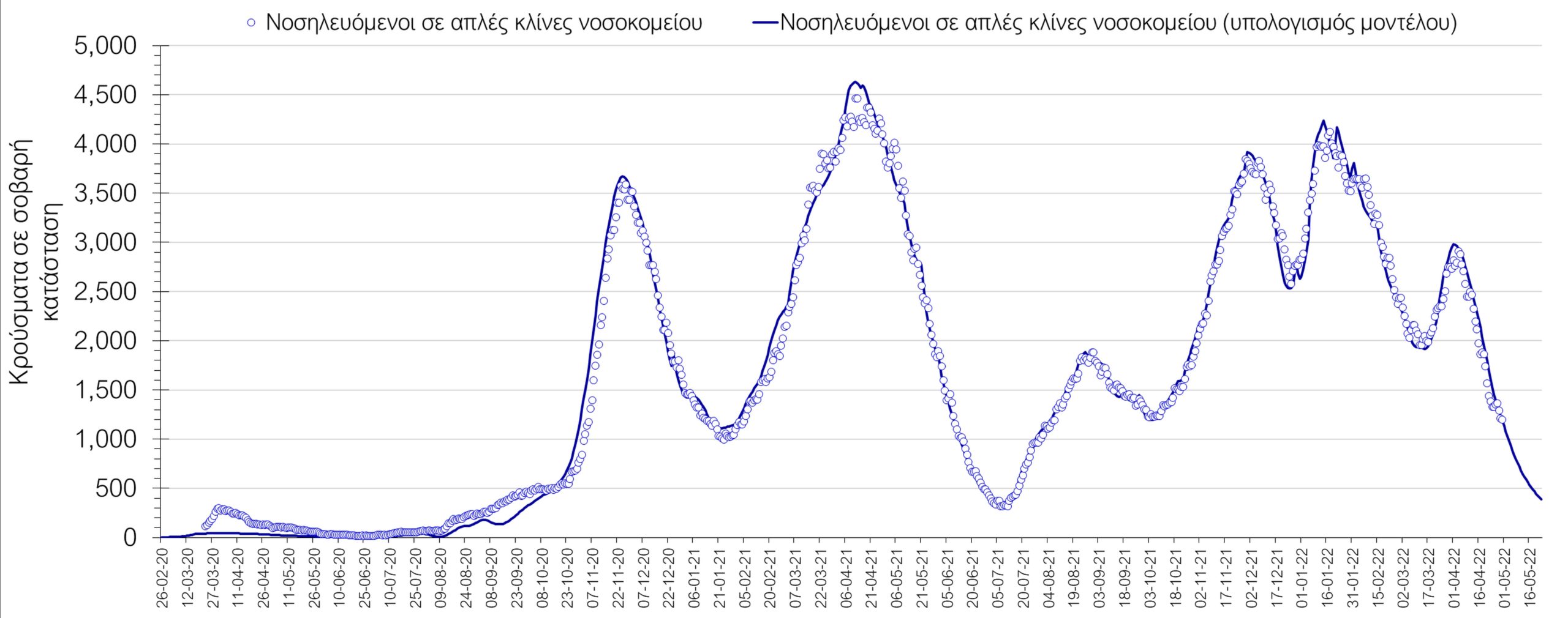 Σχήμα 2. Αριθμός κρουσμάτων σε σοβαρή κατάσταση (νοσηλευόμενοι σε απλές κλίνες) σύμφωνα με τα στοιχεία του ΕΟΔΥ και τις προβλέψεις της υπολογιστικής πλατφόρμας CORE.