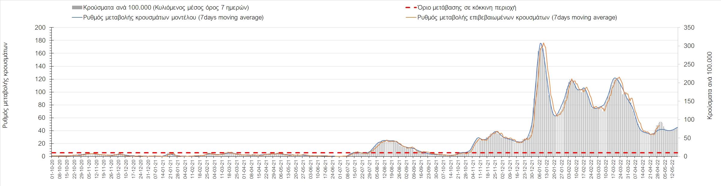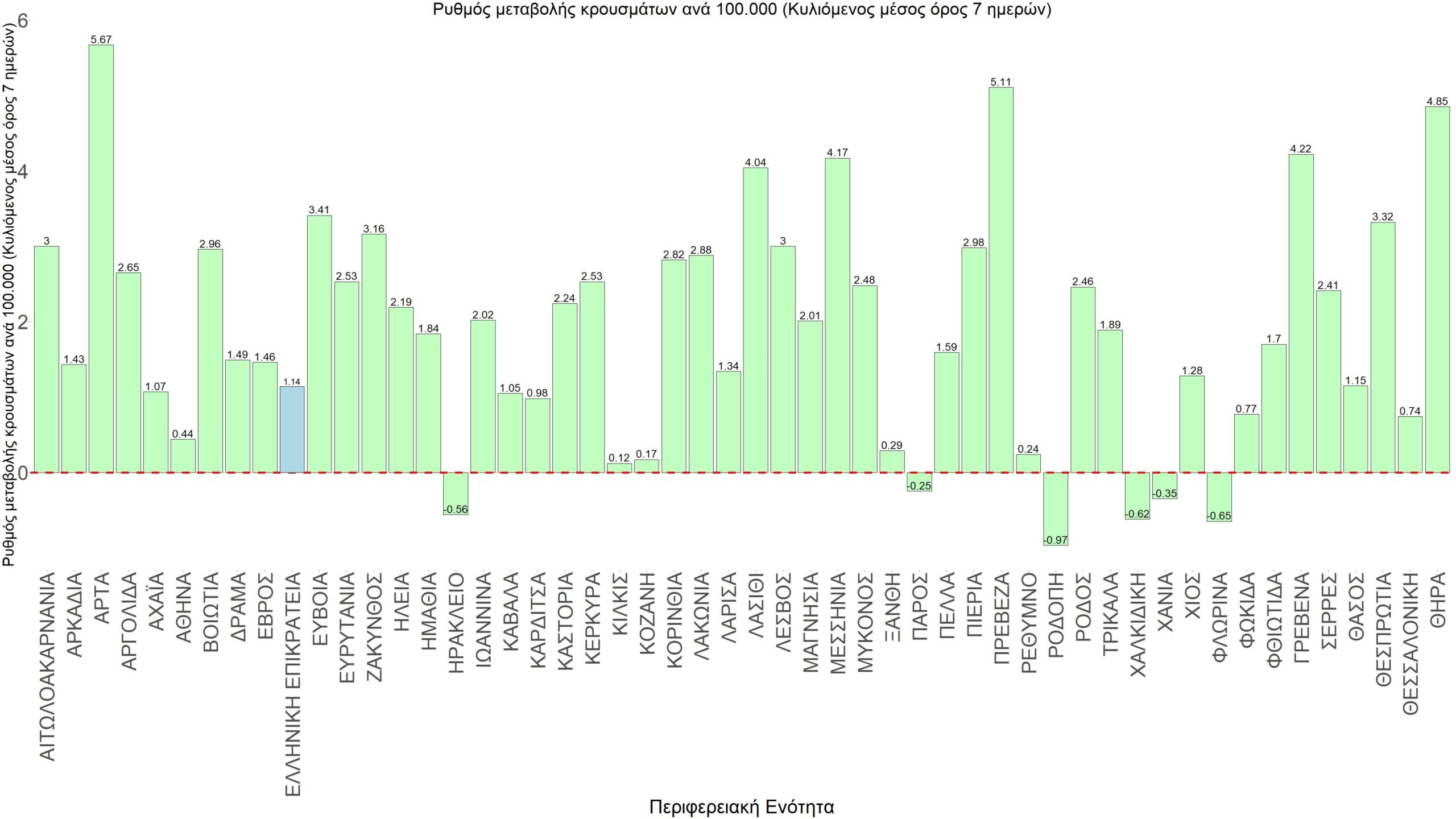 Η αποτύπωση των τάσεων στις επιμέρους περιοχές, παρουσιάζεται στο Σχήμα 61, όπου παρουσιάζεται ο ρυθμός μεταβολής των νέων κρουσμάτων ανά 100.000 κατοίκους (κυλιόμενος μέσος όρος 7 ημερών) των επιμέρους περιοχών. Θετικές τιμές του ρυθμού μεταβολής υποδηλώνουν άνοδο, ενώ αρνητικές τιμές υποδηλώνουν πτωτική πορεία.