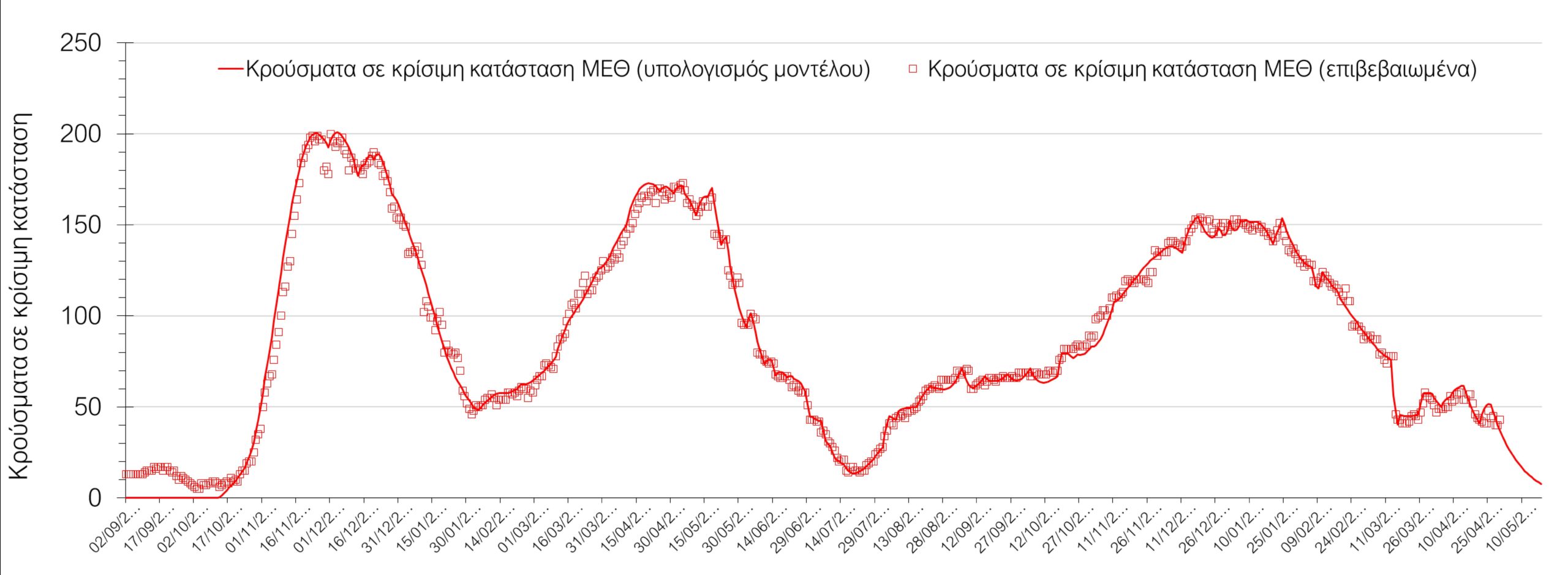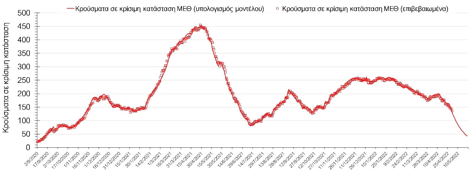 Η πορεία της μέσης εβδομαδιαίας τιμής των κρουσμάτων, καθώς και του κυλιόμενου μέσου όρου 7 ημερών του αριθμού των κρουσμάτων ανά 100.000 πληθυσμού, όπως έχουν καταγραφεί από τον ΕΟΔΥ και η αναμενόμενη πορεία τους, όπως προδιαγράφεται από την υπολογιστική πλατφόρμα CORE για την Ελληνική επικράτεια (όπως και στην Αττική και τη Θεσσαλονίκη) μέχρι τις 15 Μαΐου, αποτυπώνονται στο Σχήμα 4. Αυτή η προβλεπόμενη πορεία, που αφορά τα κρούσματα, τους νοσηλευόμενους σε απλές κλίνες, όσο και σε ΜΕΘ, καθώς επίσης και τους θανάτους, βασίζεται στις ακόλουθες παραδοχές:
