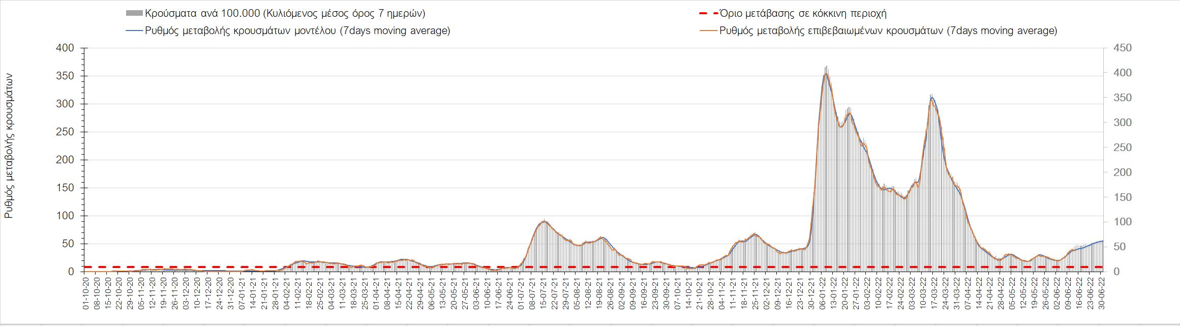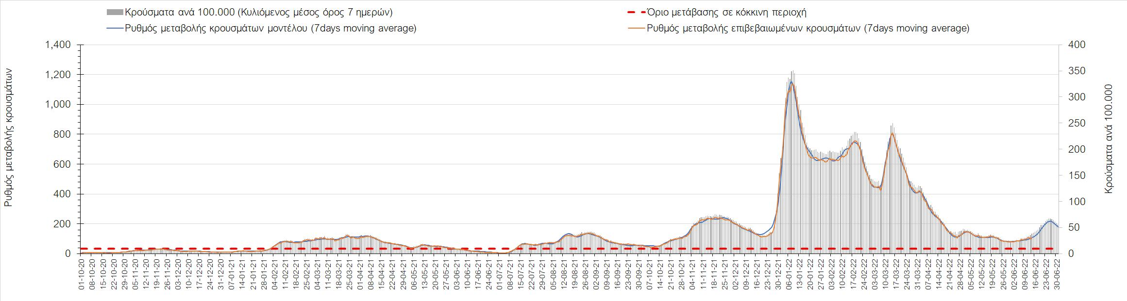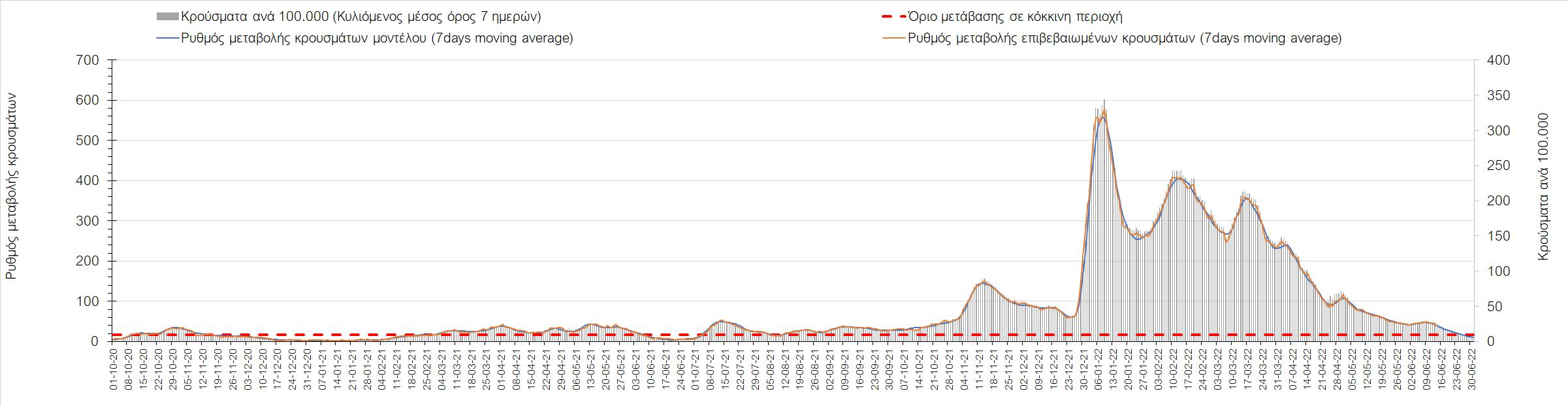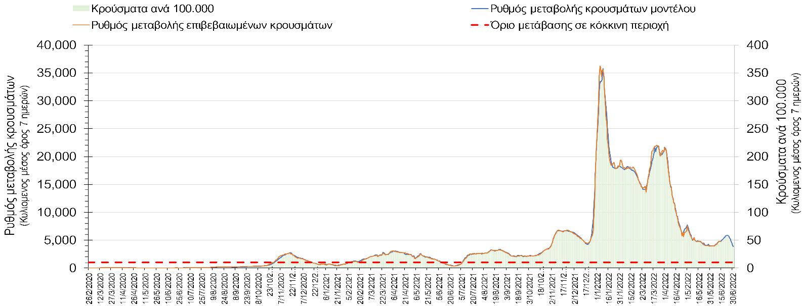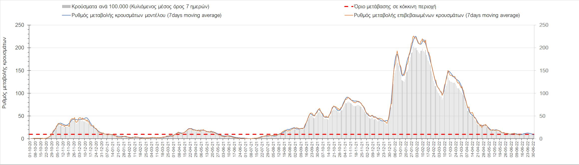 Στο σύνολο της χώρας η πορεία είναι ήπια ανοδική, και αντικατοπτρίζεται και στον ημερήσιο αριθμό των κρουσμάτων (κυλιόμενος μέσος όρος 7 ημερών), ο οποίος εμφανίζει άνοδο σε σχέση με την Κυριακή, και πλέον οδεύει προς τις 5000 (4.784). Για να επανέλθει η συστηματική αποκλιμάκωση της πανδημίας, πέρα από την εφαρμογή των μέτρων (σε συνδυασμό με την σημαντική συνειδητοποίηση εκ μέρους του πληθυσμού ότι χρειάζεται προσοχή και σύνεση για την αντιμετώπιση της διασποράς της παραλλαγής Ο), θα πρέπει να στοχεύσουμε στη διατήρηση και την επέκταση της επίκτητης ανοσίας του πληθυσμού, αλλά και στον μεγάλο αριθμό των τεστ συνολικά (μοριακά, rapid και self-test) που πραγματοποιούνται καθημερινά. Για αυτό το λόγο και με δεδομένη τη μεγάλη διασπορά στα σχολεία θεωρούμε πρόωρη την κατάργηση των self-test στα παιδιά σχολικής ηλικίας, ειδικά σε συνδυασμό με την ανοδική διακύμανση που παρατηρήθηκε.