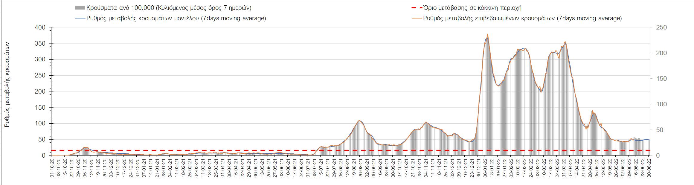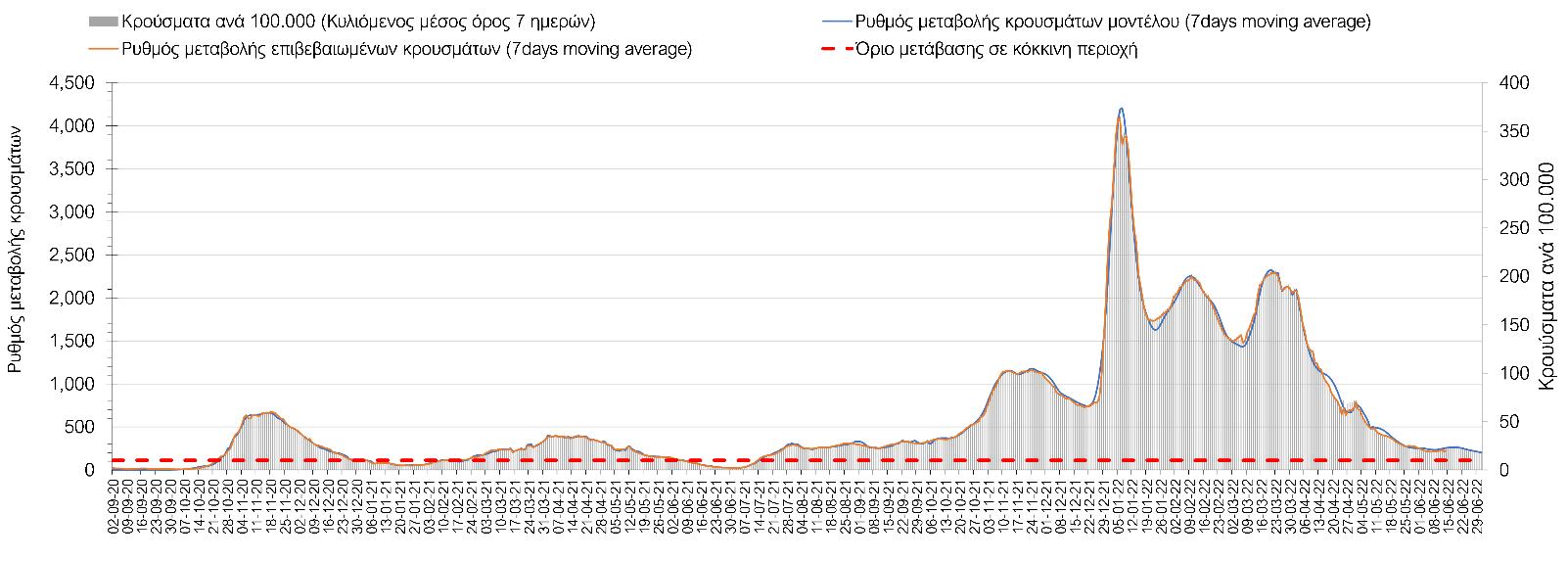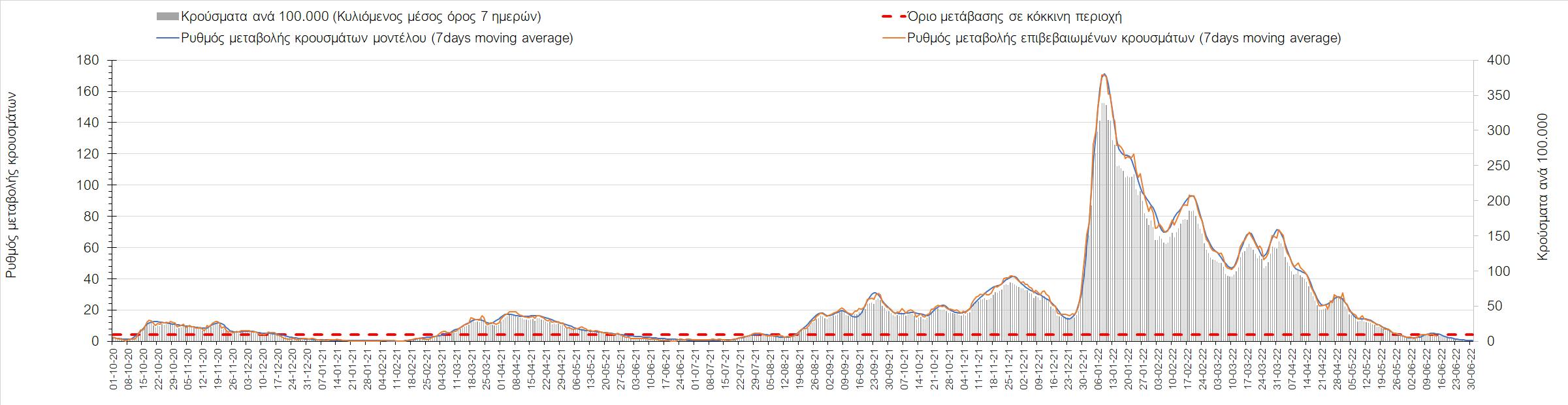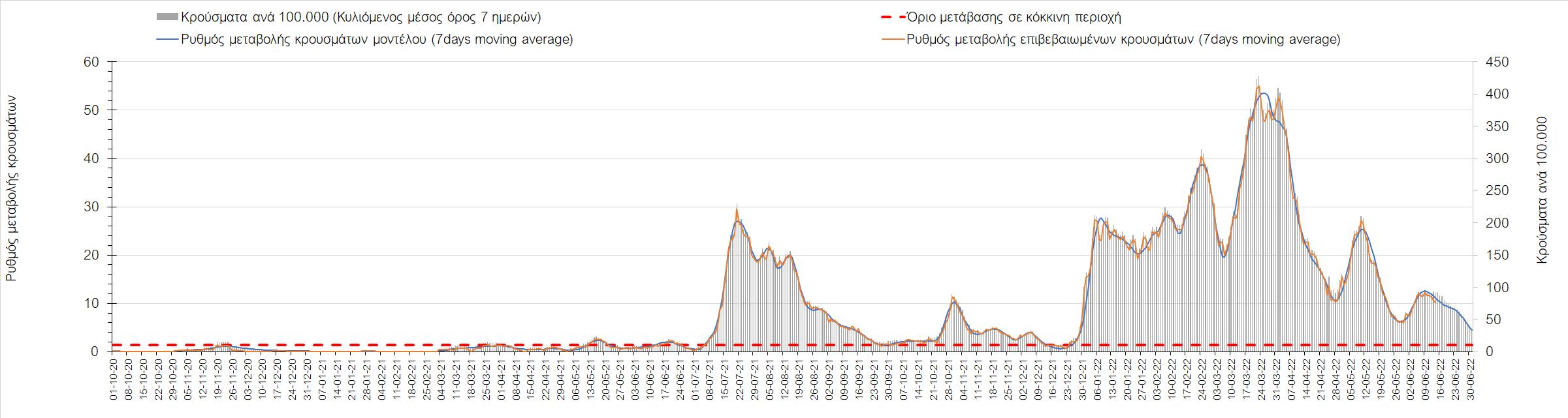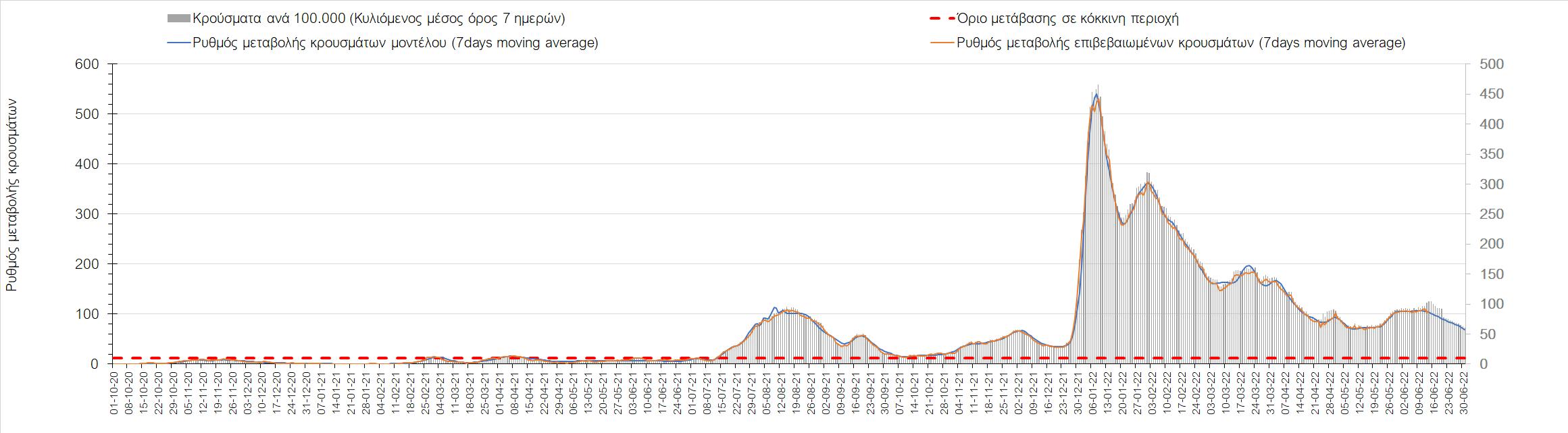 Στο σύνολο της χώρας η πορεία είναι ήπια ανοδική, και αντικατοπτρίζεται και στον ημερήσιο αριθμό των κρουσμάτων (κυλιόμενος μέσος όρος 7 ημερών), ο οποίος εμφανίζει άνοδο σε σχέση με την Κυριακή, και πλέον οδεύει προς τις 5000 (4.784). Για να επανέλθει η συστηματική αποκλιμάκωση της πανδημίας, πέρα από την εφαρμογή των μέτρων (σε συνδυασμό με την σημαντική συνειδητοποίηση εκ μέρους του πληθυσμού ότι χρειάζεται προσοχή και σύνεση για την αντιμετώπιση της διασποράς της παραλλαγής Ο), θα πρέπει να στοχεύσουμε στη διατήρηση και την επέκταση της επίκτητης ανοσίας του πληθυσμού, αλλά και στον μεγάλο αριθμό των τεστ συνολικά (μοριακά, rapid και self-test) που πραγματοποιούνται καθημερινά. Για αυτό το λόγο και με δεδομένη τη μεγάλη διασπορά στα σχολεία θεωρούμε πρόωρη την κατάργηση των self-test στα παιδιά σχολικής ηλικίας, ειδικά σε συνδυασμό με την ανοδική διακύμανση που παρατηρήθηκε.