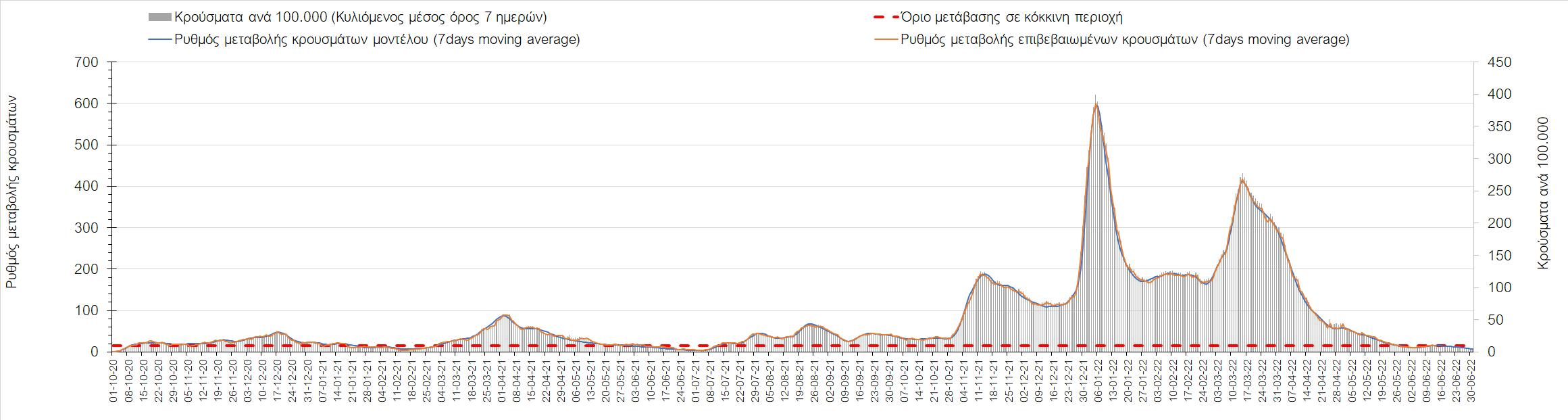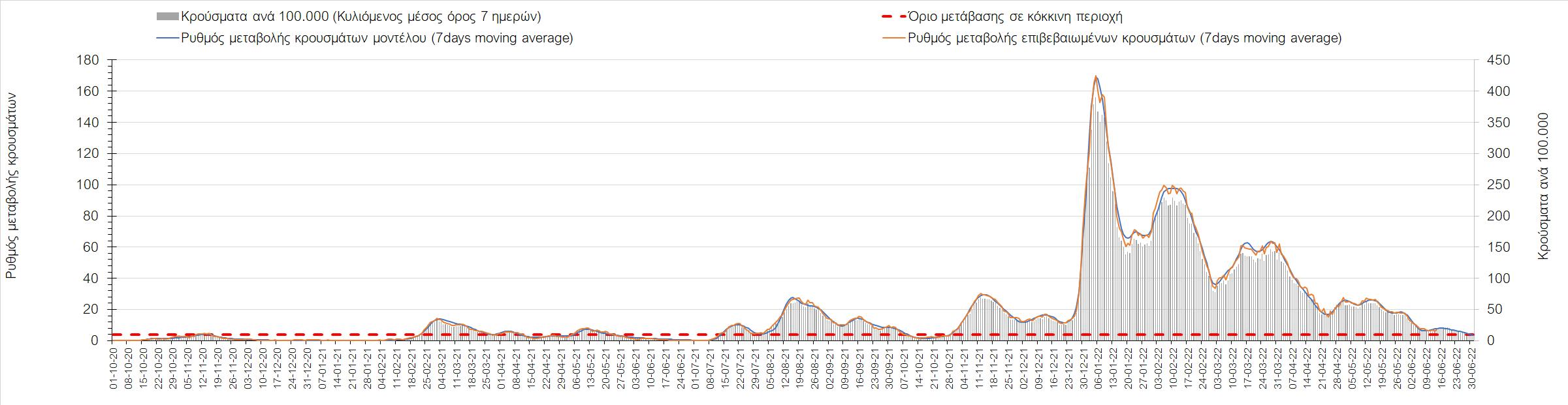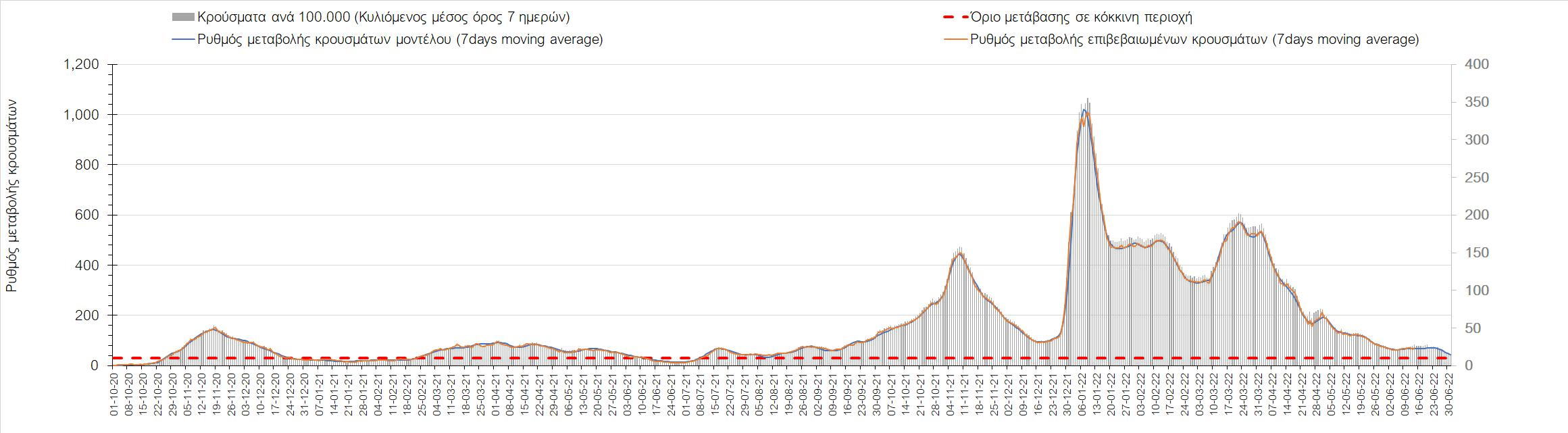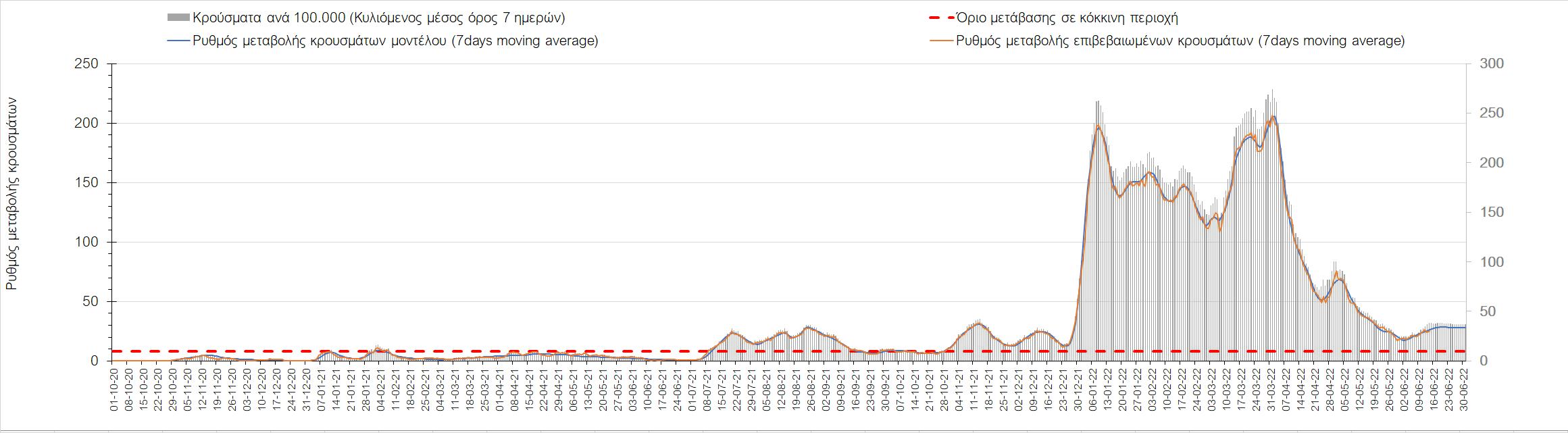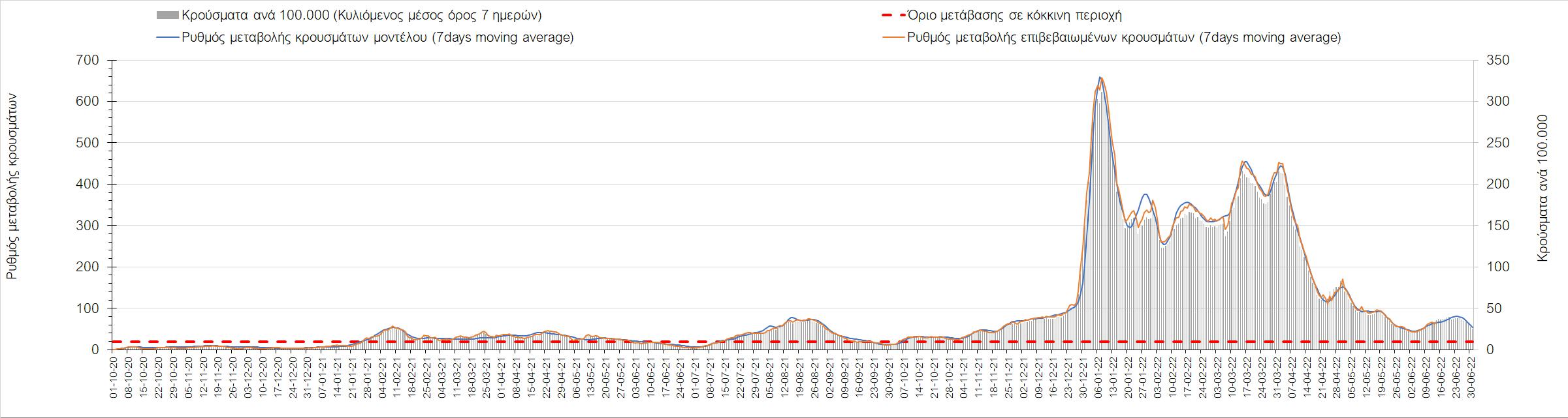 Στο σύνολο της χώρας η πορεία είναι ήπια ανοδική, και αντικατοπτρίζεται και στον ημερήσιο αριθμό των κρουσμάτων (κυλιόμενος μέσος όρος 7 ημερών), ο οποίος εμφανίζει άνοδο σε σχέση με την Κυριακή, και πλέον οδεύει προς τις 5000 (4.784). Για να επανέλθει η συστηματική αποκλιμάκωση της πανδημίας, πέρα από την εφαρμογή των μέτρων (σε συνδυασμό με την σημαντική συνειδητοποίηση εκ μέρους του πληθυσμού ότι χρειάζεται προσοχή και σύνεση για την αντιμετώπιση της διασποράς της παραλλαγής Ο), θα πρέπει να στοχεύσουμε στη διατήρηση και την επέκταση της επίκτητης ανοσίας του πληθυσμού, αλλά και στον μεγάλο αριθμό των τεστ συνολικά (μοριακά, rapid και self-test) που πραγματοποιούνται καθημερινά. Για αυτό το λόγο και με δεδομένη τη μεγάλη διασπορά στα σχολεία θεωρούμε πρόωρη την κατάργηση των self-test στα παιδιά σχολικής ηλικίας, ειδικά σε συνδυασμό με την ανοδική διακύμανση που παρατηρήθηκε.