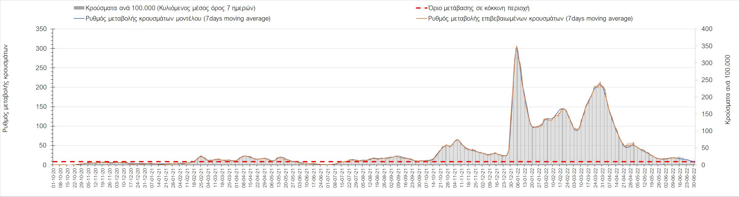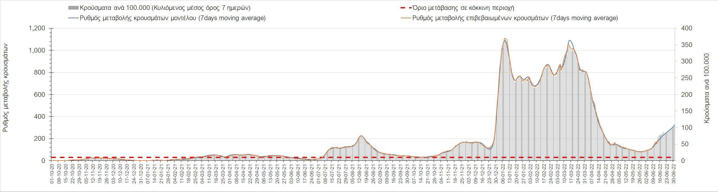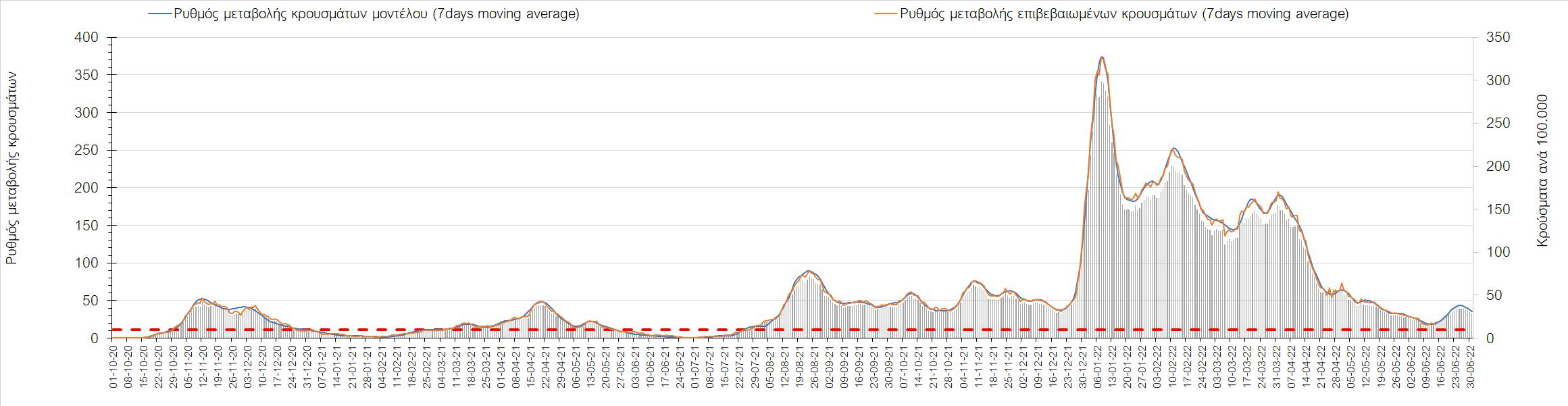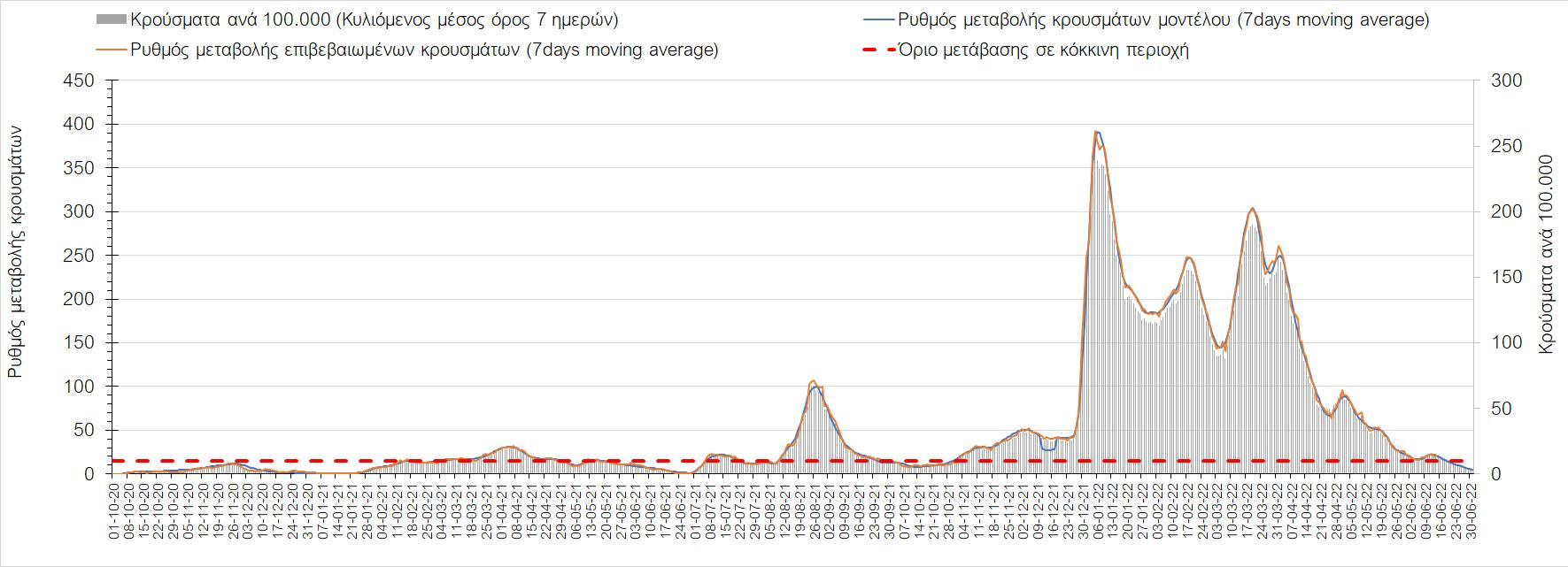 Στο σύνολο της χώρας η πορεία είναι ήπια ανοδική, και αντικατοπτρίζεται και στον ημερήσιο αριθμό των κρουσμάτων (κυλιόμενος μέσος όρος 7 ημερών), ο οποίος εμφανίζει άνοδο σε σχέση με την Κυριακή, και πλέον οδεύει προς τις 5000 (4.784). Για να επανέλθει η συστηματική αποκλιμάκωση της πανδημίας, πέρα από την εφαρμογή των μέτρων (σε συνδυασμό με την σημαντική συνειδητοποίηση εκ μέρους του πληθυσμού ότι χρειάζεται προσοχή και σύνεση για την αντιμετώπιση της διασποράς της παραλλαγής Ο), θα πρέπει να στοχεύσουμε στη διατήρηση και την επέκταση της επίκτητης ανοσίας του πληθυσμού, αλλά και στον μεγάλο αριθμό των τεστ συνολικά (μοριακά, rapid και self-test) που πραγματοποιούνται καθημερινά. Για αυτό το λόγο και με δεδομένη τη μεγάλη διασπορά στα σχολεία θεωρούμε πρόωρη την κατάργηση των self-test στα παιδιά σχολικής ηλικίας, ειδικά σε συνδυασμό με την ανοδική διακύμανση που παρατηρήθηκε.