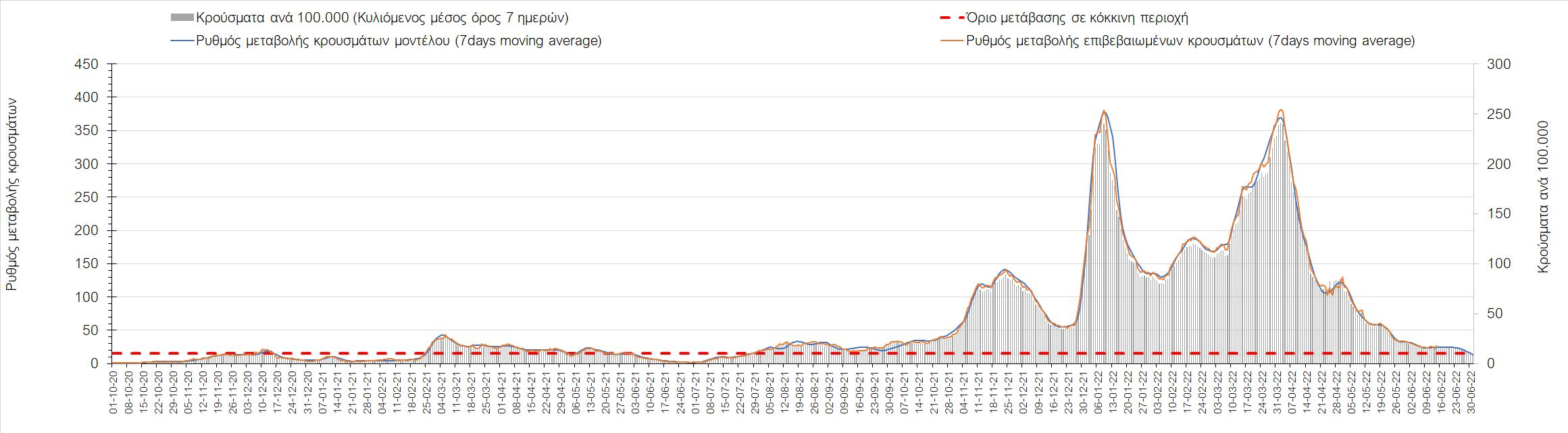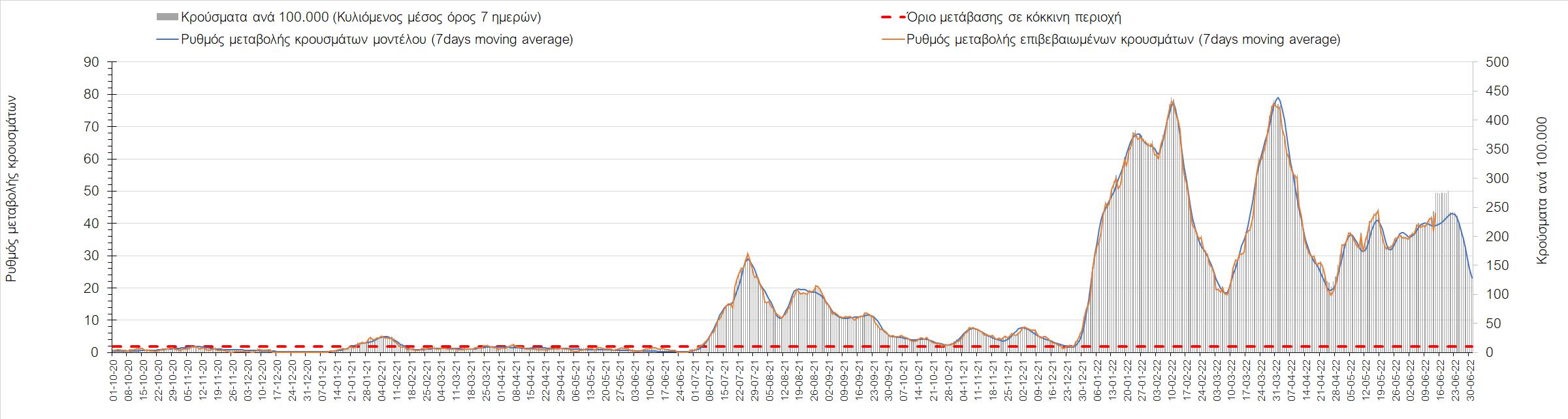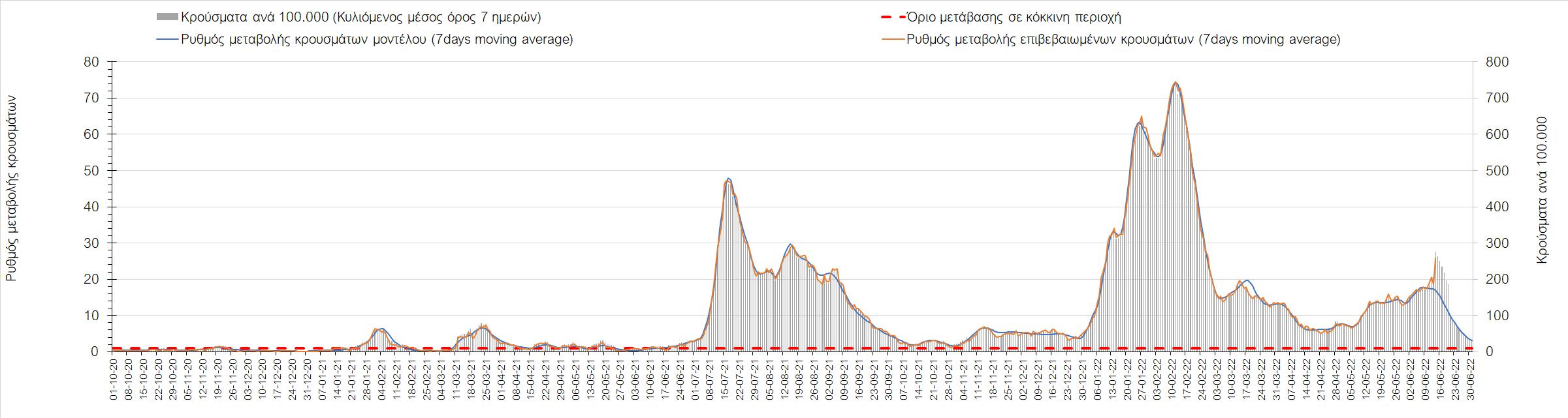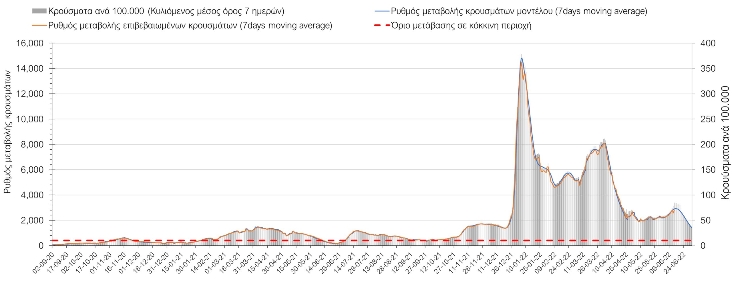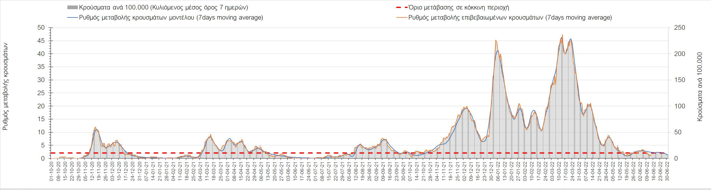 Στο σύνολο της χώρας η πορεία είναι ήπια ανοδική, και αντικατοπτρίζεται και στον ημερήσιο αριθμό των κρουσμάτων (κυλιόμενος μέσος όρος 7 ημερών), ο οποίος εμφανίζει άνοδο σε σχέση με την Κυριακή, και πλέον οδεύει προς τις 5000 (4.784). Για να επανέλθει η συστηματική αποκλιμάκωση της πανδημίας, πέρα από την εφαρμογή των μέτρων (σε συνδυασμό με την σημαντική συνειδητοποίηση εκ μέρους του πληθυσμού ότι χρειάζεται προσοχή και σύνεση για την αντιμετώπιση της διασποράς της παραλλαγής Ο), θα πρέπει να στοχεύσουμε στη διατήρηση και την επέκταση της επίκτητης ανοσίας του πληθυσμού, αλλά και στον μεγάλο αριθμό των τεστ συνολικά (μοριακά, rapid και self-test) που πραγματοποιούνται καθημερινά. Για αυτό το λόγο και με δεδομένη τη μεγάλη διασπορά στα σχολεία θεωρούμε πρόωρη την κατάργηση των self-test στα παιδιά σχολικής ηλικίας, ειδικά σε συνδυασμό με την ανοδική διακύμανση που παρατηρήθηκε.