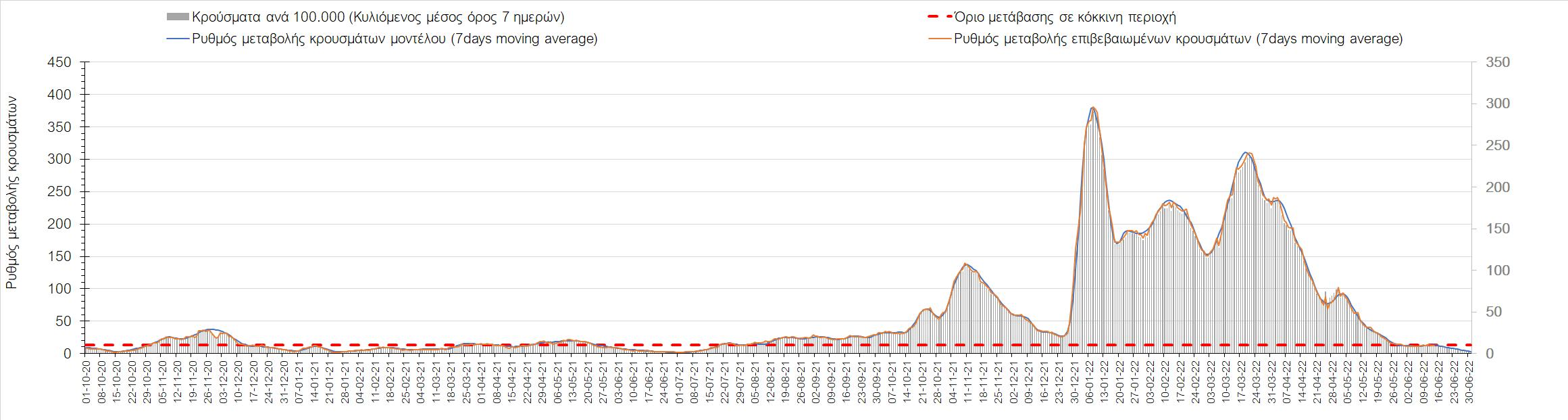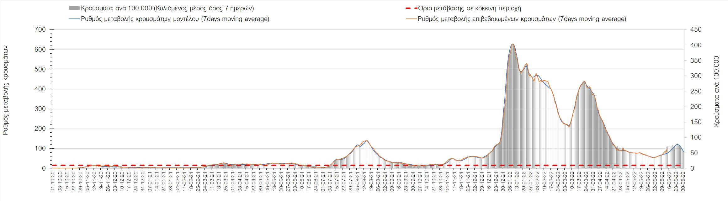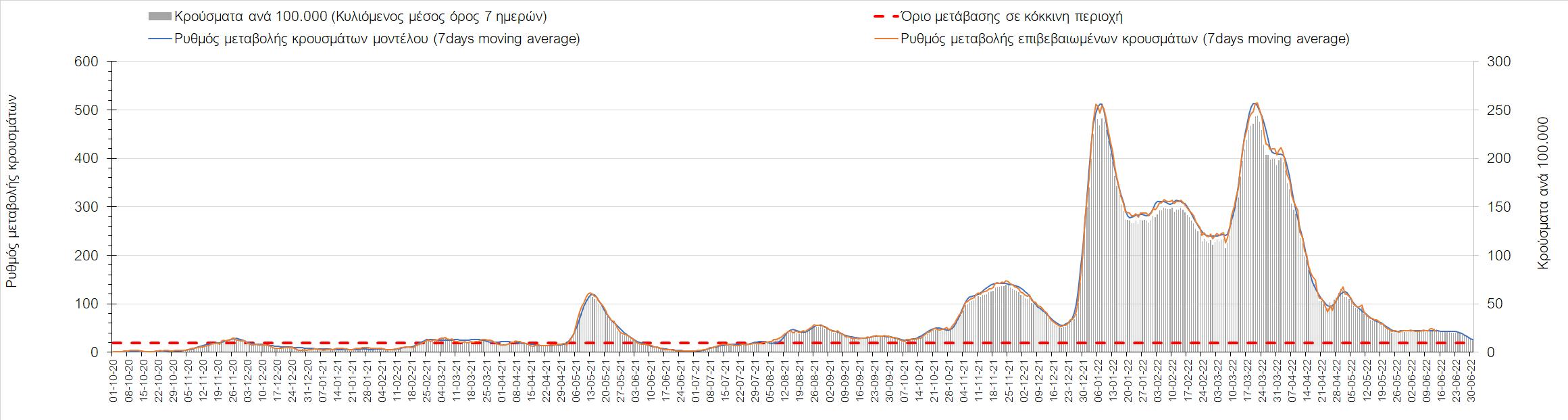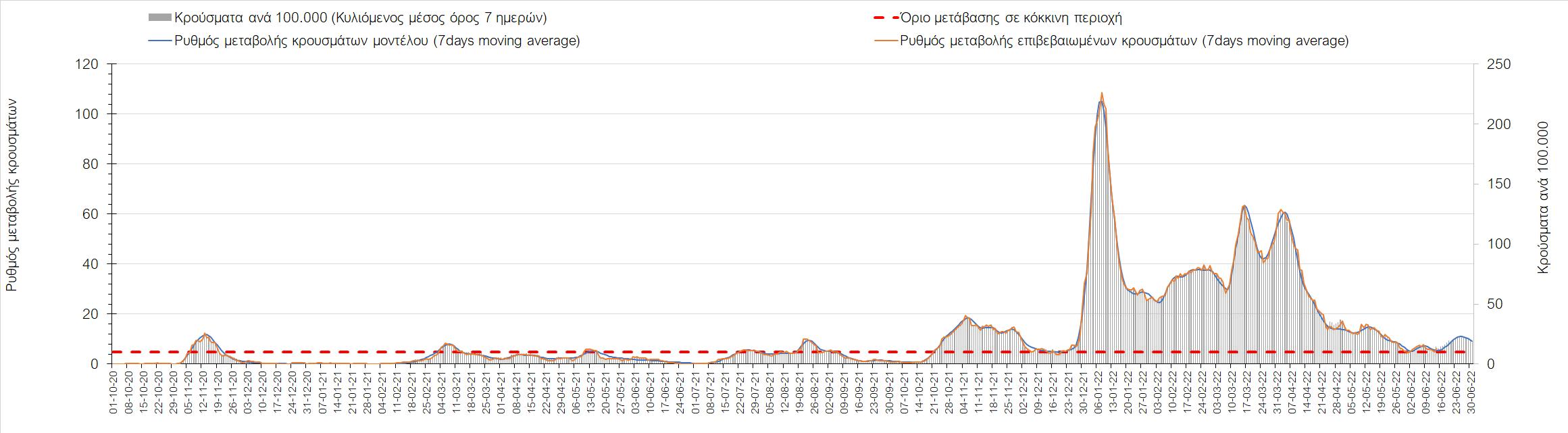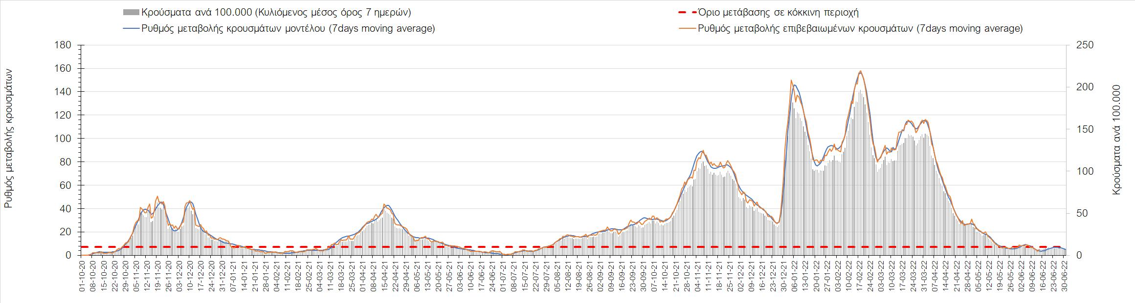 Στο σύνολο της χώρας η πορεία είναι ήπια ανοδική, και αντικατοπτρίζεται και στον ημερήσιο αριθμό των κρουσμάτων (κυλιόμενος μέσος όρος 7 ημερών), ο οποίος εμφανίζει άνοδο σε σχέση με την Κυριακή, και πλέον οδεύει προς τις 5000 (4.784). Για να επανέλθει η συστηματική αποκλιμάκωση της πανδημίας, πέρα από την εφαρμογή των μέτρων (σε συνδυασμό με την σημαντική συνειδητοποίηση εκ μέρους του πληθυσμού ότι χρειάζεται προσοχή και σύνεση για την αντιμετώπιση της διασποράς της παραλλαγής Ο), θα πρέπει να στοχεύσουμε στη διατήρηση και την επέκταση της επίκτητης ανοσίας του πληθυσμού, αλλά και στον μεγάλο αριθμό των τεστ συνολικά (μοριακά, rapid και self-test) που πραγματοποιούνται καθημερινά. Για αυτό το λόγο και με δεδομένη τη μεγάλη διασπορά στα σχολεία θεωρούμε πρόωρη την κατάργηση των self-test στα παιδιά σχολικής ηλικίας, ειδικά σε συνδυασμό με την ανοδική διακύμανση που παρατηρήθηκε.