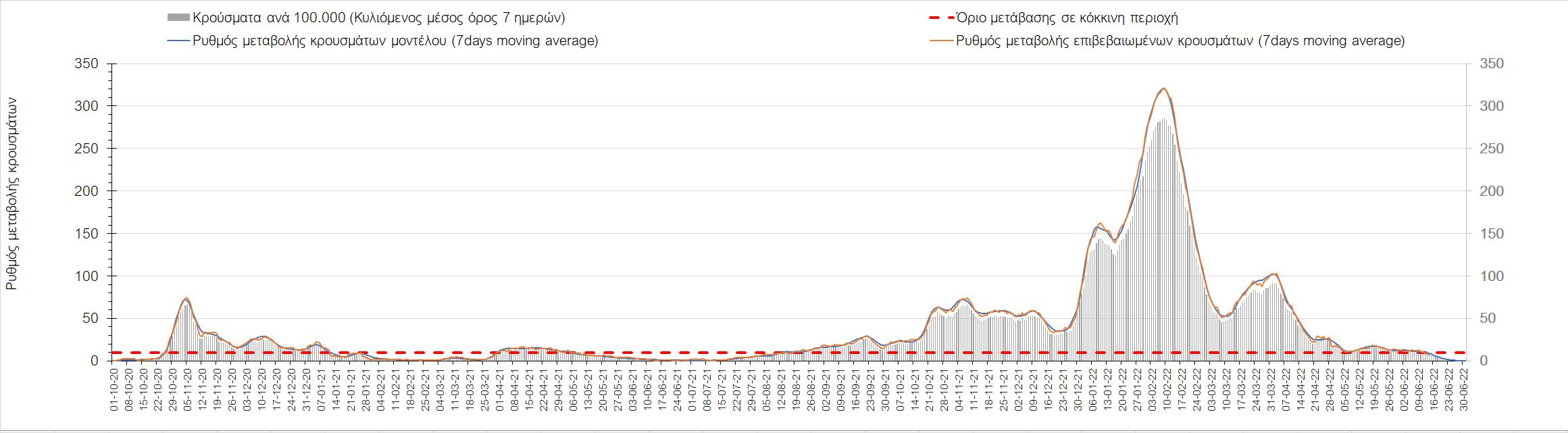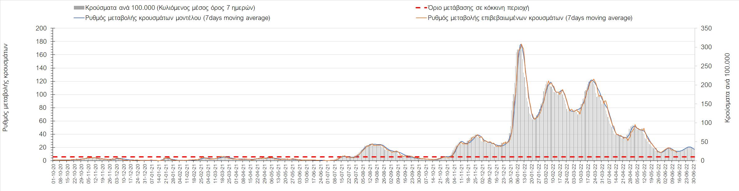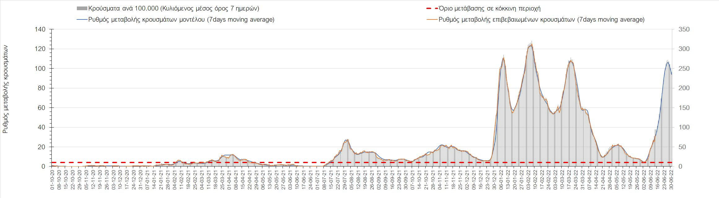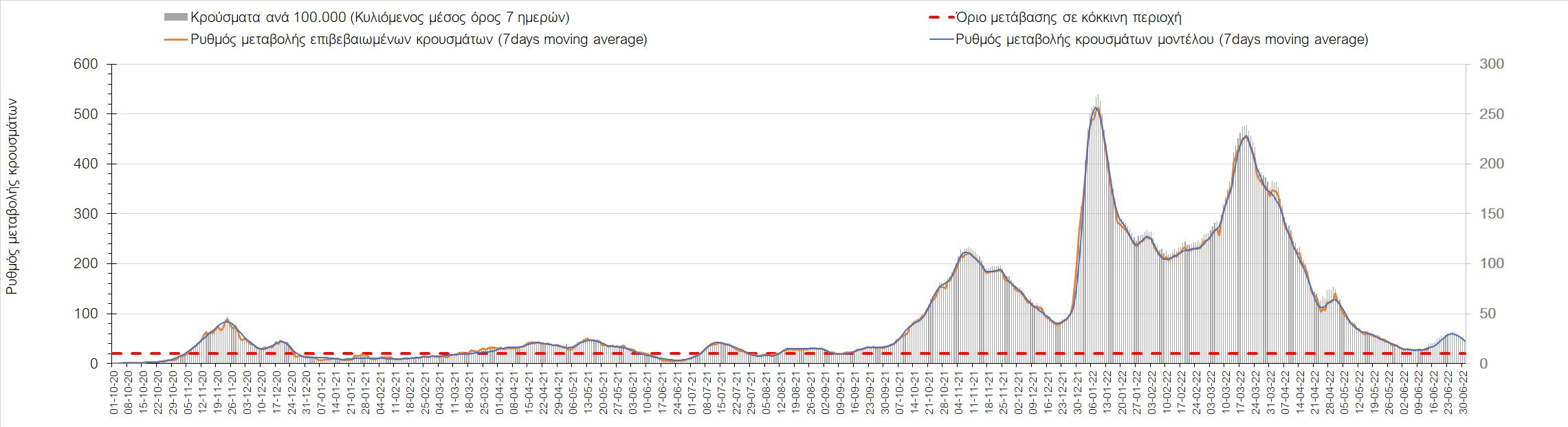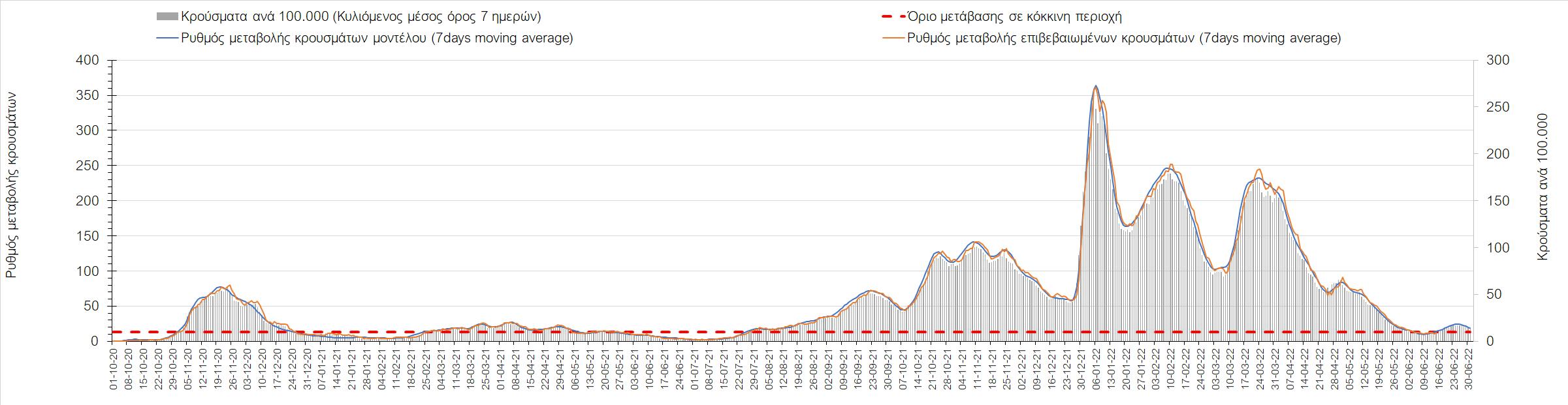 Στο σύνολο της χώρας η πορεία είναι ήπια ανοδική, και αντικατοπτρίζεται και στον ημερήσιο αριθμό των κρουσμάτων (κυλιόμενος μέσος όρος 7 ημερών), ο οποίος εμφανίζει άνοδο σε σχέση με την Κυριακή, και πλέον οδεύει προς τις 5000 (4.784). Για να επανέλθει η συστηματική αποκλιμάκωση της πανδημίας, πέρα από την εφαρμογή των μέτρων (σε συνδυασμό με την σημαντική συνειδητοποίηση εκ μέρους του πληθυσμού ότι χρειάζεται προσοχή και σύνεση για την αντιμετώπιση της διασποράς της παραλλαγής Ο), θα πρέπει να στοχεύσουμε στη διατήρηση και την επέκταση της επίκτητης ανοσίας του πληθυσμού, αλλά και στον μεγάλο αριθμό των τεστ συνολικά (μοριακά, rapid και self-test) που πραγματοποιούνται καθημερινά. Για αυτό το λόγο και με δεδομένη τη μεγάλη διασπορά στα σχολεία θεωρούμε πρόωρη την κατάργηση των self-test στα παιδιά σχολικής ηλικίας, ειδικά σε συνδυασμό με την ανοδική διακύμανση που παρατηρήθηκε.