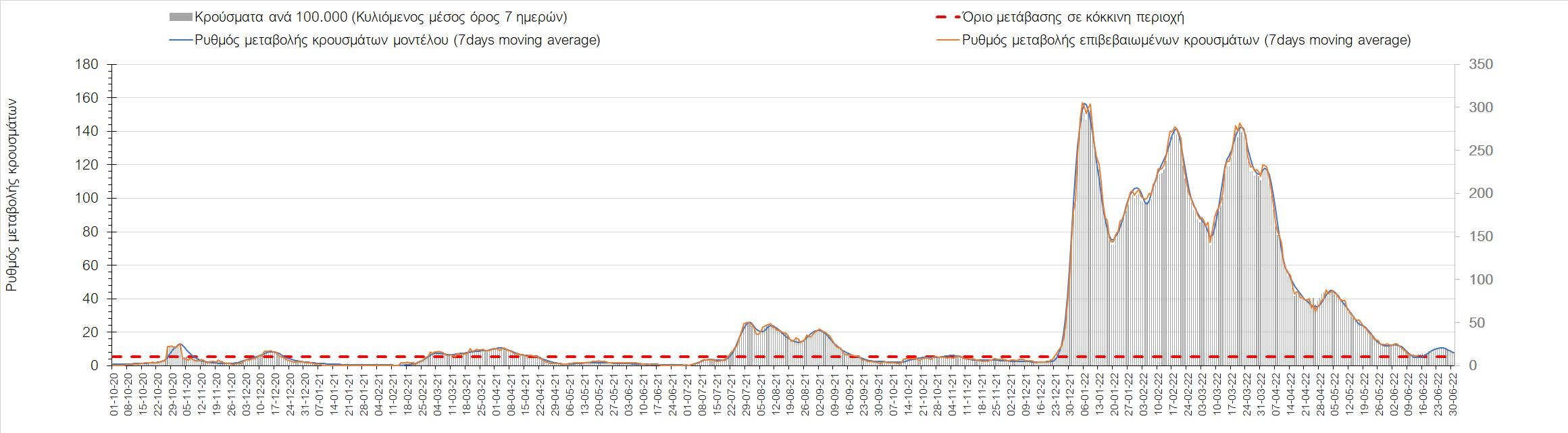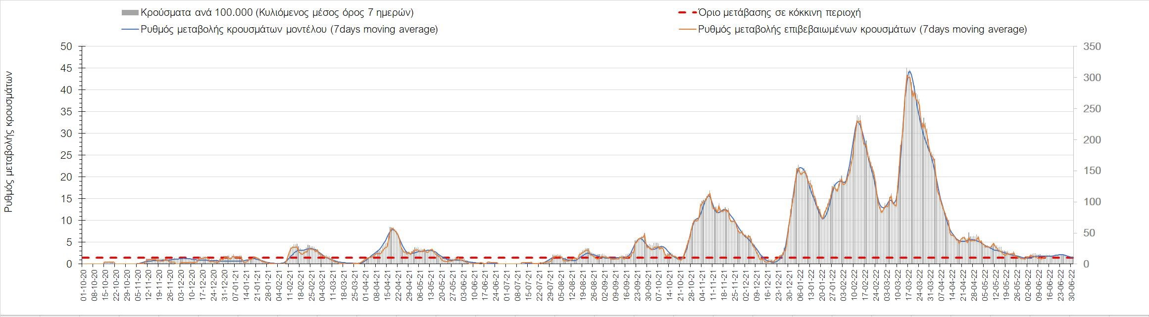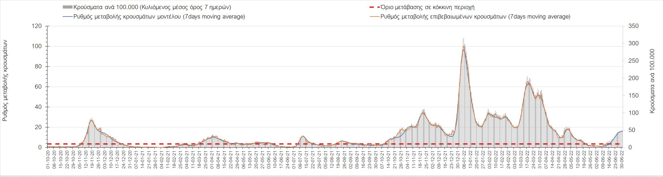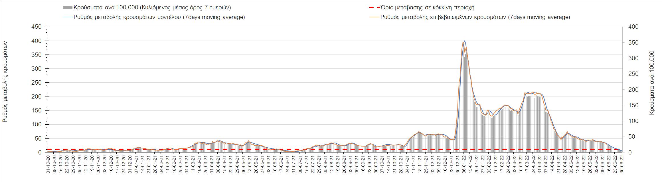 Στο σύνολο της χώρας η πορεία είναι ήπια ανοδική, και αντικατοπτρίζεται και στον ημερήσιο αριθμό των κρουσμάτων (κυλιόμενος μέσος όρος 7 ημερών), ο οποίος εμφανίζει άνοδο σε σχέση με την Κυριακή, και πλέον οδεύει προς τις 5000 (4.784). Για να επανέλθει η συστηματική αποκλιμάκωση της πανδημίας, πέρα από την εφαρμογή των μέτρων (σε συνδυασμό με την σημαντική συνειδητοποίηση εκ μέρους του πληθυσμού ότι χρειάζεται προσοχή και σύνεση για την αντιμετώπιση της διασποράς της παραλλαγής Ο), θα πρέπει να στοχεύσουμε στη διατήρηση και την επέκταση της επίκτητης ανοσίας του πληθυσμού, αλλά και στον μεγάλο αριθμό των τεστ συνολικά (μοριακά, rapid και self-test) που πραγματοποιούνται καθημερινά. Για αυτό το λόγο και με δεδομένη τη μεγάλη διασπορά στα σχολεία θεωρούμε πρόωρη την κατάργηση των self-test στα παιδιά σχολικής ηλικίας, ειδικά σε συνδυασμό με την ανοδική διακύμανση που παρατηρήθηκε.