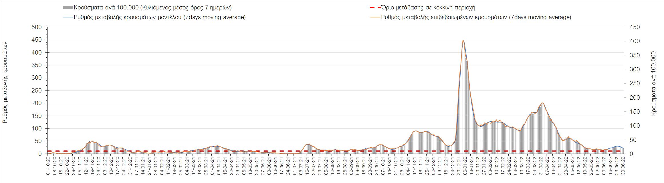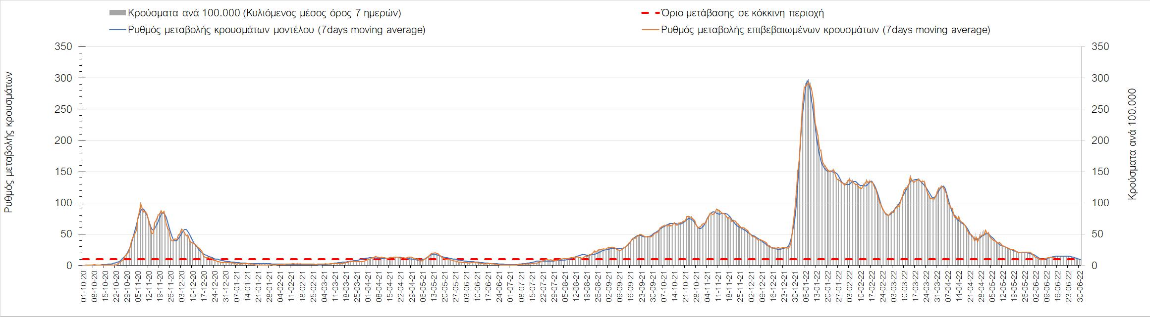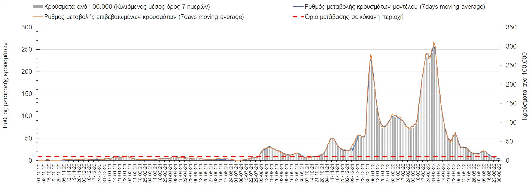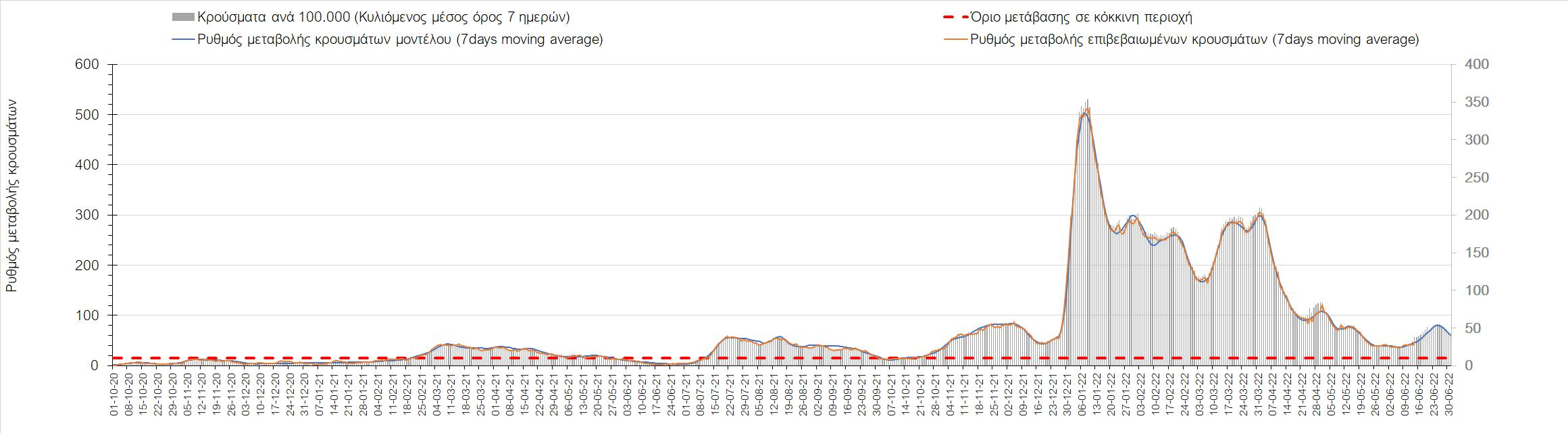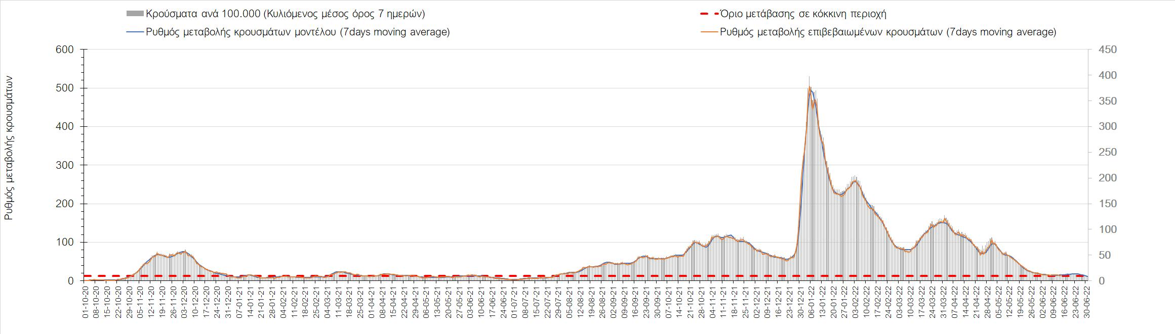 Στο σύνολο της χώρας η πορεία είναι ήπια ανοδική, και αντικατοπτρίζεται και στον ημερήσιο αριθμό των κρουσμάτων (κυλιόμενος μέσος όρος 7 ημερών), ο οποίος εμφανίζει άνοδο σε σχέση με την Κυριακή, και πλέον οδεύει προς τις 5000 (4.784). Για να επανέλθει η συστηματική αποκλιμάκωση της πανδημίας, πέρα από την εφαρμογή των μέτρων (σε συνδυασμό με την σημαντική συνειδητοποίηση εκ μέρους του πληθυσμού ότι χρειάζεται προσοχή και σύνεση για την αντιμετώπιση της διασποράς της παραλλαγής Ο), θα πρέπει να στοχεύσουμε στη διατήρηση και την επέκταση της επίκτητης ανοσίας του πληθυσμού, αλλά και στον μεγάλο αριθμό των τεστ συνολικά (μοριακά, rapid και self-test) που πραγματοποιούνται καθημερινά. Για αυτό το λόγο και με δεδομένη τη μεγάλη διασπορά στα σχολεία θεωρούμε πρόωρη την κατάργηση των self-test στα παιδιά σχολικής ηλικίας, ειδικά σε συνδυασμό με την ανοδική διακύμανση που παρατηρήθηκε.