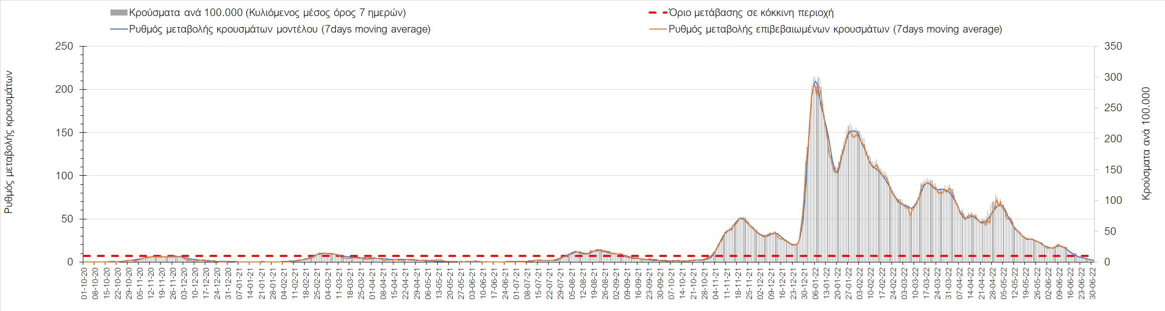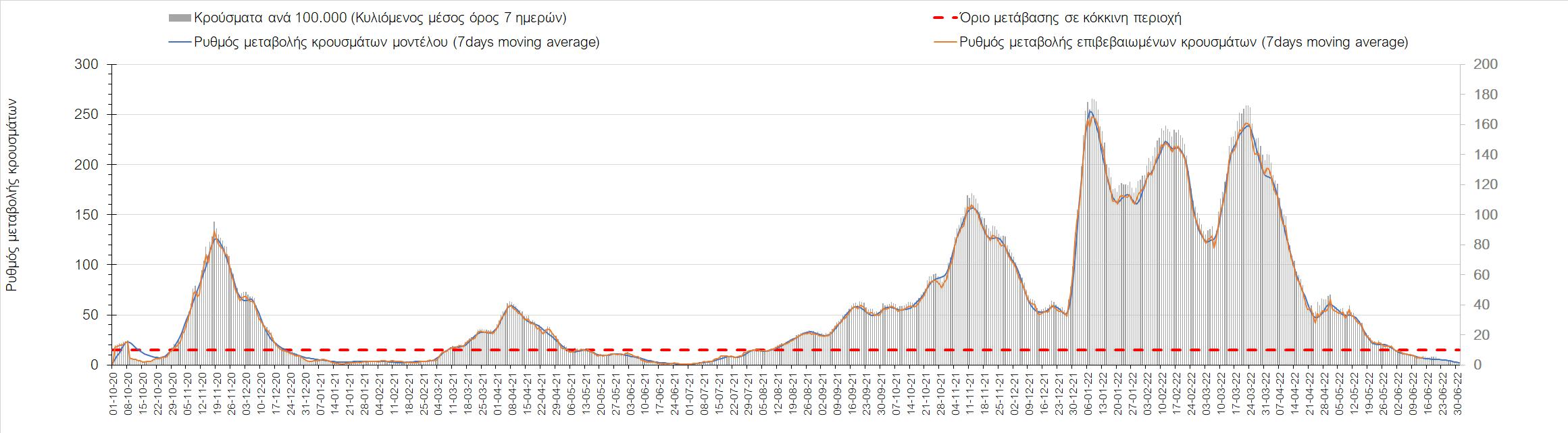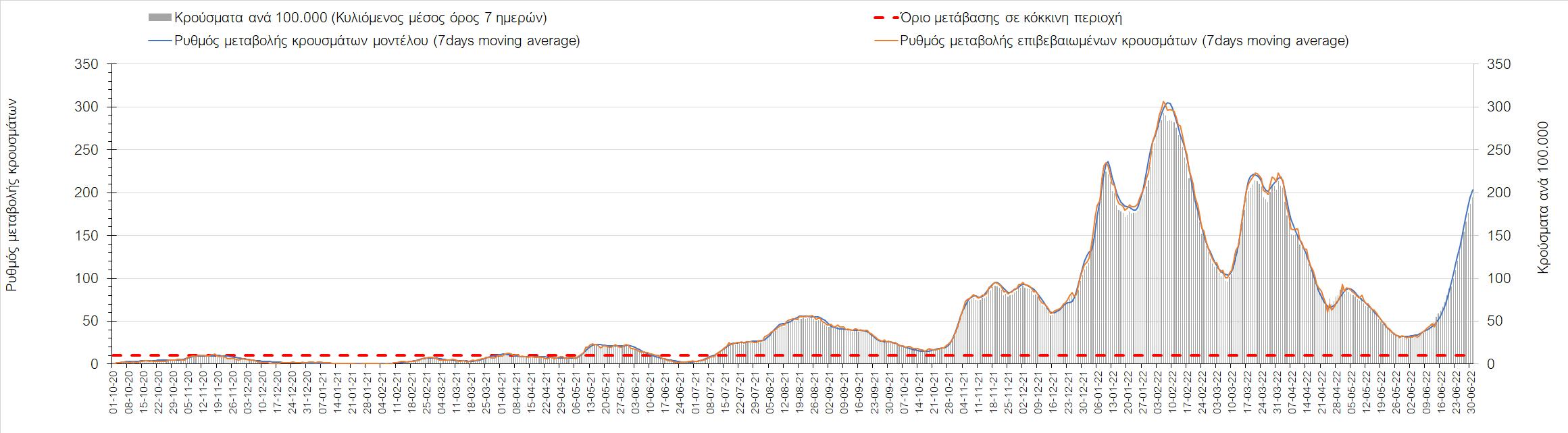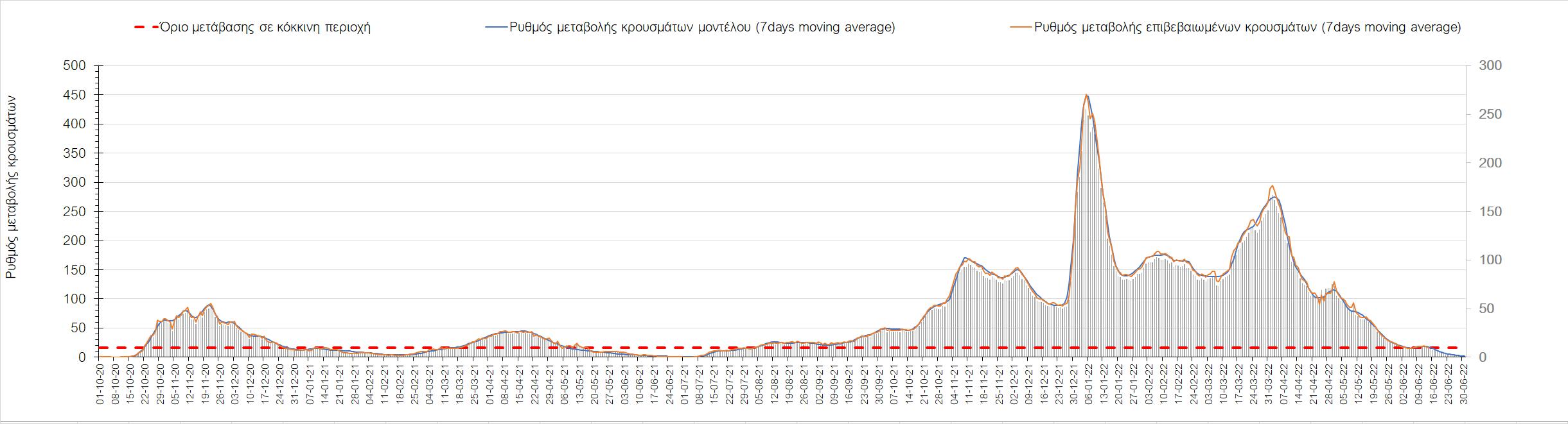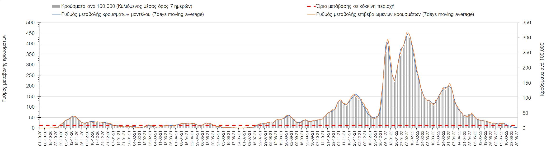 Στο σύνολο της χώρας η πορεία είναι ήπια ανοδική, και αντικατοπτρίζεται και στον ημερήσιο αριθμό των κρουσμάτων (κυλιόμενος μέσος όρος 7 ημερών), ο οποίος εμφανίζει άνοδο σε σχέση με την Κυριακή, και πλέον οδεύει προς τις 5000 (4.784). Για να επανέλθει η συστηματική αποκλιμάκωση της πανδημίας, πέρα από την εφαρμογή των μέτρων (σε συνδυασμό με την σημαντική συνειδητοποίηση εκ μέρους του πληθυσμού ότι χρειάζεται προσοχή και σύνεση για την αντιμετώπιση της διασποράς της παραλλαγής Ο), θα πρέπει να στοχεύσουμε στη διατήρηση και την επέκταση της επίκτητης ανοσίας του πληθυσμού, αλλά και στον μεγάλο αριθμό των τεστ συνολικά (μοριακά, rapid και self-test) που πραγματοποιούνται καθημερινά. Για αυτό το λόγο και με δεδομένη τη μεγάλη διασπορά στα σχολεία θεωρούμε πρόωρη την κατάργηση των self-test στα παιδιά σχολικής ηλικίας, ειδικά σε συνδυασμό με την ανοδική διακύμανση που παρατηρήθηκε.