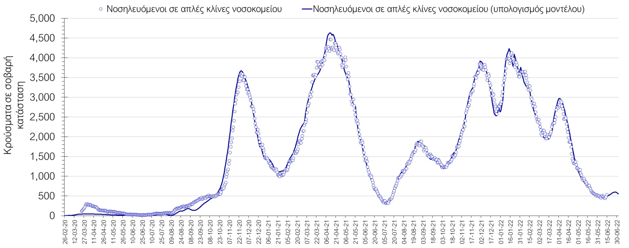 Σχήμα 2 . Αριθμός κρουσμάτων σε σοβαρή κατάσταση (νοσηλευόμενοι σε απλές κλίνες) σύμφωνα με τα στοιχεία του ΕΟΔΥ και τις προβλέψεις της υπολογιστικής πλατφόρμας CORE.