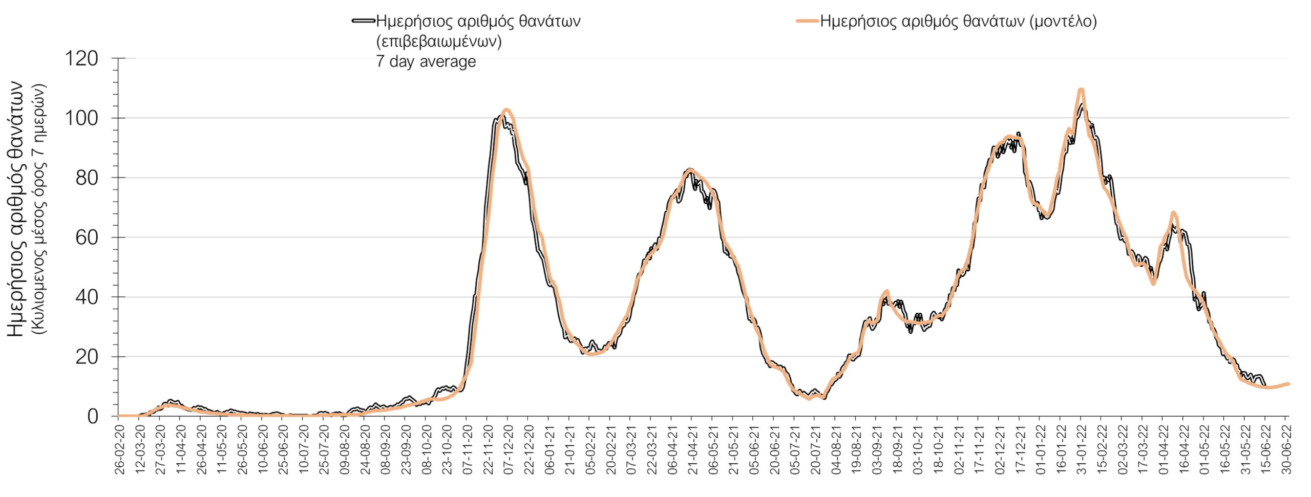 Σχήμα 3 . Αριθμός θανάτων (κυλιόμενος μέσος όρος 7 ημερών) σύμφωνα με τα στοιχεία του ΕΟΔΥ και τις προβλέψεις της υπολογιστικής πλατφόρμας CORE.