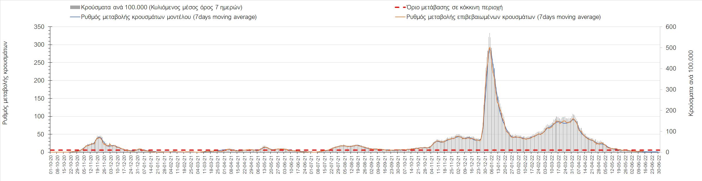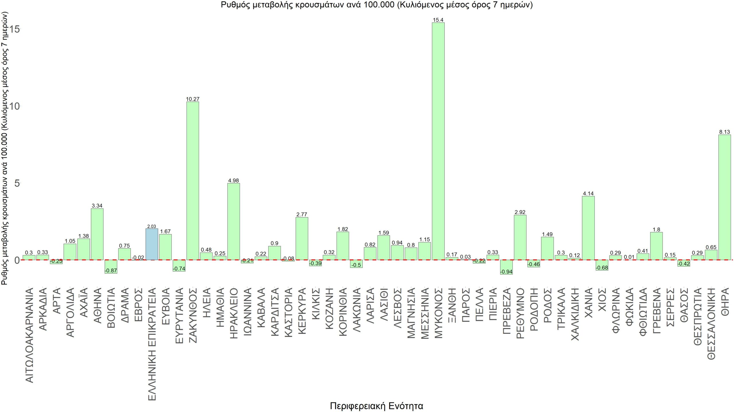 Η αποτύπωση των τάσεων στις επιμέρους περιοχές, παρουσιάζεται στο Σχήμα 61 , όπου παρουσιάζεται ο ρυθμός μεταβολής των νέων κρουσμάτων ανά 100.000 κατοίκους (κυλιόμενος μέσος όρος 7 ημερών) των επιμέρους περιοχών. Θετικές τιμές του ρυθμού μεταβολής υποδηλώνουν άνοδο, ενώ αρνητικές τιμές υποδηλώνουν πτωτική πορεία.