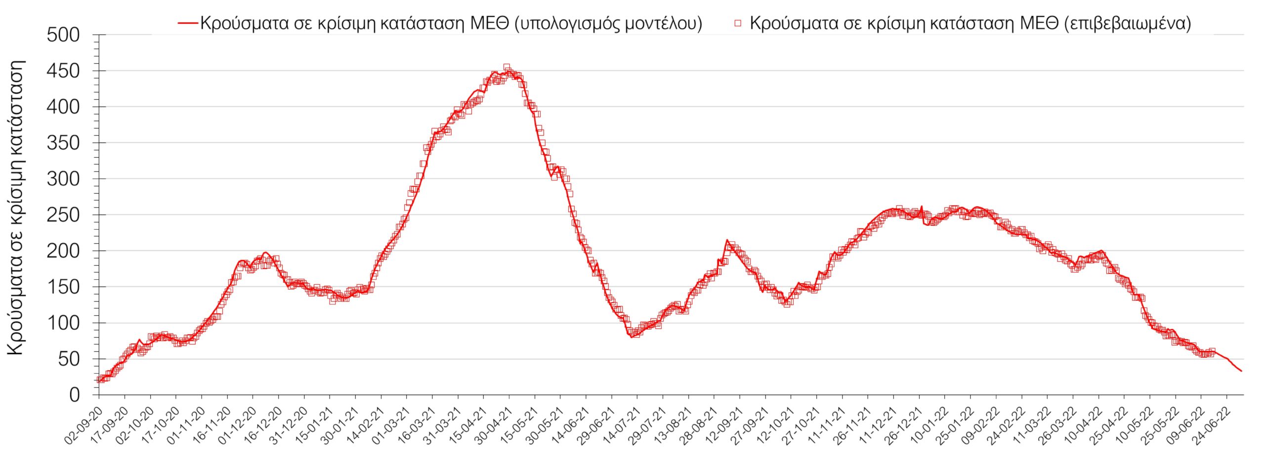 Σχήμα 1 . Αριθμός κρουσμάτων σε κρίσιμη κατάσταση (ΜΕΘ) σύμφωνα με τα στοιχεία του ΕΟΔΥ και τις προβλέψεις της υπολογιστικής πλατφόρμας CORE.