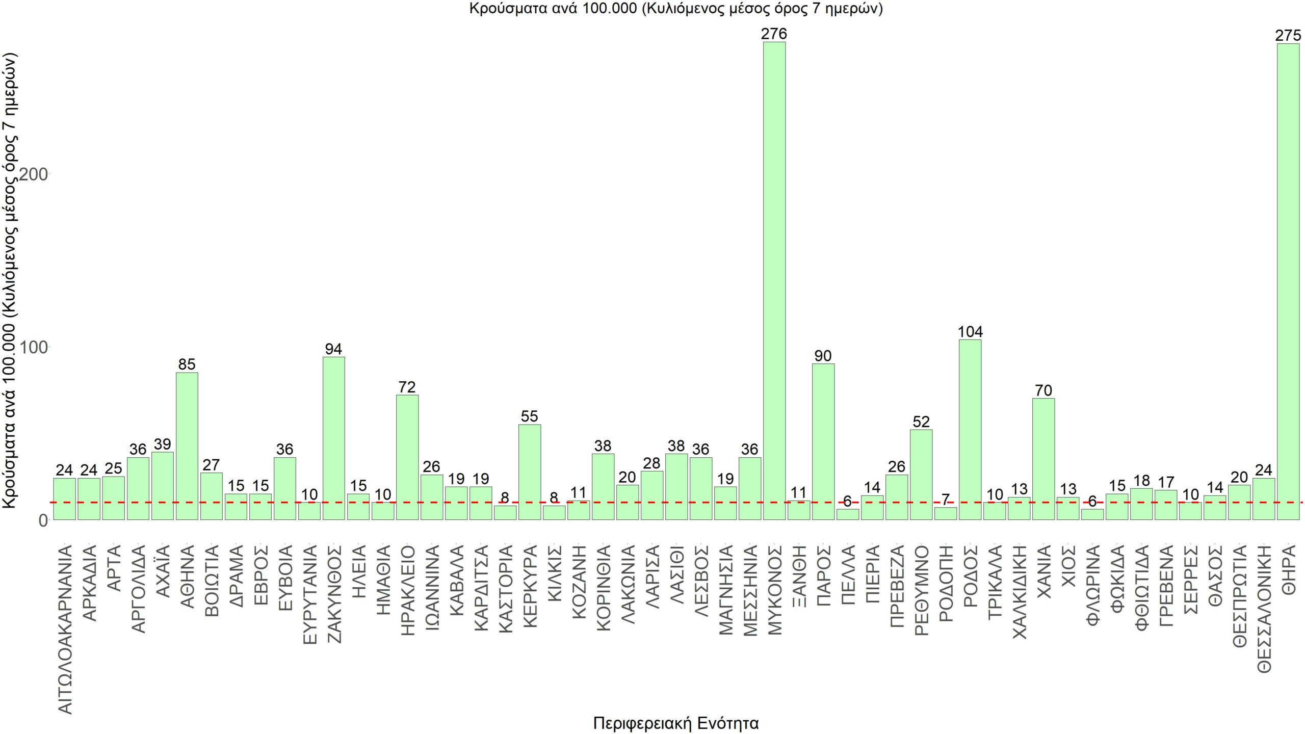 Η συγκεντρωτική εικόνα των νέων κρουσμάτων ανά 100.000 κατοίκους (κυλιόμενος μέσος όρος 7 ημερών) των επιμέρους περιοχών παρουσιάζεται στο Σχήμα 60 . Όλες οι περιοχές παραμένουν πάνω από το όριο ανησυχίας, μεεξαίρεση την Καστοριά, το Κιλκίς, την Πέλλα, τη Ροδόπη και τη Φλώρινα.