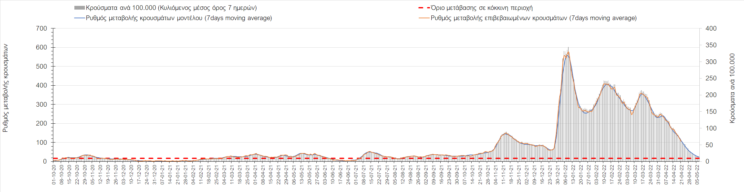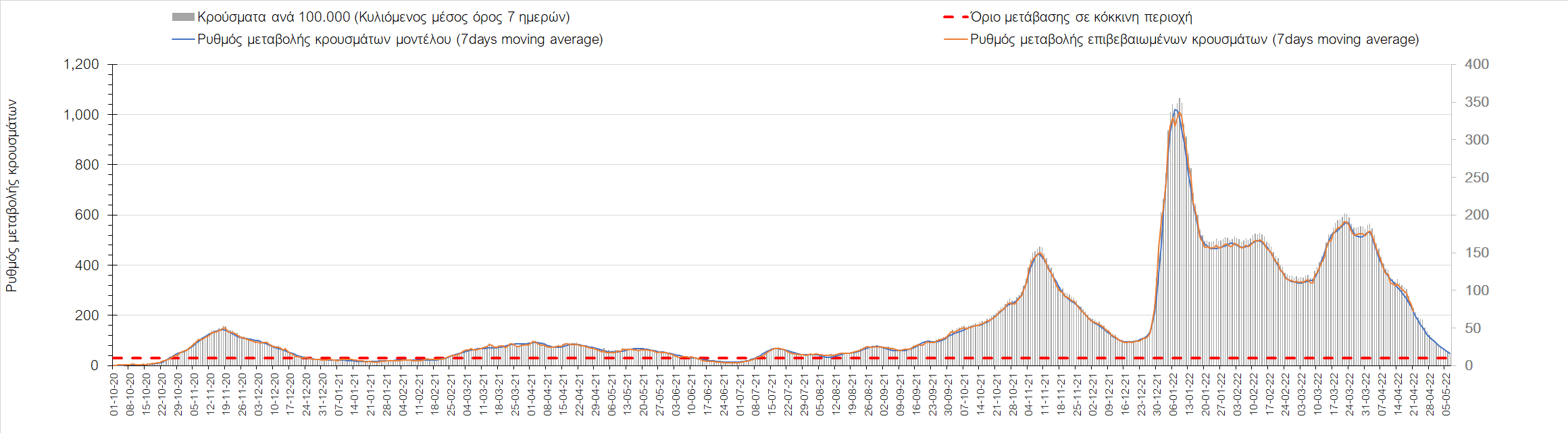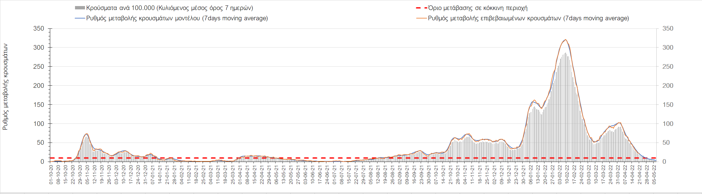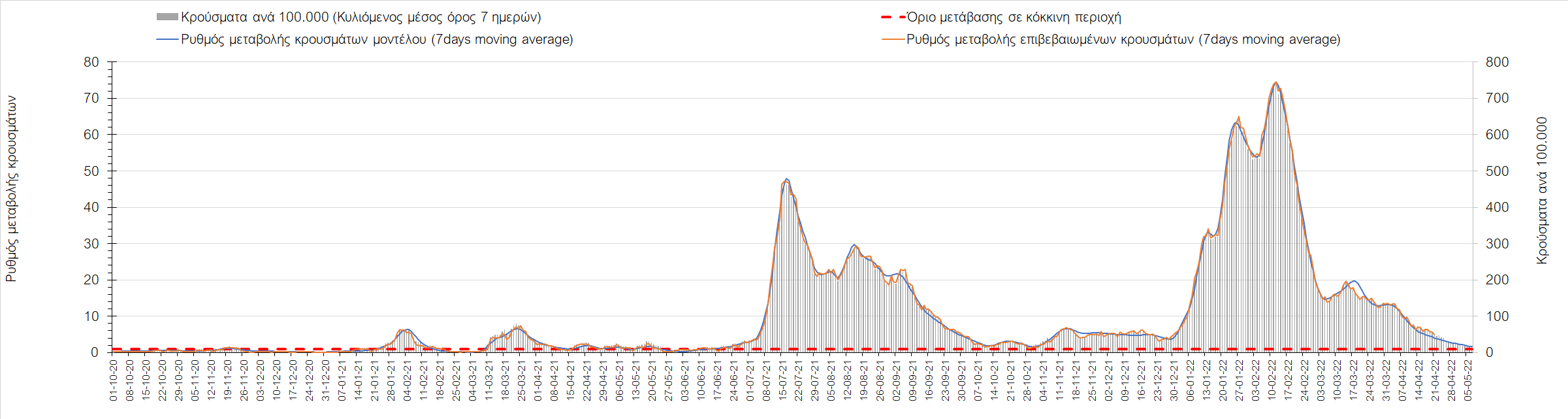 Πλέον, η συνολική ανοσία στον πληθυσμό, τόσο τεχνητή, όσο και φυσική μετά από νόσηση, τα πολλά τεστ (αν και μειωμένα σε σχέση με τις προηγούμενες εβδομάδες) καθώς και η άνοδος της θερμοκρασίας συντελούν πλέον στη συστηματική αποκλιμάκωση της πανδημίας.