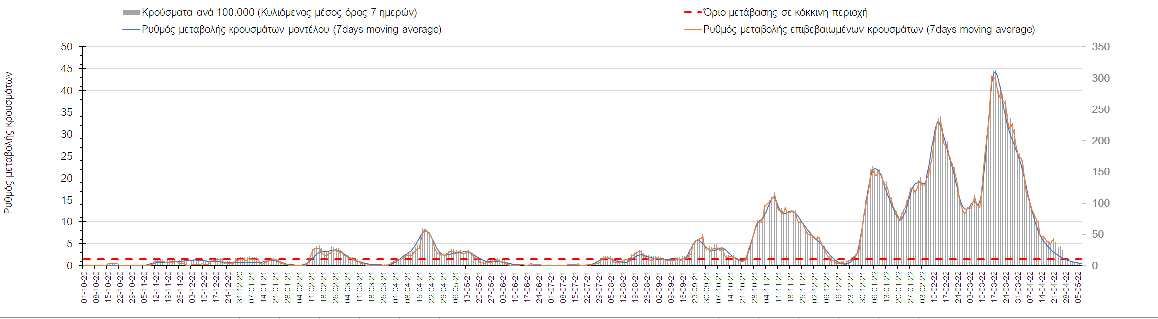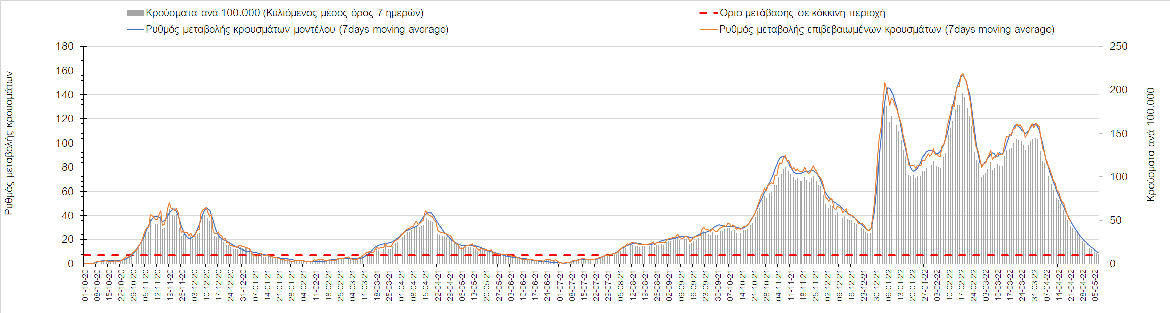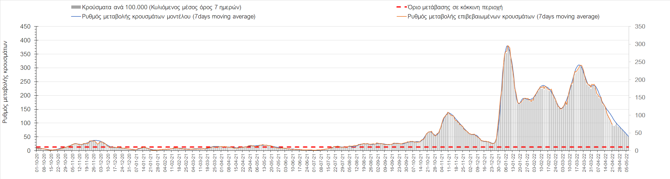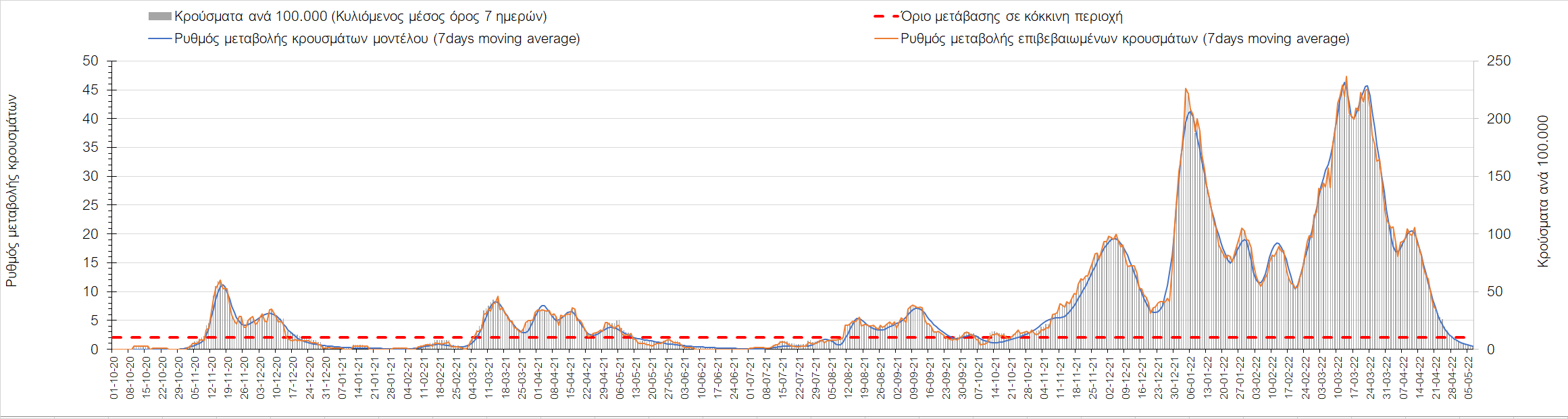 Πλέον, η συνολική ανοσία στον πληθυσμό, τόσο τεχνητή, όσο και φυσική μετά από νόσηση, τα πολλά τεστ (αν και μειωμένα σε σχέση με τις προηγούμενες εβδομάδες) καθώς και η άνοδος της θερμοκρασίας συντελούν πλέον στη συστηματική αποκλιμάκωση της πανδημίας.