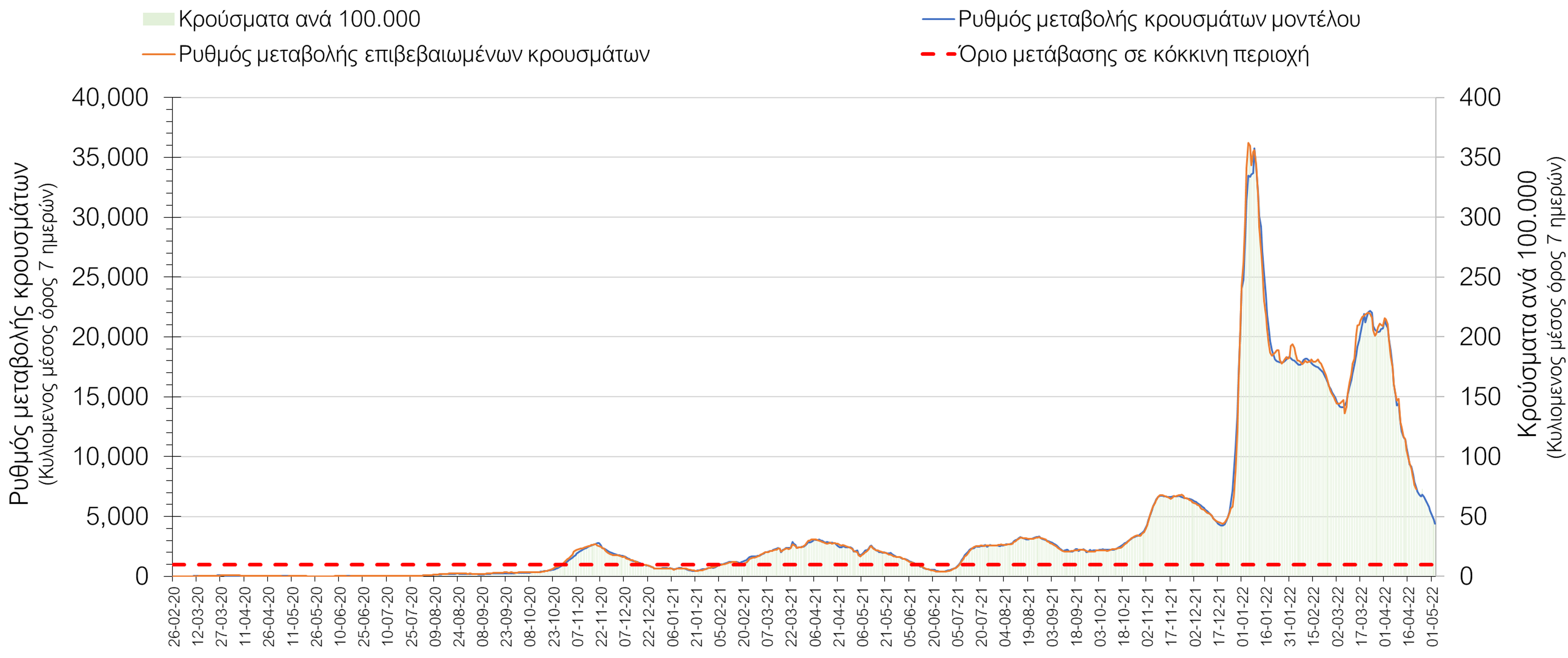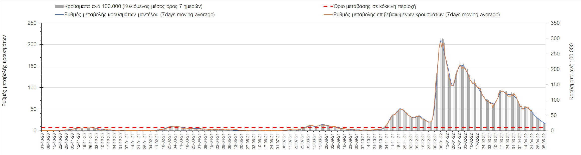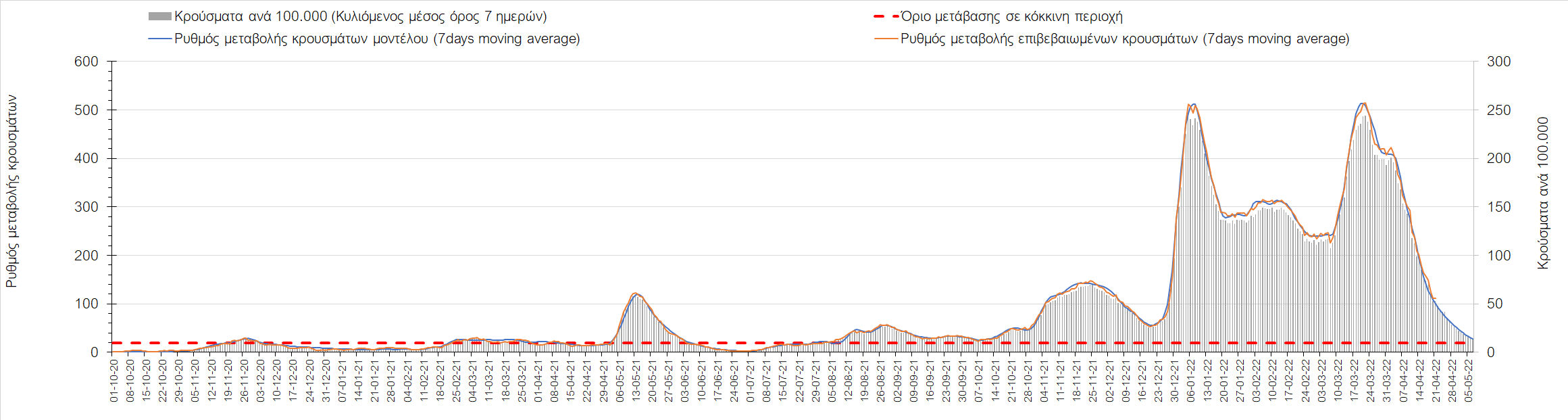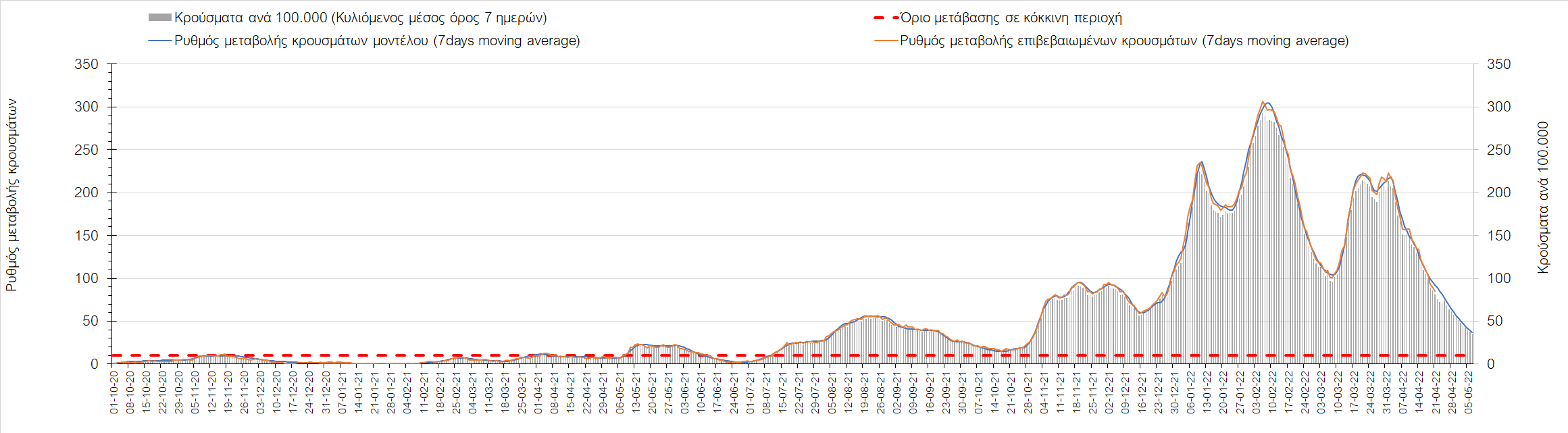 Πλέον, η συνολική ανοσία στον πληθυσμό, τόσο τεχνητή, όσο και φυσική μετά από νόσηση, τα πολλά τεστ (αν και μειωμένα σε σχέση με τις προηγούμενες εβδομάδες) καθώς και η άνοδος της θερμοκρασίας συντελούν πλέον στη συστηματική αποκλιμάκωση της πανδημίας.