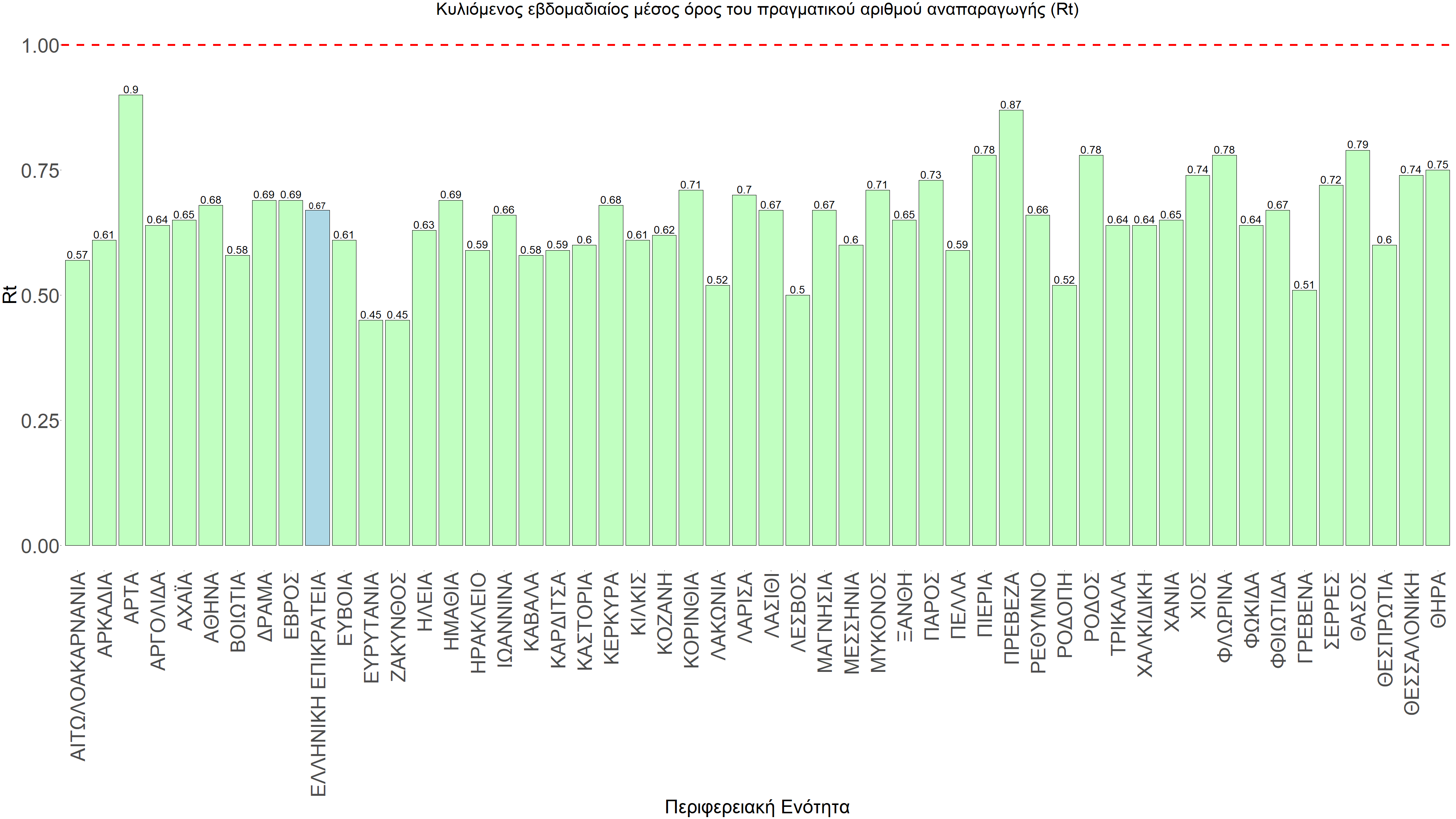 O πραγματικός αριθμός αναπαραγωγής Rt ανά περιφερειακή ενότητα της χώρας παρουσιάζεται στο Σχήμα 58.