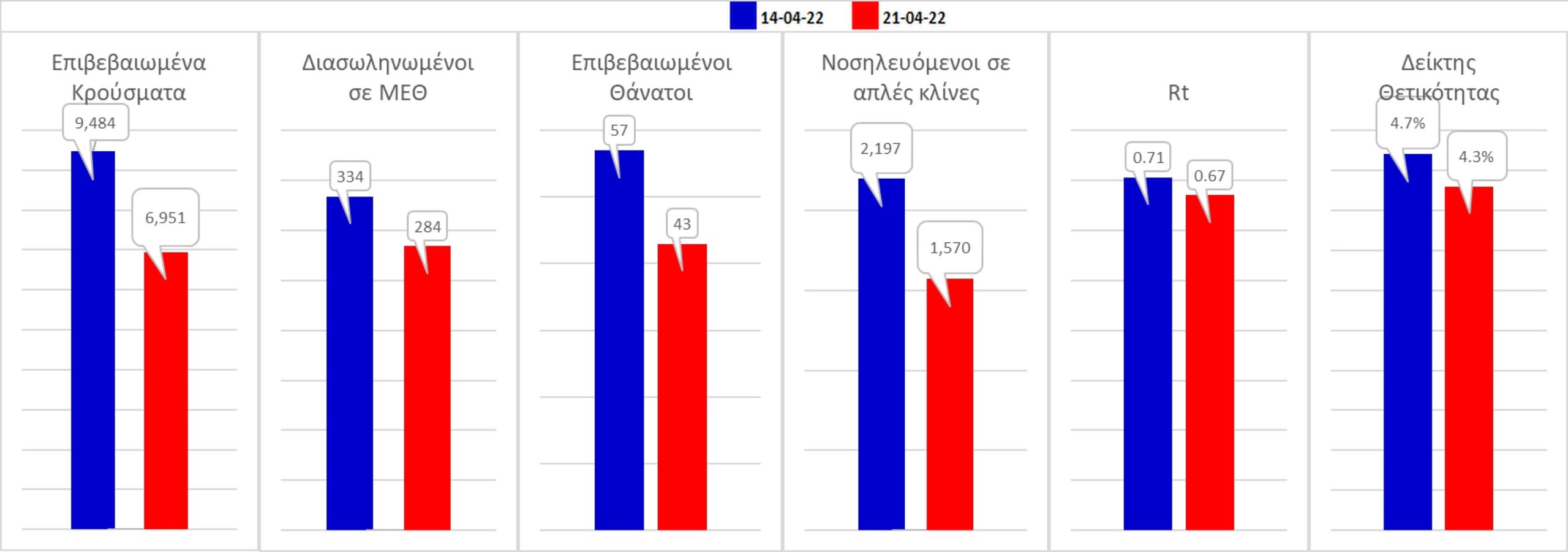 Σχήμα 59. Συγκριτικά αποτελέσματα της επιδημιολογικής εικόνας της σημερινής Πέμπτης (21/04/2022) σε σχέση με την προηγούμενη (14/04/2022)