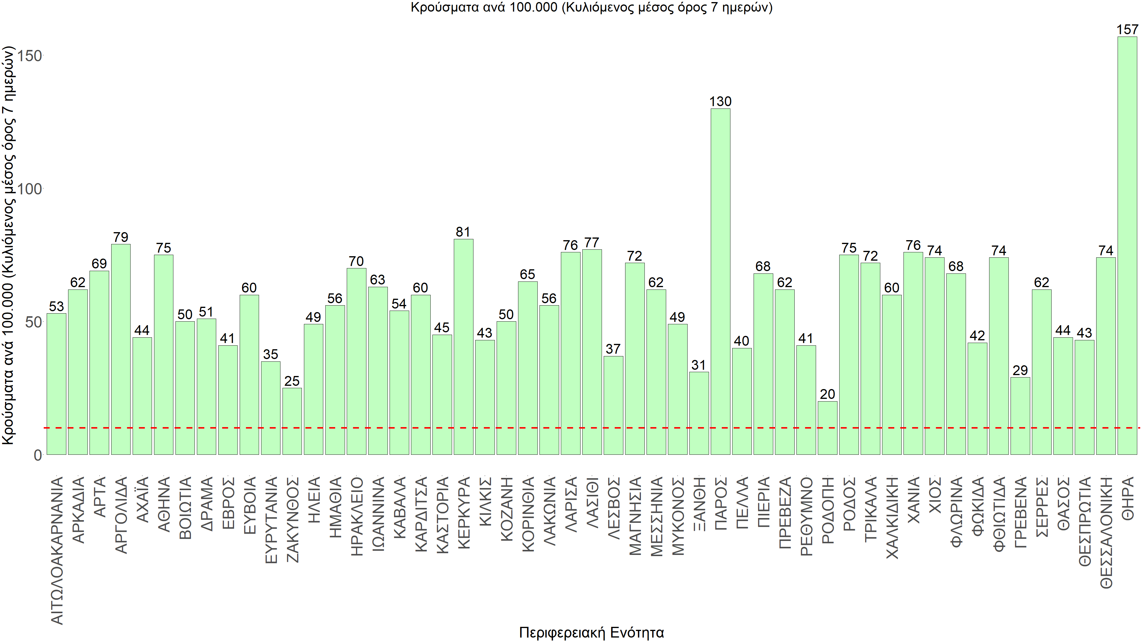 Σχήμα 60. Συγκεντρωτική εικόνα των νέων κρουσμάτων ανά 100.000 κατοίκους (κυλιόμενος μέσος όρος 7 ημερών) των επιμέρους περιοχών