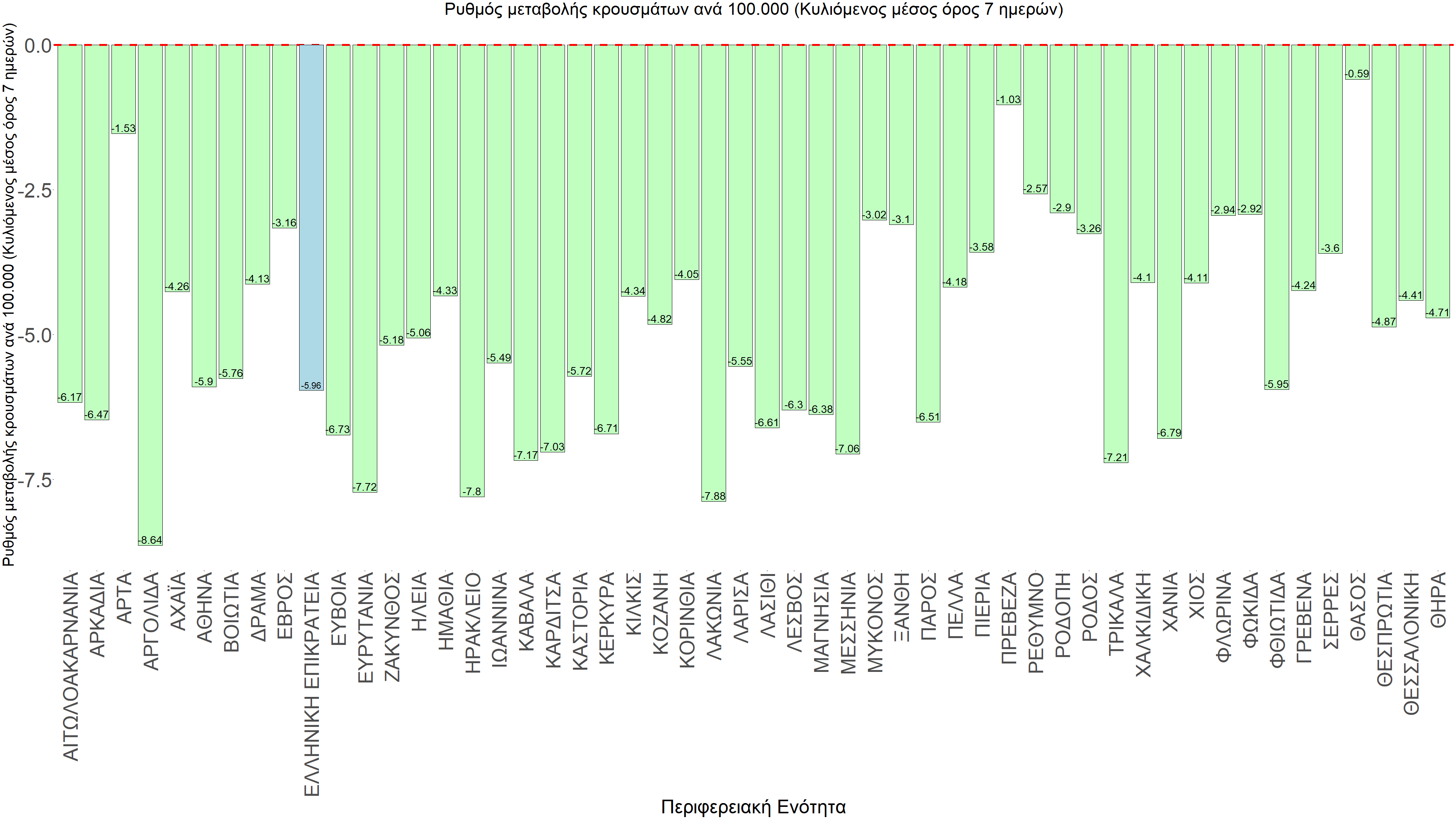 Η αποτύπωση των τάσεων στις επιμέρους περιοχές, παρουσιάζεται στο Σχήμα 61, όπου παρουσιάζεται ο ρυθμός μεταβολής των νέων κρουσμάτων ανά 100.000 κατοίκους (κυλιόμενος μέσος όρος 7 ημερών) των επιμέρους περιοχών. Θετικές τιμές του ρυθμού μεταβολής υποδηλώνουν άνοδο, ενώ αρνητικές τιμές υποδηλώνουν πτωτική πορεία.