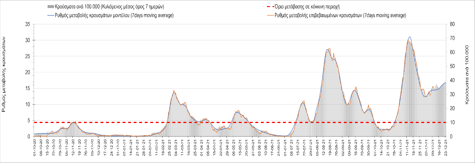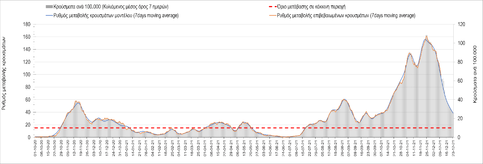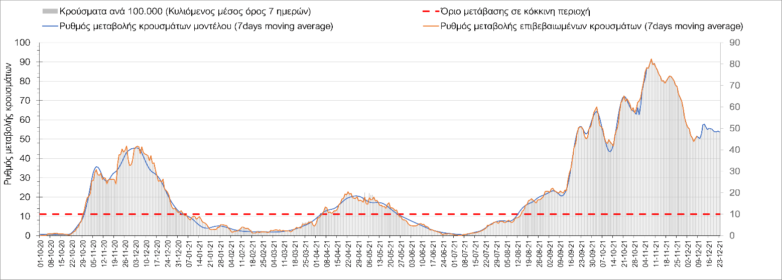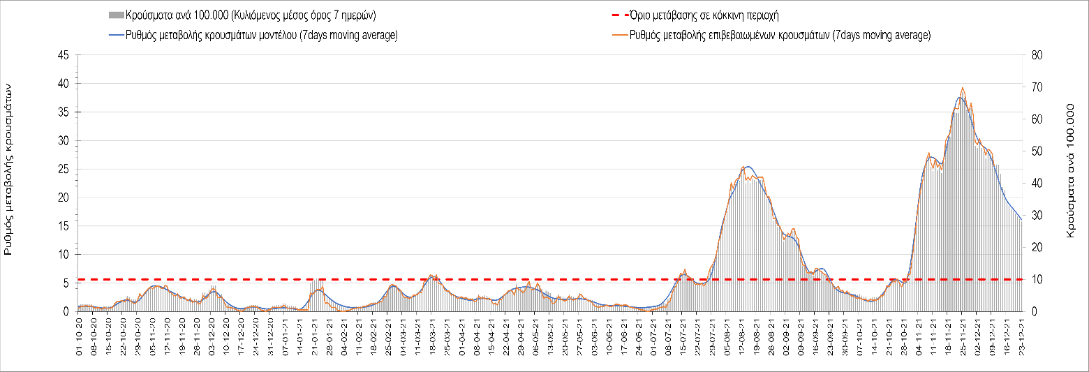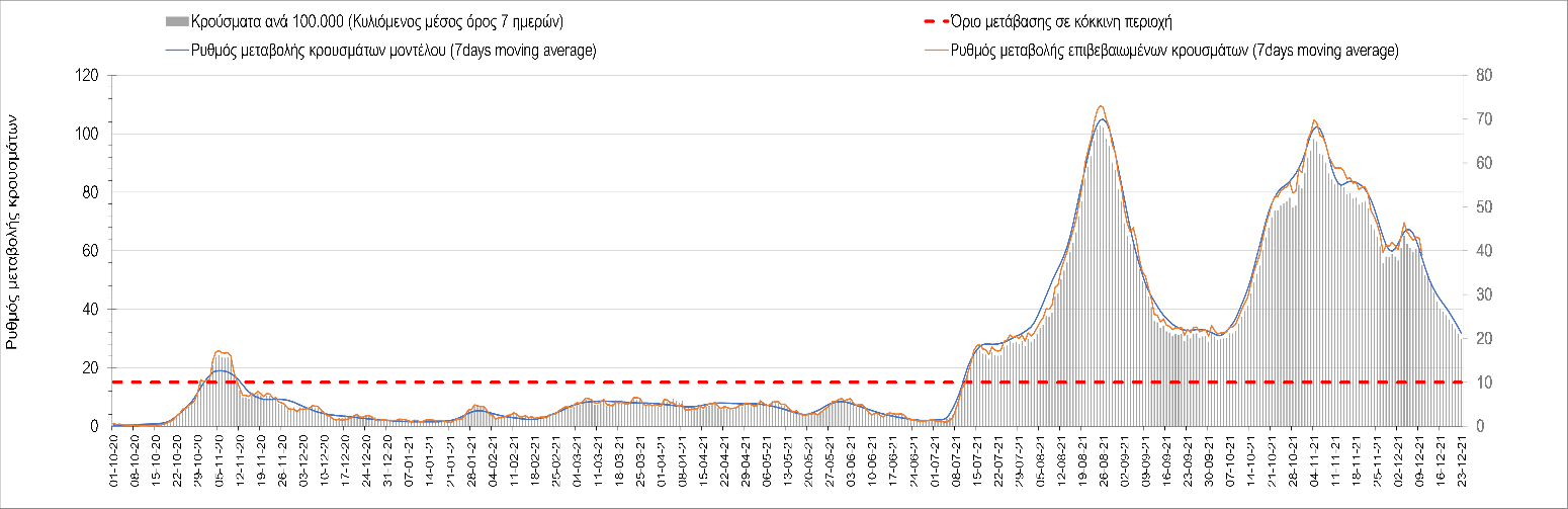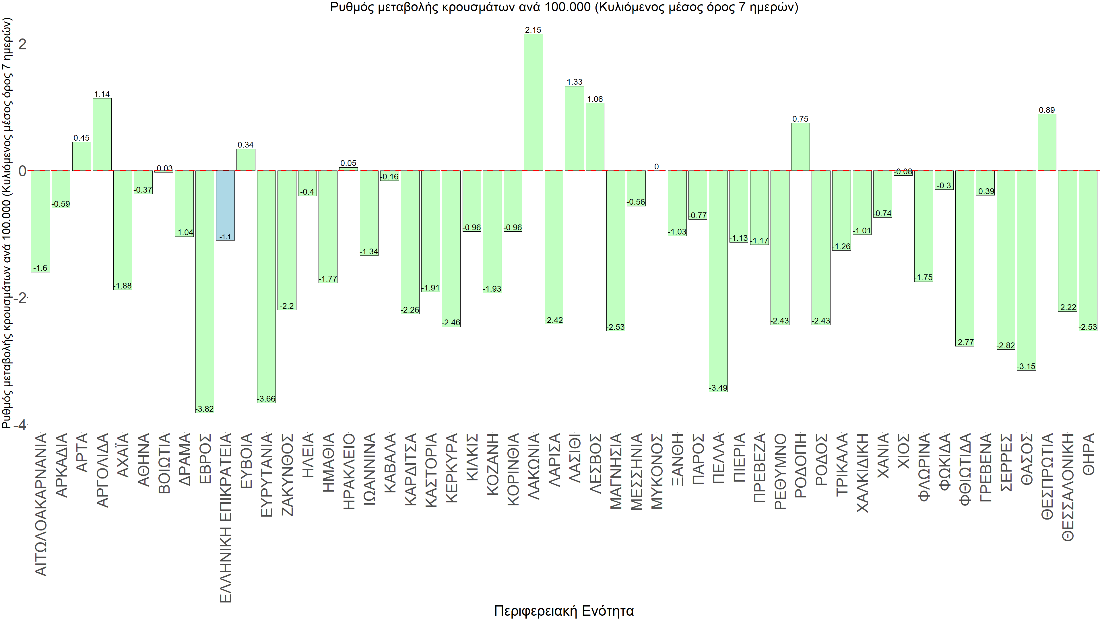 Η αποτύπωση των τάσεων στις επιμέρους περιοχές, παρουσιάζεται στο Σχήμα 61, όπου παρουσιάζεται ο ρυθμός μεταβολής των νέων κρουσμάτων ανά 100.000 κατοίκους (κυλιόμενος μέσος όρος 7 ημερών) των επιμέρους περιοχών. Θετικές τιμές του ρυθμού μεταβολής υποδηλώνουν άνοδο, ενώ αρνητικές τιμές υποδηλώνουν πτωτική πορεία. Το σχήμα αυτό είναι ιδιαίτερα κατατοπιστικό, γιατί οι τιμές που παρουσιάζονται είναι κανονικοποιημένες ως προς τον πληθυσμό, και η σύγκριση των τάσεων ανάμεσα στις επιμέρους περιοχές είναι άμεση.