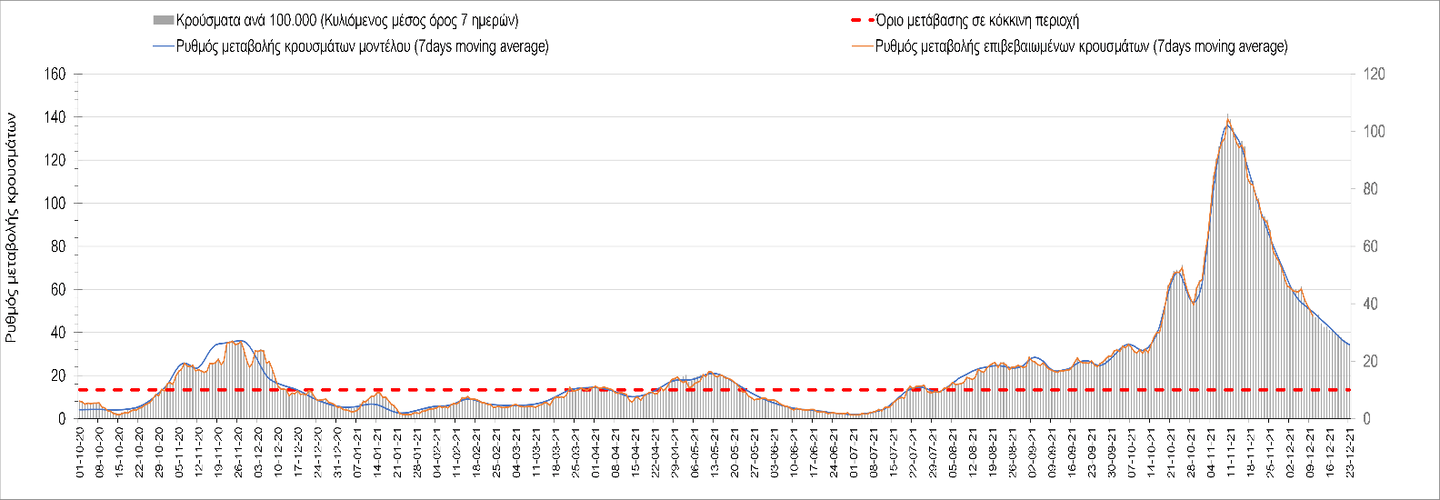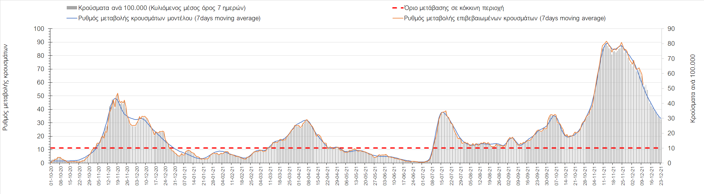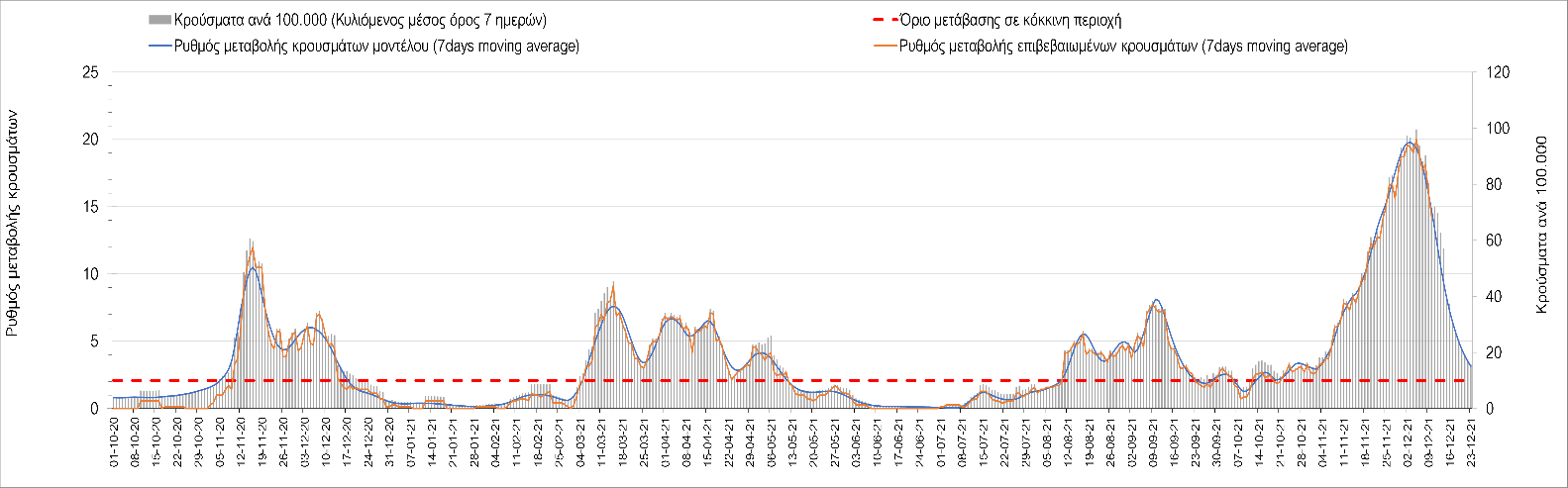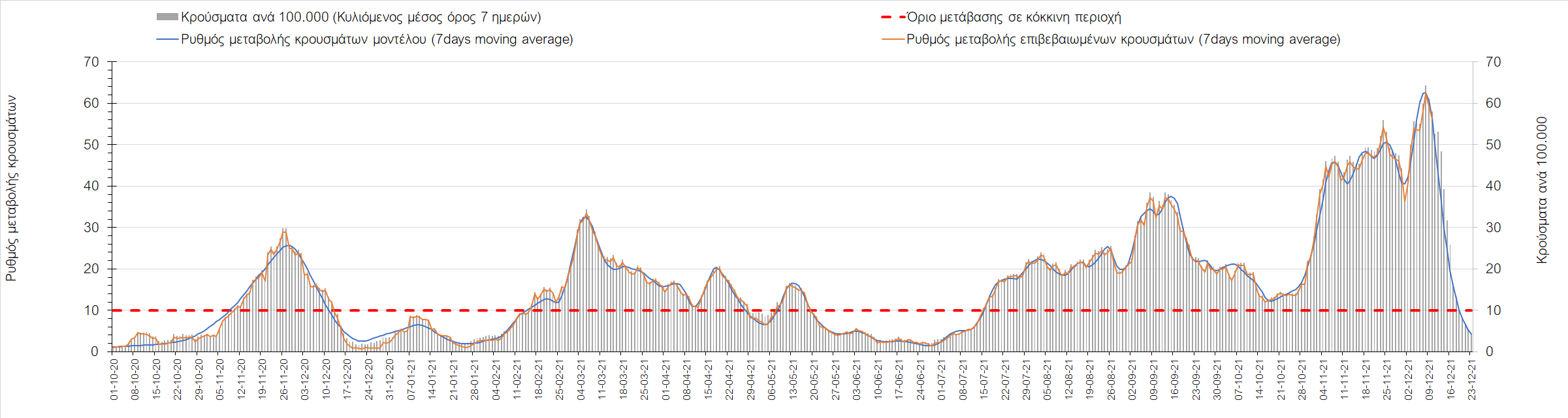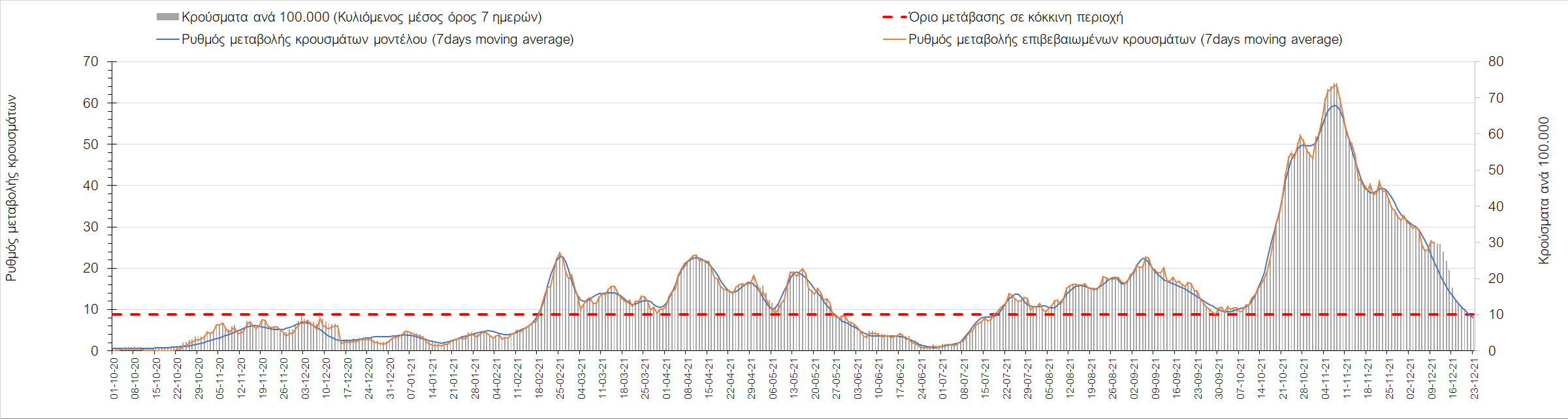 Η αποτύπωση των τάσεων στις επιμέρους περιοχές, παρουσιάζεται στο Σχήμα 61, όπου παρουσιάζεται ο ρυθμός μεταβολής των νέων κρουσμάτων ανά 100.000 κατοίκους (κυλιόμενος μέσος όρος 7 ημερών) των επιμέρους περιοχών. Θετικές τιμές του ρυθμού μεταβολής υποδηλώνουν άνοδο, ενώ αρνητικές τιμές υποδηλώνουν πτωτική πορεία. Το σχήμα αυτό είναι ιδιαίτερα κατατοπιστικό, γιατί οι τιμές που παρουσιάζονται είναι κανονικοποιημένες ως προς τον πληθυσμό, και η σύγκριση των τάσεων ανάμεσα στις επιμέρους περιοχές είναι άμεση.