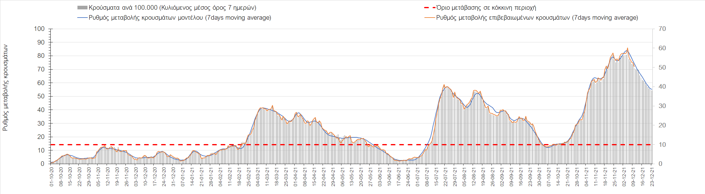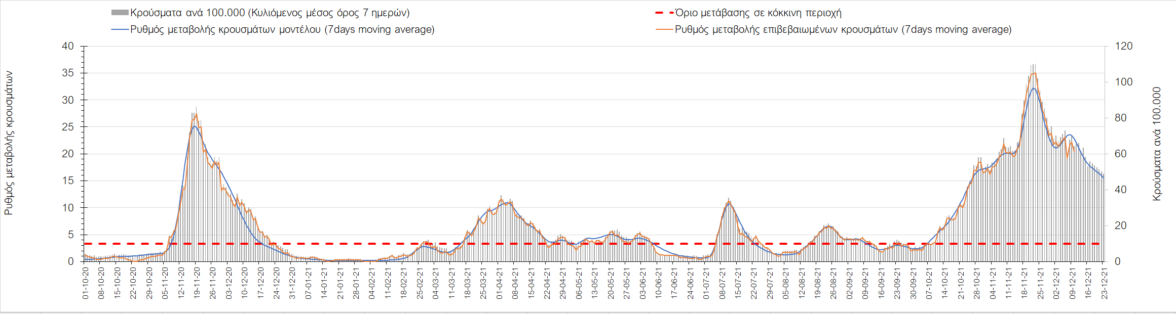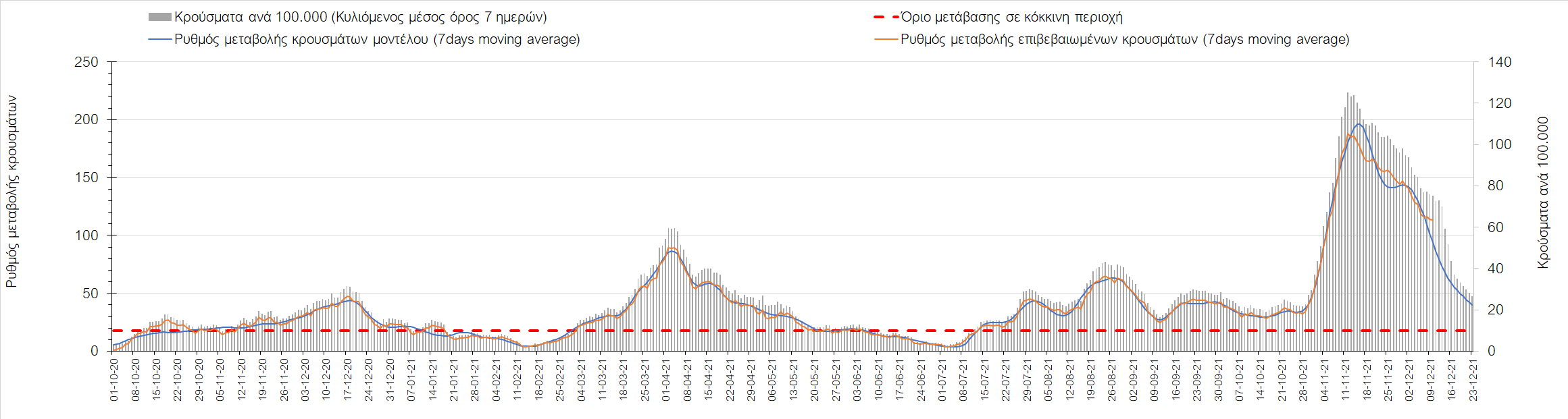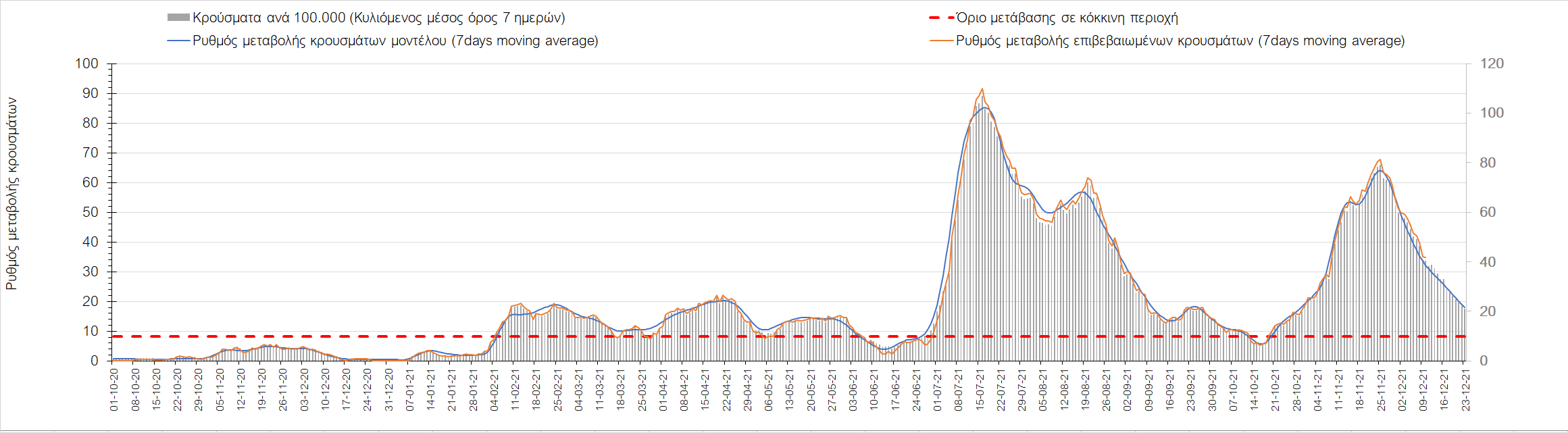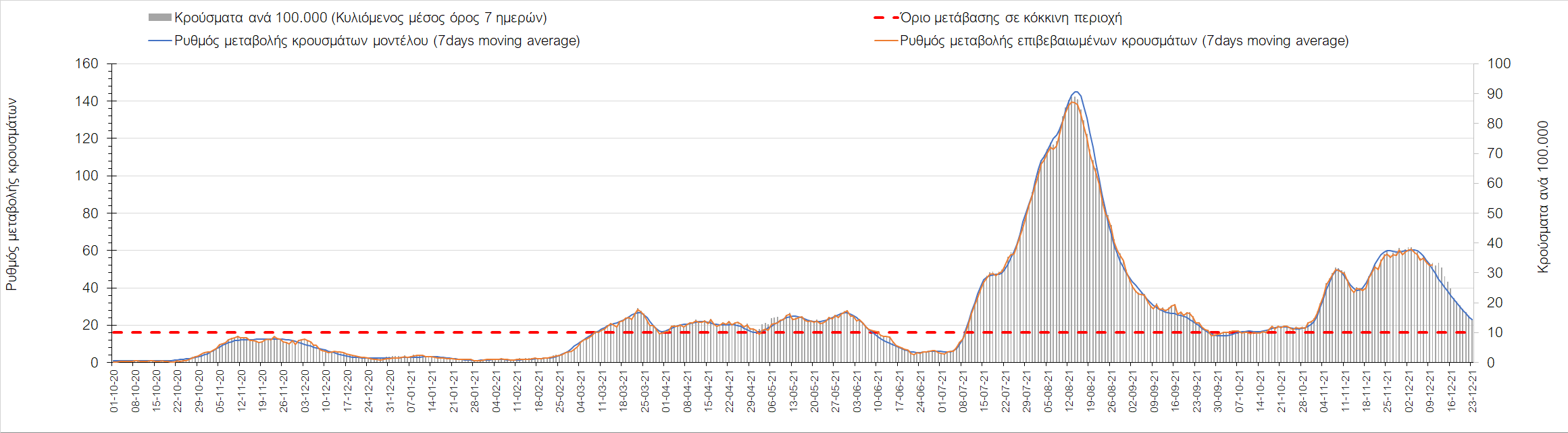 Η αποτύπωση των τάσεων στις επιμέρους περιοχές, παρουσιάζεται στο Σχήμα 61, όπου παρουσιάζεται ο ρυθμός μεταβολής των νέων κρουσμάτων ανά 100.000 κατοίκους (κυλιόμενος μέσος όρος 7 ημερών) των επιμέρους περιοχών. Θετικές τιμές του ρυθμού μεταβολής υποδηλώνουν άνοδο, ενώ αρνητικές τιμές υποδηλώνουν πτωτική πορεία. Το σχήμα αυτό είναι ιδιαίτερα κατατοπιστικό, γιατί οι τιμές που παρουσιάζονται είναι κανονικοποιημένες ως προς τον πληθυσμό, και η σύγκριση των τάσεων ανάμεσα στις επιμέρους περιοχές είναι άμεση.