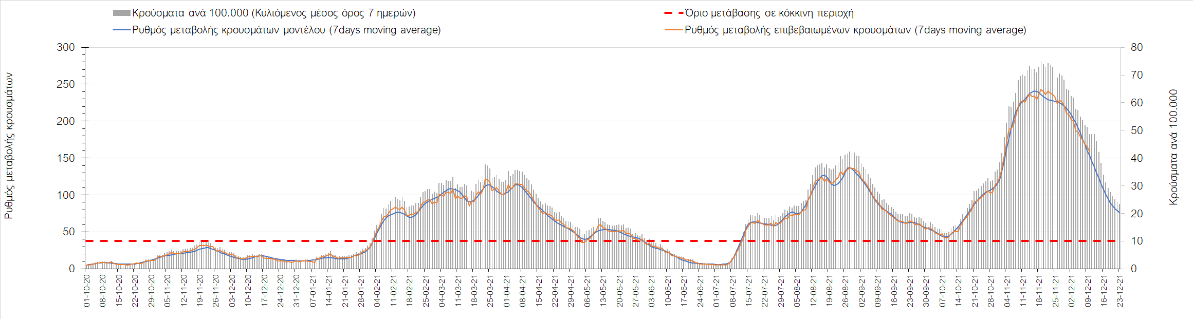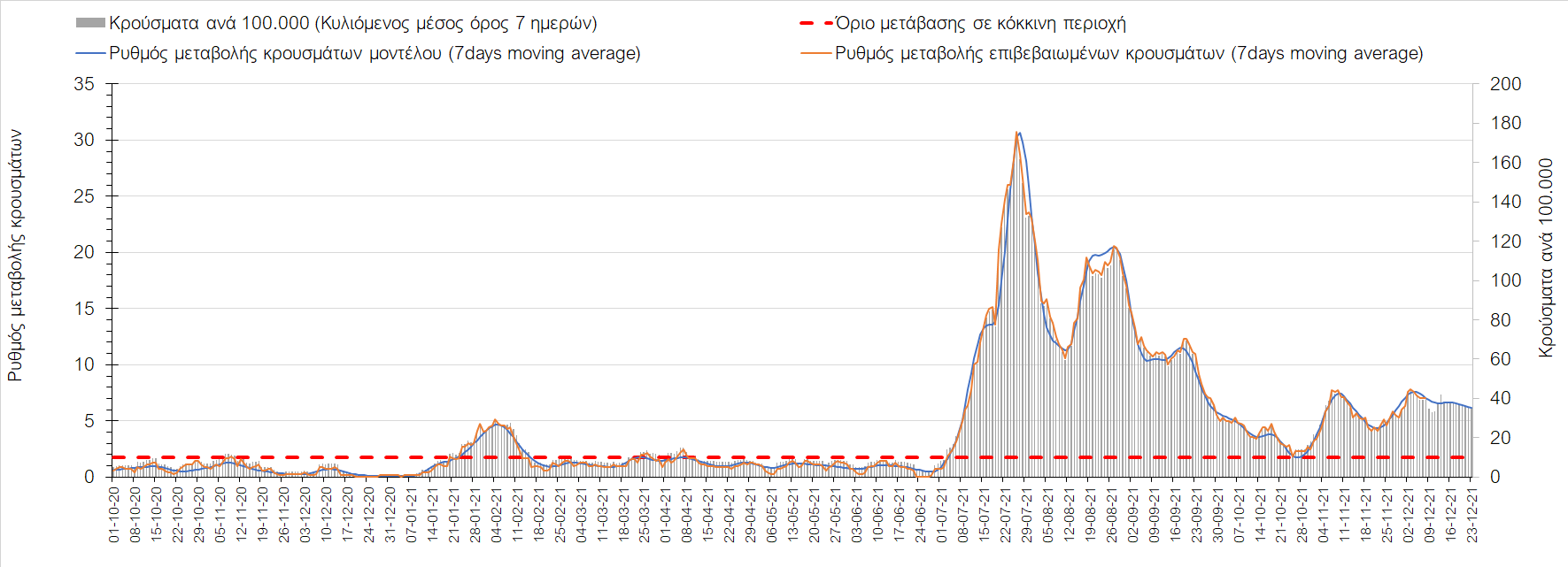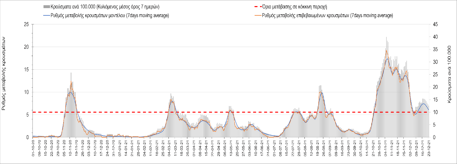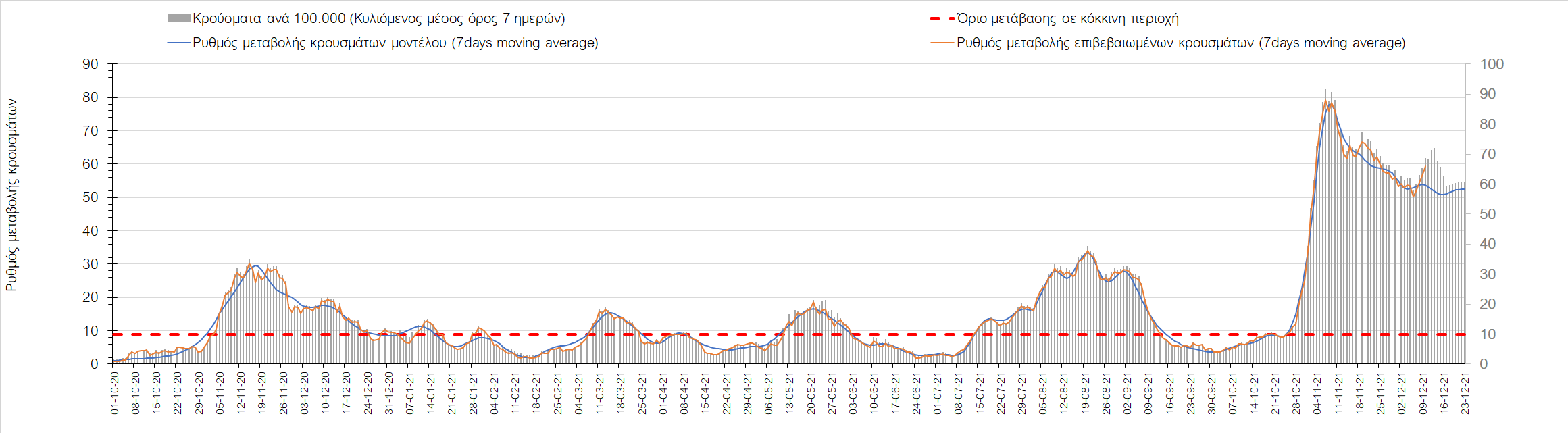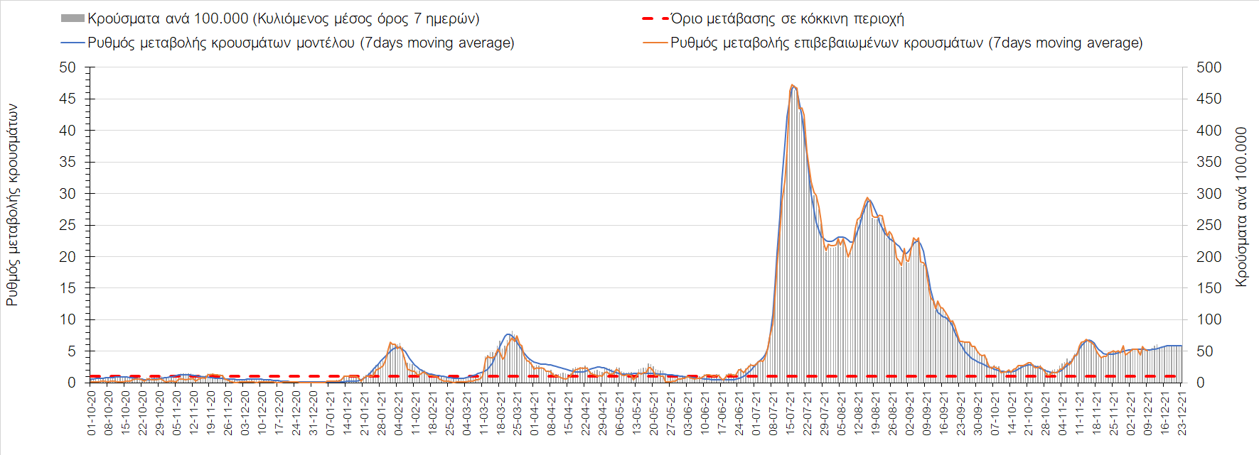 Η αποτύπωση των τάσεων στις επιμέρους περιοχές, παρουσιάζεται στο Σχήμα 61, όπου παρουσιάζεται ο ρυθμός μεταβολής των νέων κρουσμάτων ανά 100.000 κατοίκους (κυλιόμενος μέσος όρος 7 ημερών) των επιμέρους περιοχών. Θετικές τιμές του ρυθμού μεταβολής υποδηλώνουν άνοδο, ενώ αρνητικές τιμές υποδηλώνουν πτωτική πορεία. Το σχήμα αυτό είναι ιδιαίτερα κατατοπιστικό, γιατί οι τιμές που παρουσιάζονται είναι κανονικοποιημένες ως προς τον πληθυσμό, και η σύγκριση των τάσεων ανάμεσα στις επιμέρους περιοχές είναι άμεση.