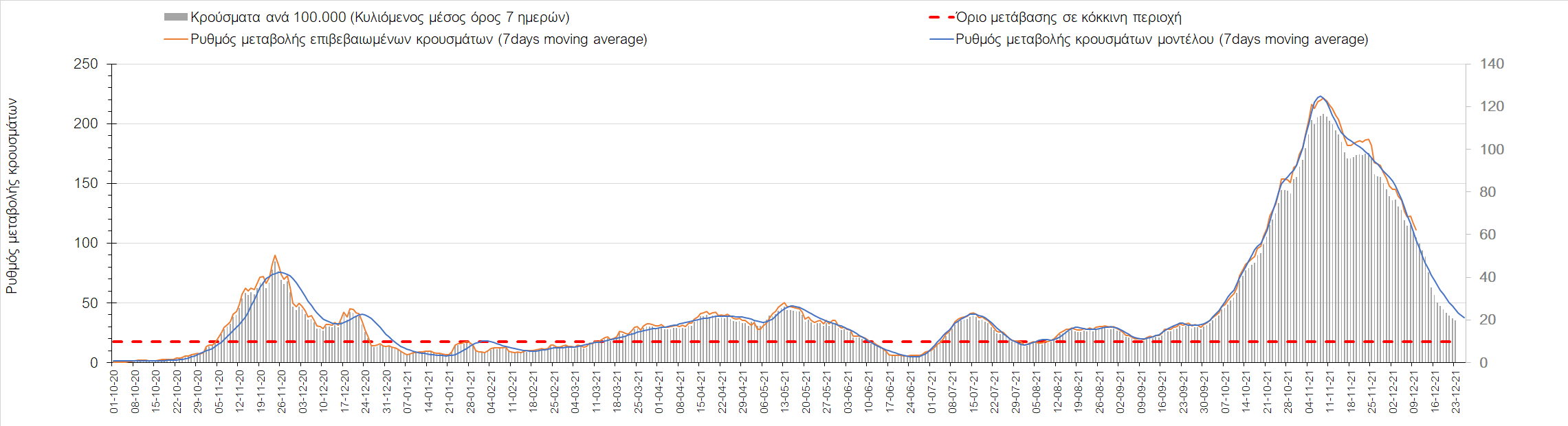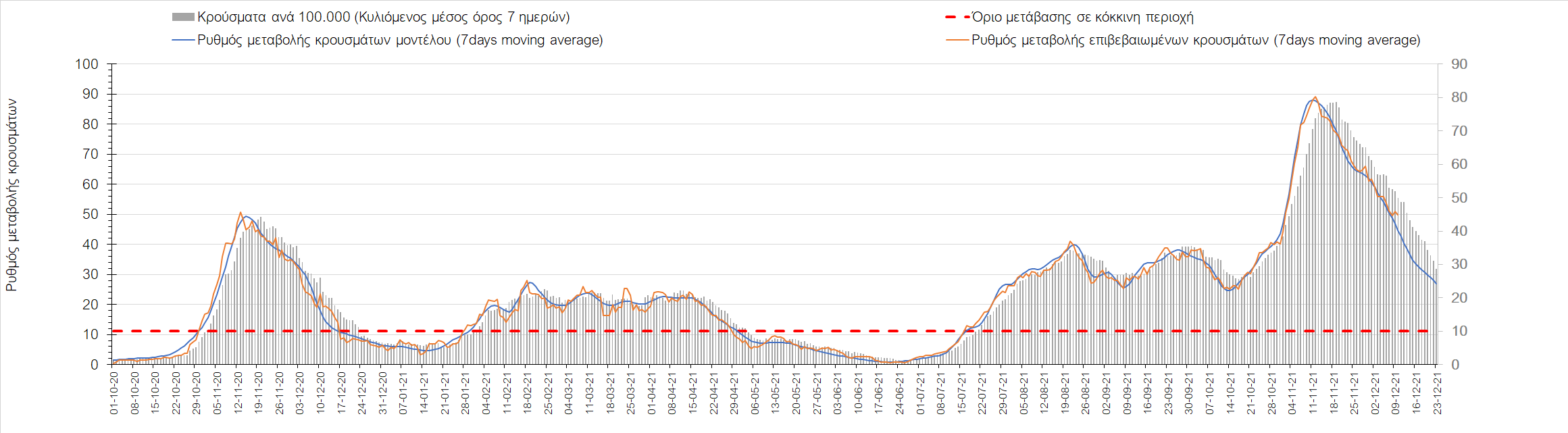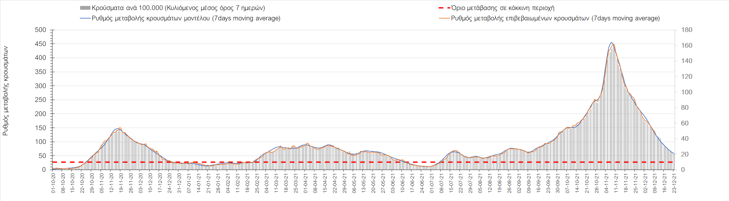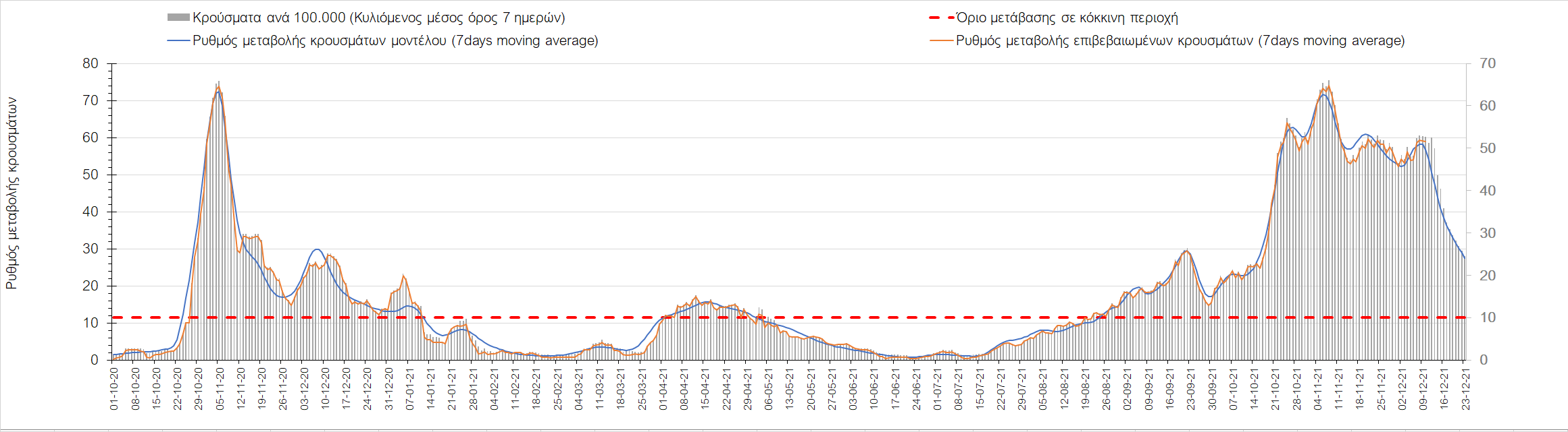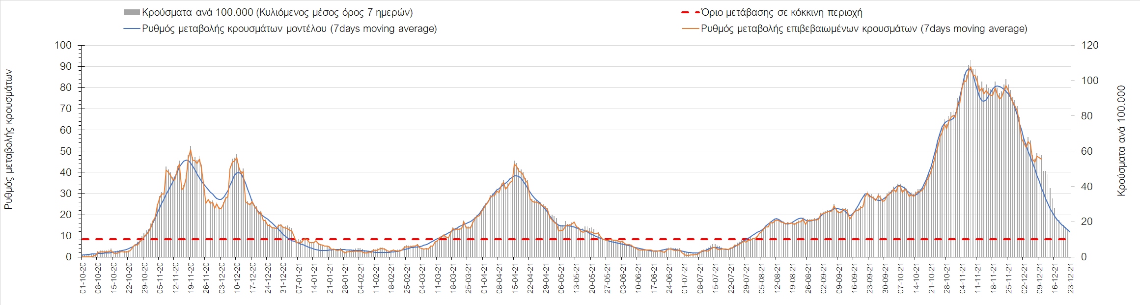 Η αποτύπωση των τάσεων στις επιμέρους περιοχές, παρουσιάζεται στο Σχήμα 61, όπου παρουσιάζεται ο ρυθμός μεταβολής των νέων κρουσμάτων ανά 100.000 κατοίκους (κυλιόμενος μέσος όρος 7 ημερών) των επιμέρους περιοχών. Θετικές τιμές του ρυθμού μεταβολής υποδηλώνουν άνοδο, ενώ αρνητικές τιμές υποδηλώνουν πτωτική πορεία. Το σχήμα αυτό είναι ιδιαίτερα κατατοπιστικό, γιατί οι τιμές που παρουσιάζονται είναι κανονικοποιημένες ως προς τον πληθυσμό, και η σύγκριση των τάσεων ανάμεσα στις επιμέρους περιοχές είναι άμεση.