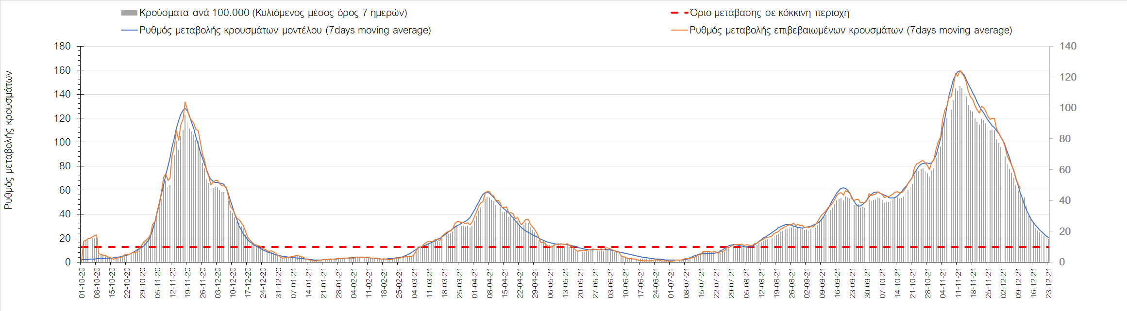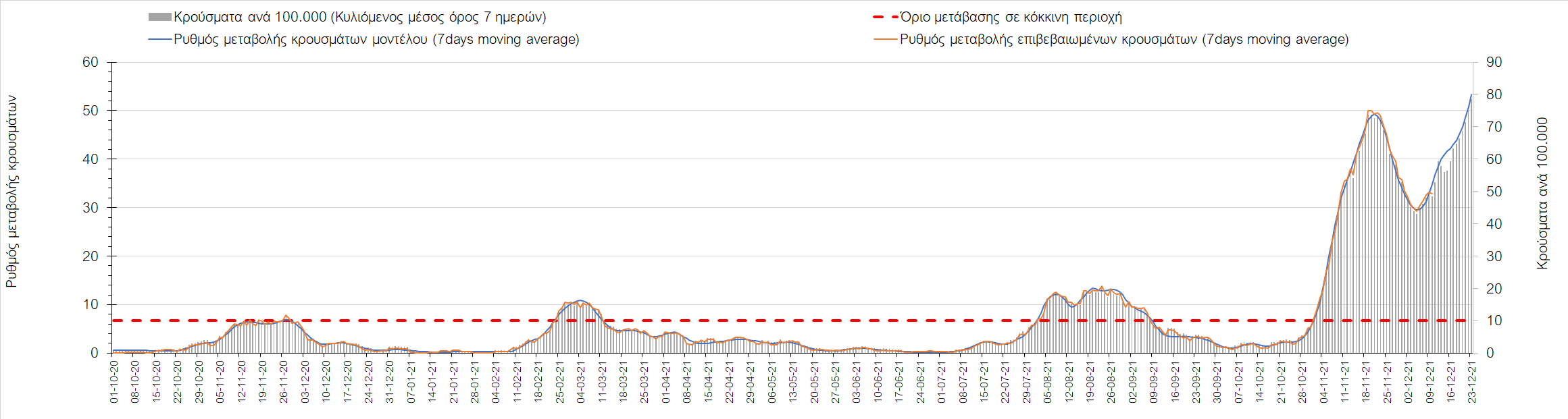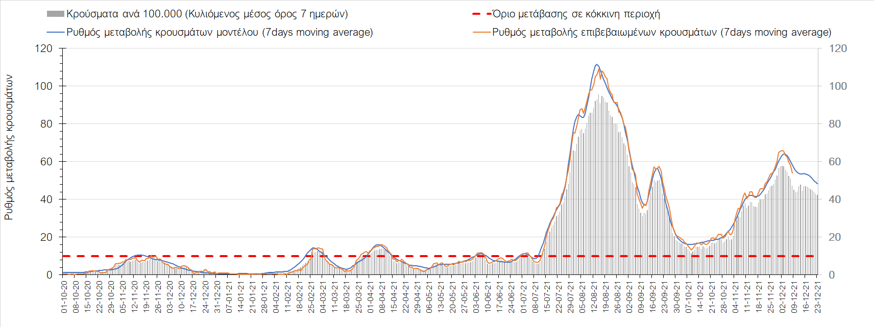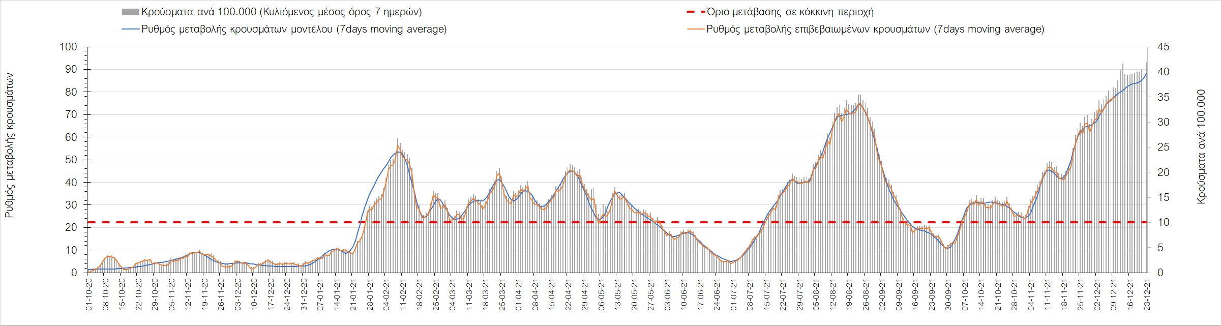 Η αποτύπωση των τάσεων στις επιμέρους περιοχές, παρουσιάζεται στο Σχήμα 61, όπου παρουσιάζεται ο ρυθμός μεταβολής των νέων κρουσμάτων ανά 100.000 κατοίκους (κυλιόμενος μέσος όρος 7 ημερών) των επιμέρους περιοχών. Θετικές τιμές του ρυθμού μεταβολής υποδηλώνουν άνοδο, ενώ αρνητικές τιμές υποδηλώνουν πτωτική πορεία. Το σχήμα αυτό είναι ιδιαίτερα κατατοπιστικό, γιατί οι τιμές που παρουσιάζονται είναι κανονικοποιημένες ως προς τον πληθυσμό, και η σύγκριση των τάσεων ανάμεσα στις επιμέρους περιοχές είναι άμεση.