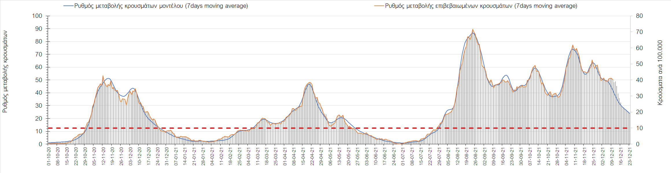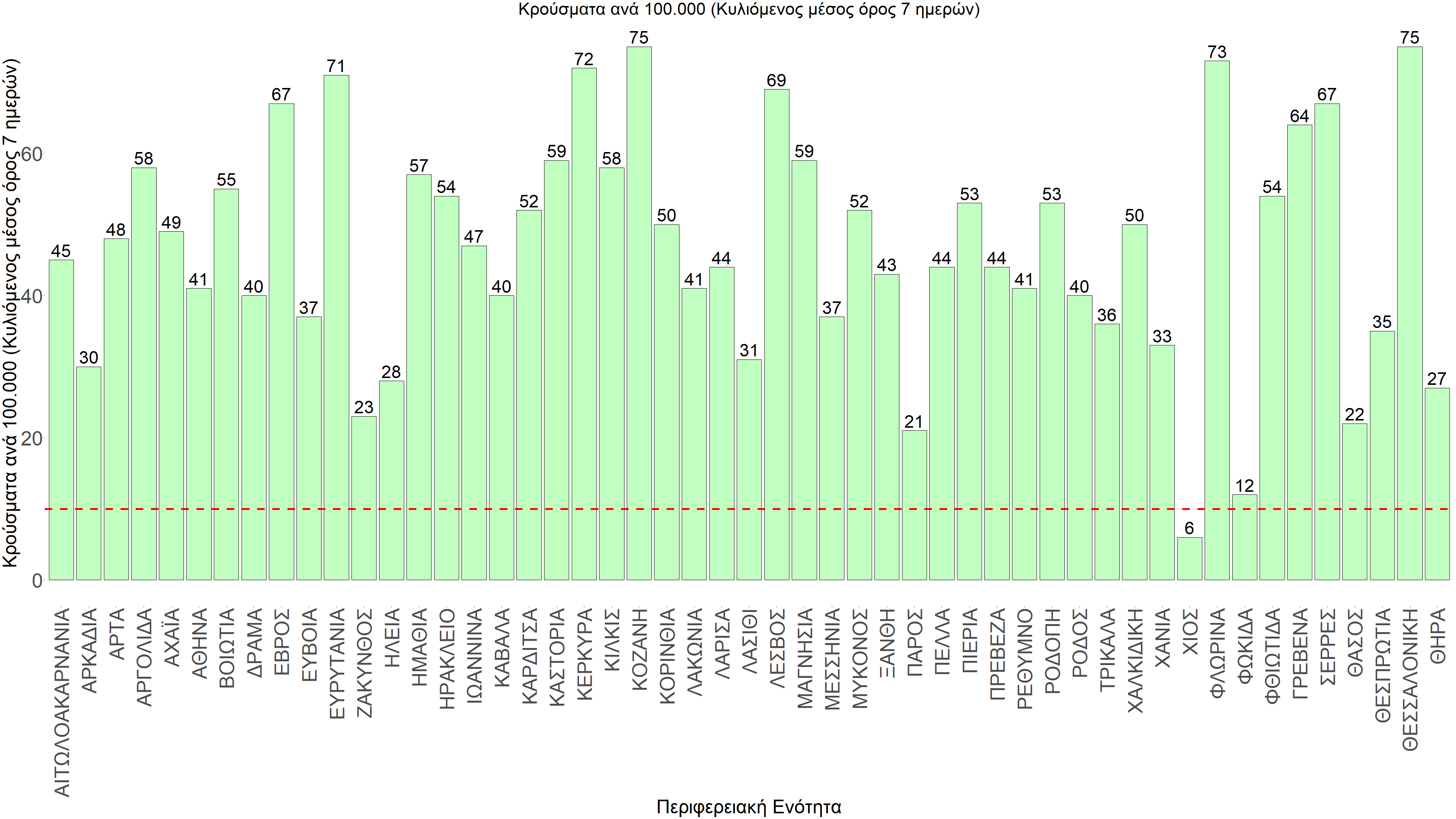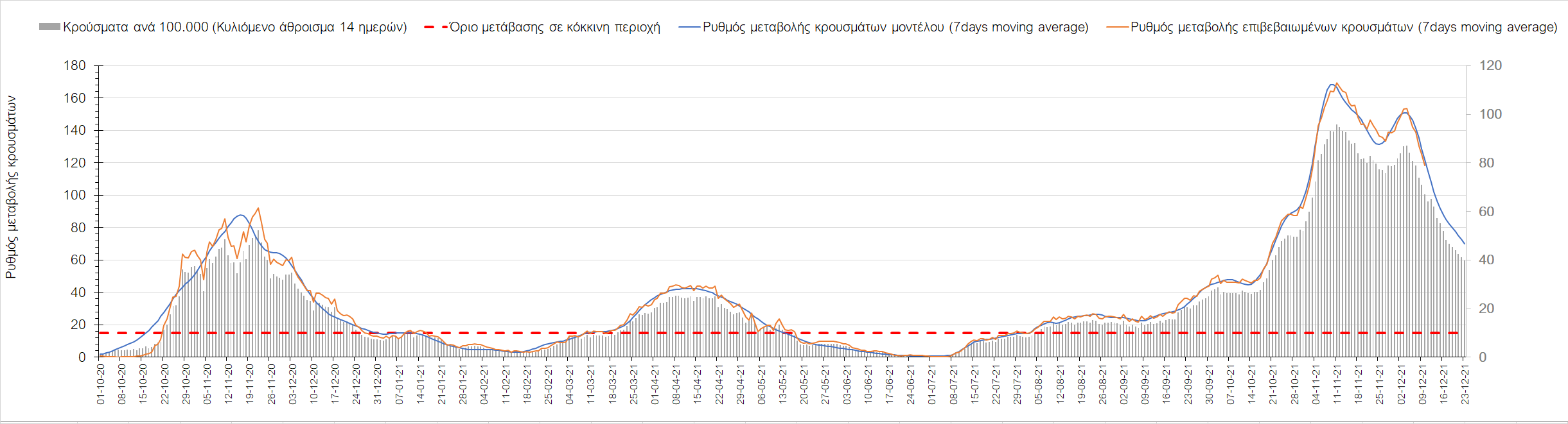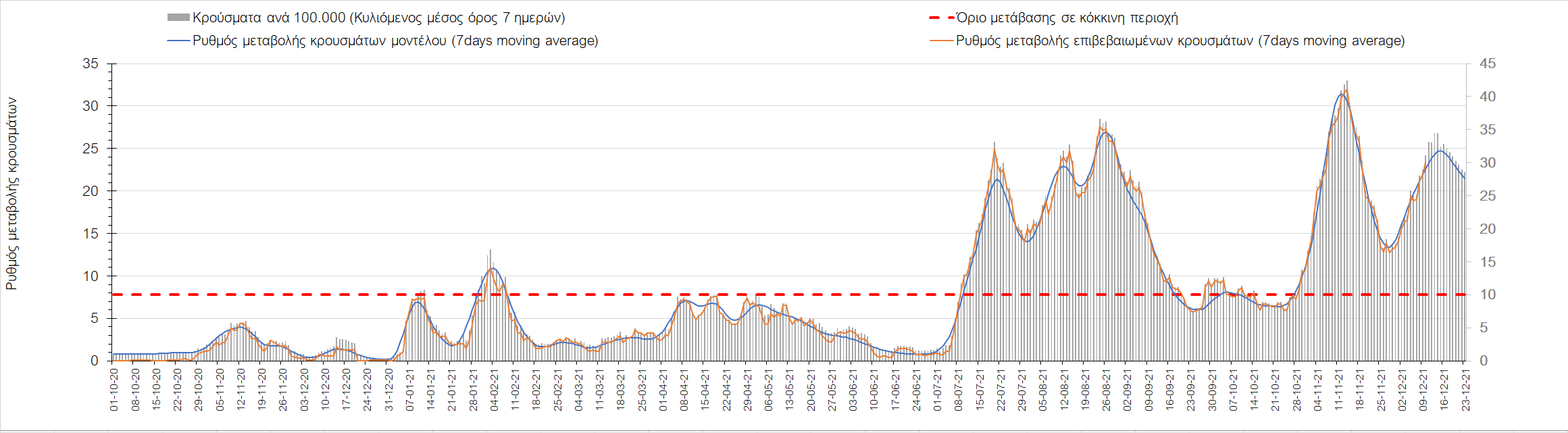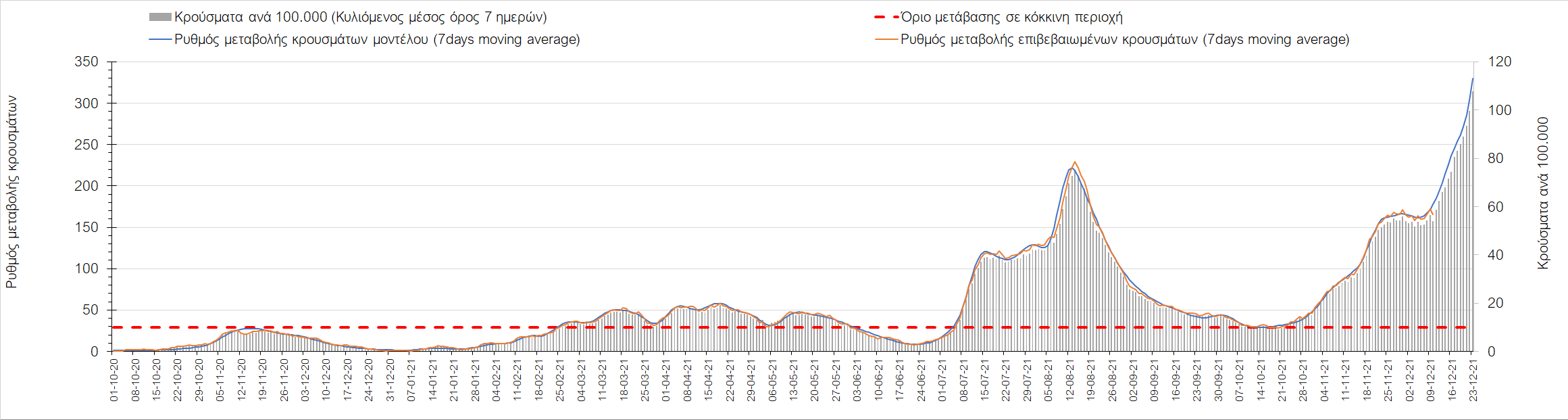 Η αποτύπωση των τάσεων στις επιμέρους περιοχές, παρουσιάζεται στο Σχήμα 61, όπου παρουσιάζεται ο ρυθμός μεταβολής των νέων κρουσμάτων ανά 100.000 κατοίκους (κυλιόμενος μέσος όρος 7 ημερών) των επιμέρους περιοχών. Θετικές τιμές του ρυθμού μεταβολής υποδηλώνουν άνοδο, ενώ αρνητικές τιμές υποδηλώνουν πτωτική πορεία. Το σχήμα αυτό είναι ιδιαίτερα κατατοπιστικό, γιατί οι τιμές που παρουσιάζονται είναι κανονικοποιημένες ως προς τον πληθυσμό, και η σύγκριση των τάσεων ανάμεσα στις επιμέρους περιοχές είναι άμεση.