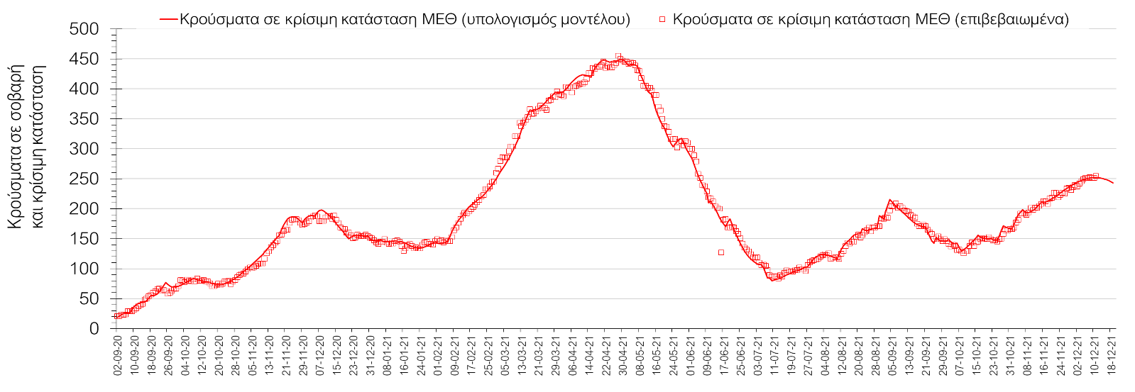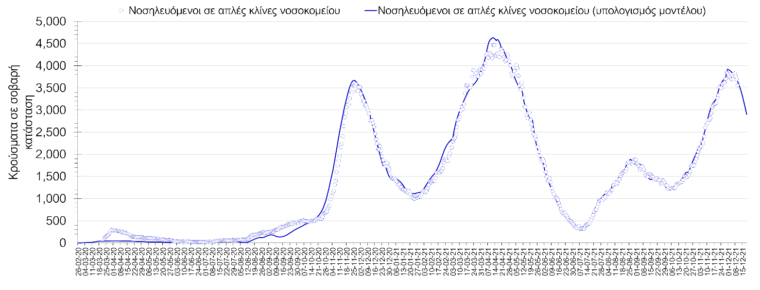 Η πορεία της μέσης εβδομαδιαίας τιμής των κρουσμάτων, καθώς και του κυλιόμενου μέσου όρου 7 ημερών του αριθμού των κρουσμάτων ανά 100.000 πληθυσμού, όπως έχουν καταγραφεί από τον ΕΟΔΥ και η αναμενόμενη πορεία τους όπως προδιαγράφεται από την υπολογιστική πλατφόρμα CORE για την Ελληνική επικράτεια μέχρι τις 15 Δεκεμβρίου, αποτυπώνονται στο Σχήμα 4. Αυτή η προβλεπόμενη πορεία, που αφορά τα κρούσματα, τους νοσηλευόμενους σε απλές κλίνες, όσο και σε ΜΕΘ, καθώς επίσης και τους θανάτους, βασίζεται στις ακόλουθες παραδοχές: