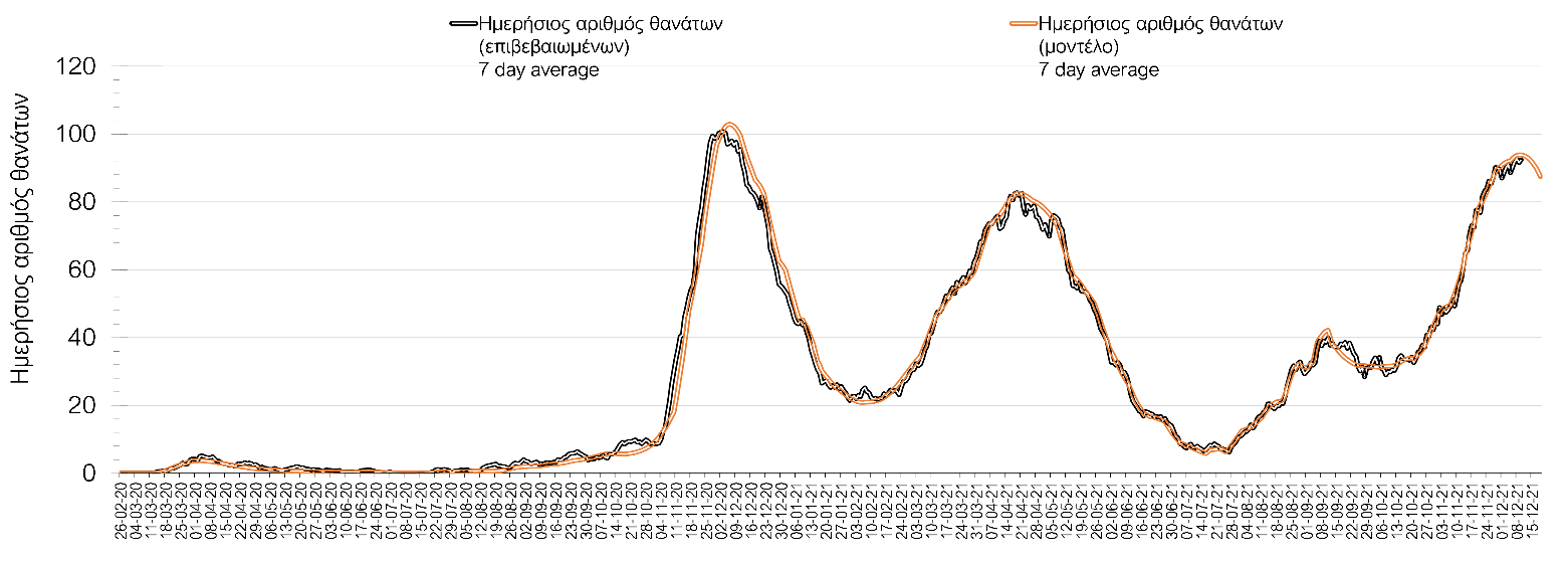 Ο αριθμός ημερήσιων θανάτων (103) που καταγράφηκε την Παρασκευή είναι σημαντικά αυξημένος σε σχέση με την Πέμπτη (81). Όπως είχαμε προβλέψει ο κυλιόμενος εβδομαδιαίος μέσος όρος που την Παρασκευή είναι 92,9 ακολουθεί πλέον την πορεία του αριθμού των ασθενών σε κρίσιμη κατάσταση.