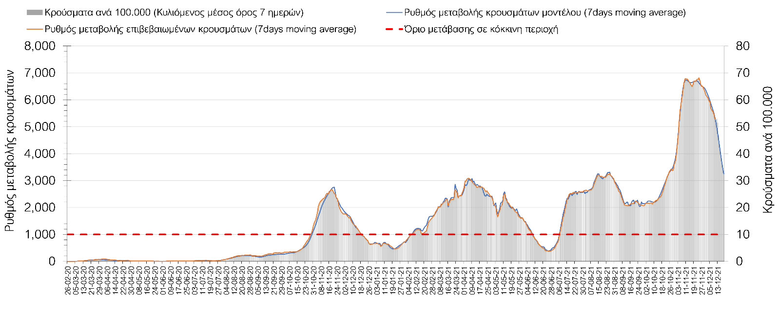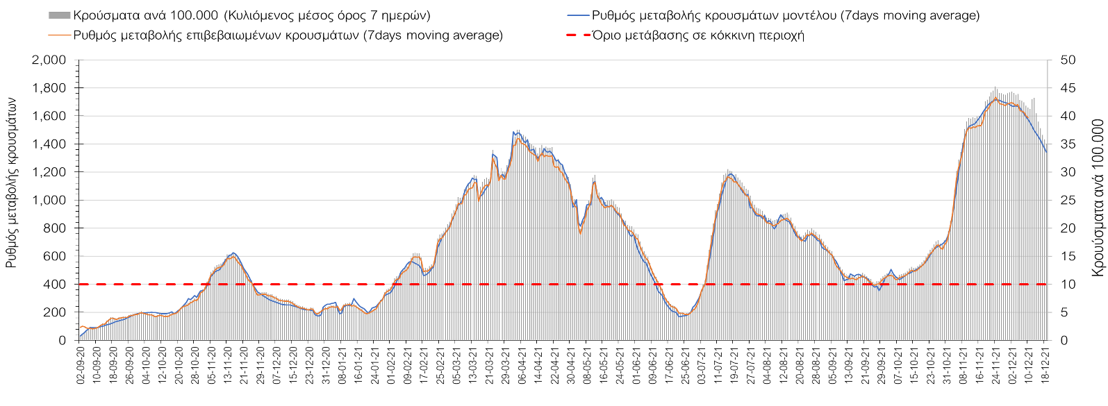 Σχήμα 4. Πορεία του ημερησίου αριθμού των κρουσμάτων (κυλιόμενος μέσος όρος 7 ημερών) στην Ελληνική επικράτεια