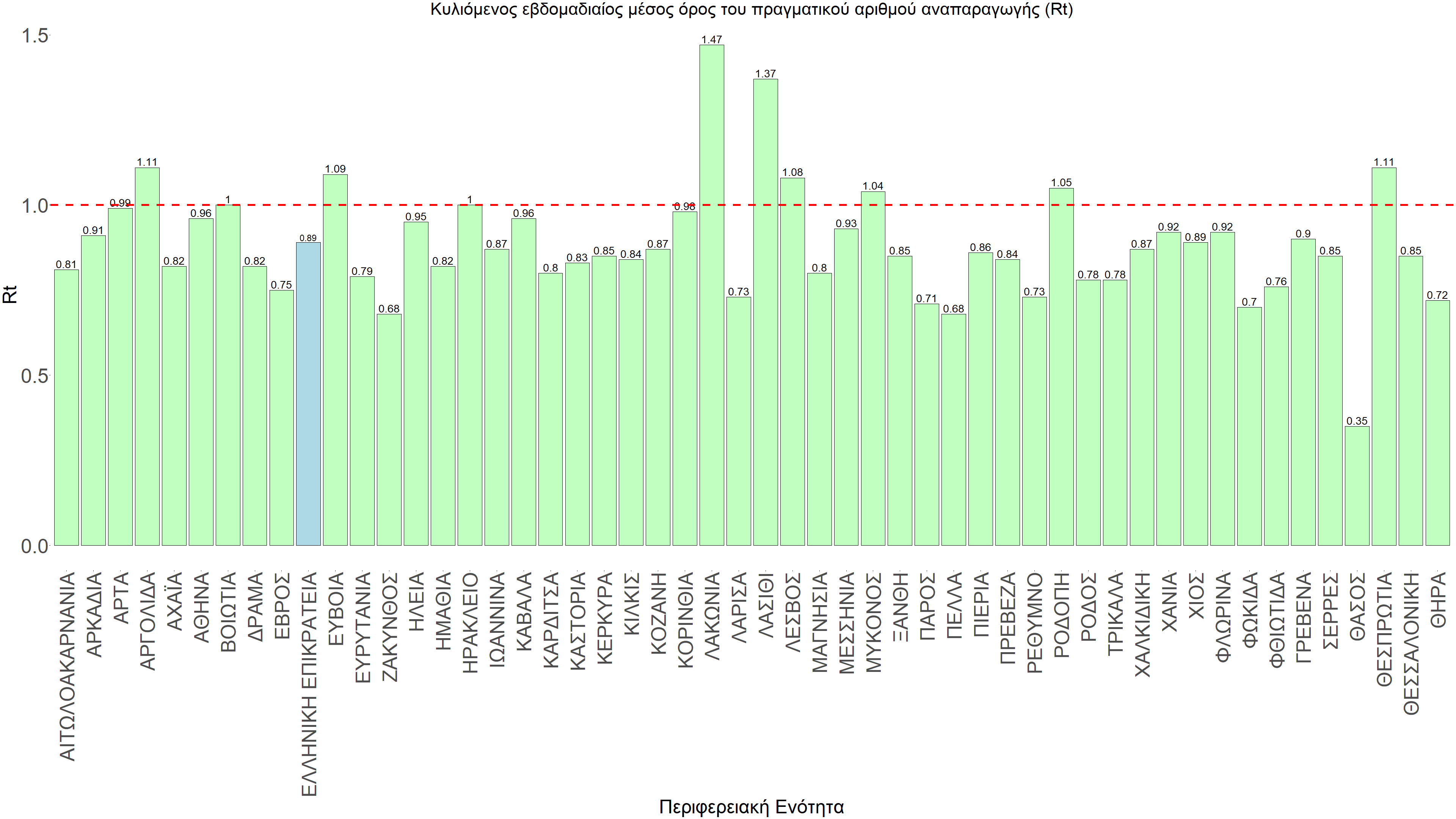 O πραγματικός αριθμός αναπαραγωγής Rt ανά περιφερειακή ενότητα της χώρας παρουσιάζεται στο Σχήμα 58.