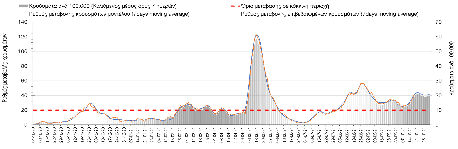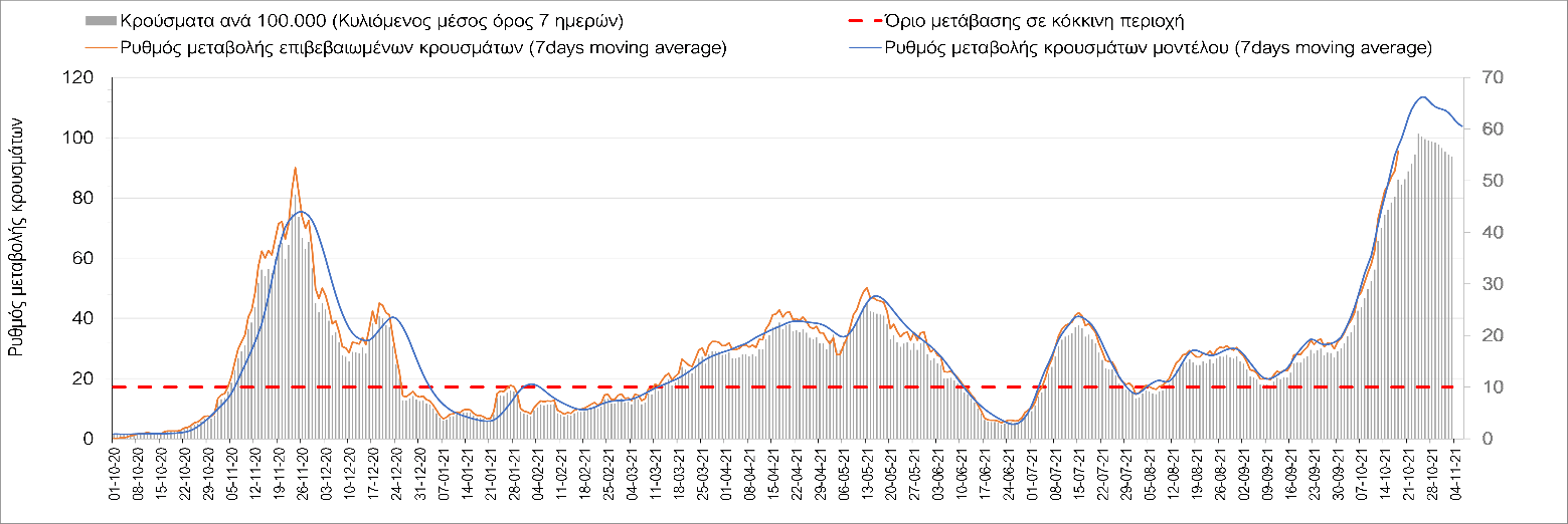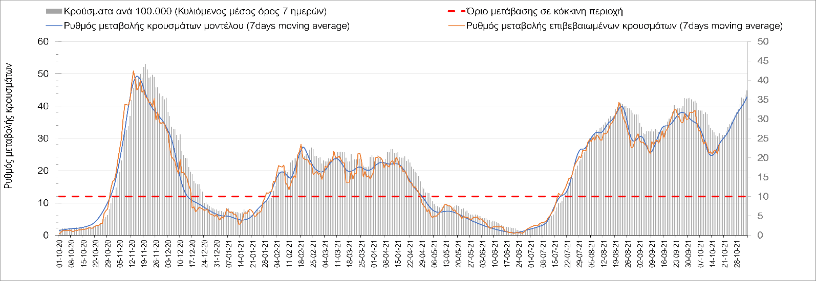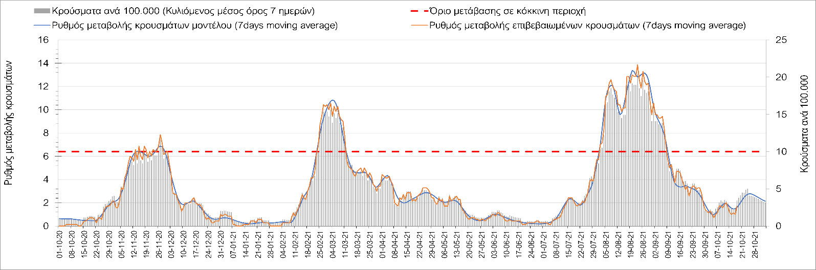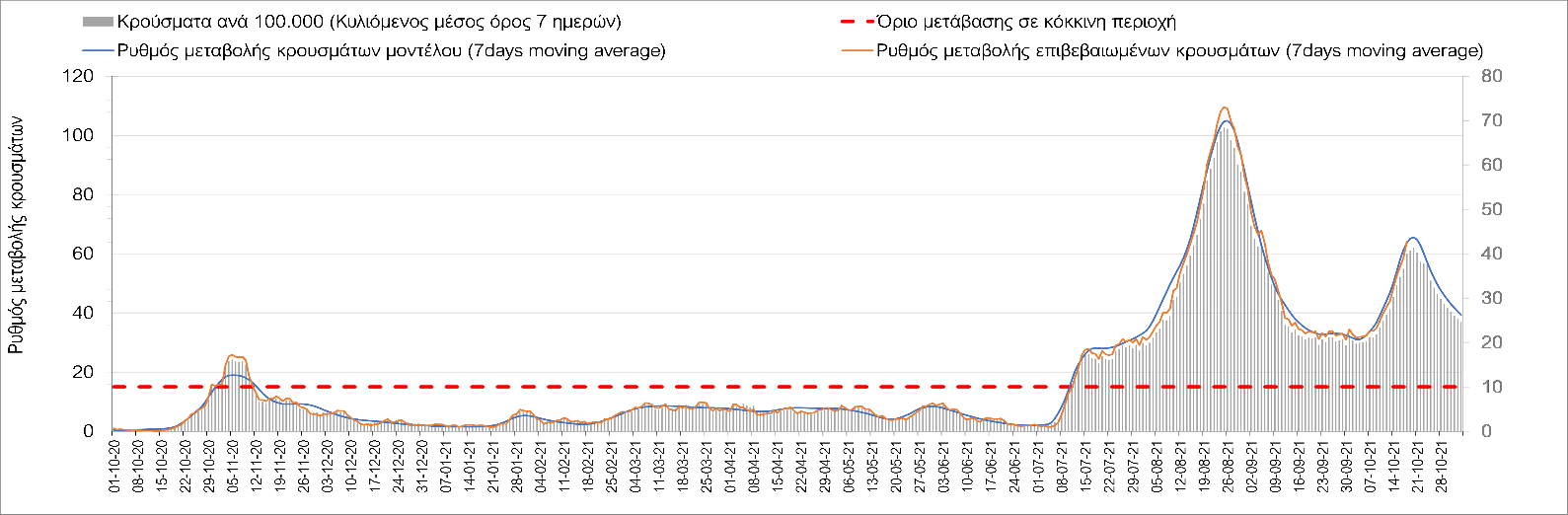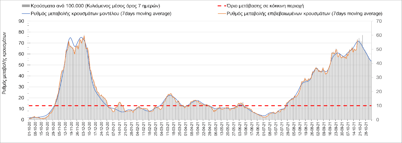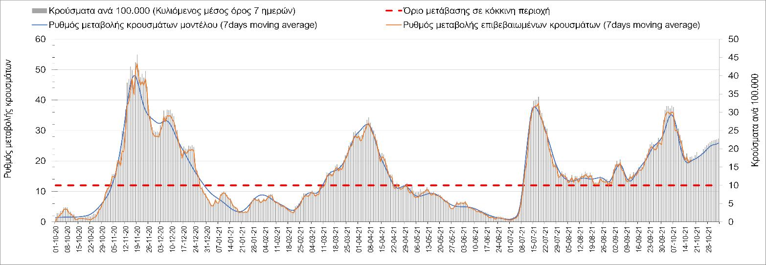 Συμπεράσματα: Με βάση τα σημερινά αποτελέσματα, σε σχέση με την Κυριακή, έχουμε μείωση του αριθμού των ασθενών σε κρίσιμη κατάσταση (διασωληνωμένοι σε ΜΕΘ), και σημαντική αύξηση των θανάτων. Σε πανελλαδικό επίπεδο ο κυλιόμενος εβδομαδιαίος μέσος όρος του δείκτη θετικότητας διαμορφώθηκε στο 1,7% (η ημερήσια τιμή είναι 4,2 %) ενώ ο κυλιόμενος εβδομαδιαίος μέσος όρος του πραγματικού αριθμού αναπαραγωγής Rt (δηλαδή ο αριθμός των ατόμων που ένας φορέας μπορεί να επιμολύνει) αυξήθηκε σημαντικά στο 1,12 (Rt πάνω από τη μονάδα υποδηλώνει καθαρή αύξηση της διασποράς του ιού στην κοινότητα). Συνολικά η κυμαινόμενη τάση των τελευταίων ημερών αντικατοπτρίζεται και από τον ημερήσιο αριθμό των κρουσμάτων (κυλιόμενος μέσος όρος 7 ημερών), ο οποίος ξεπέρασε τα 2500 (2551). Γενικά την τελευταία εβδομάδα η ήπια αύξηση του αριθμού κρουσμάτων (κυλιόμενος μέσος όρος 7 ημερών) φαίνεται να μεταβαίνει σε λίγο εντονότερο ρυθμό ανόδου, τον οποίο αναμέναμε μετά τα μέσα Οκτώβρη.